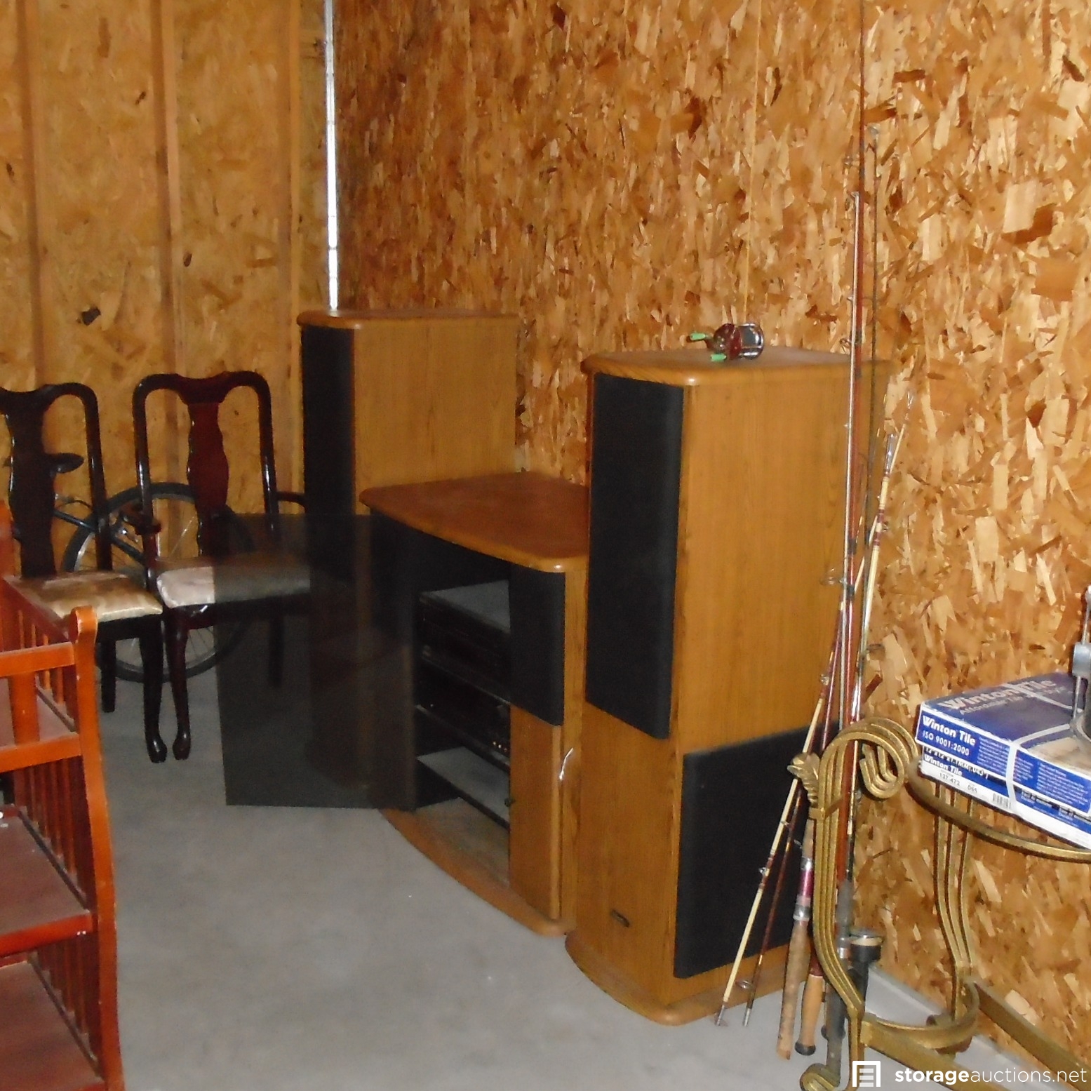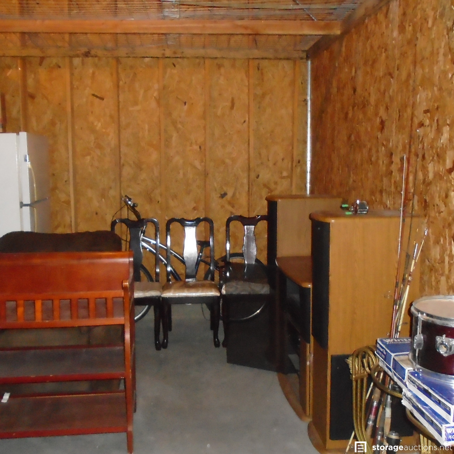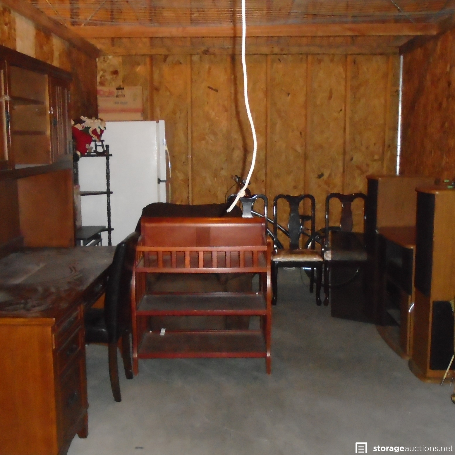 Unit appears to contain baby changing station, several different shelfs, bicycle, refrigerator, fishing poles, stereo system, large desk, chairs