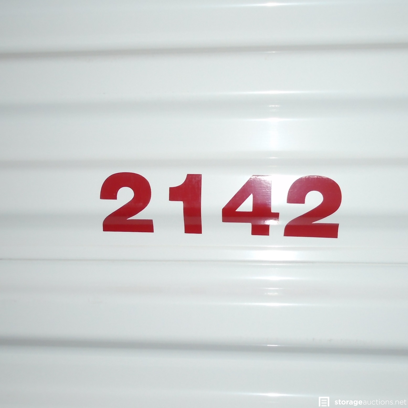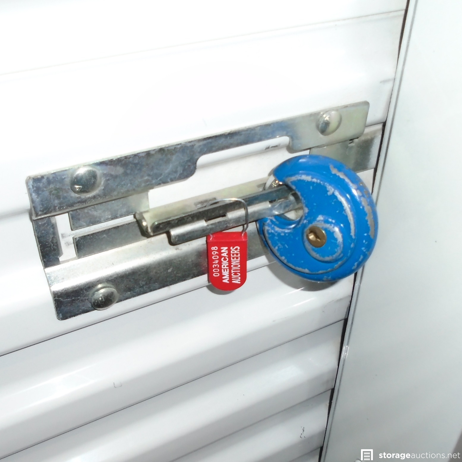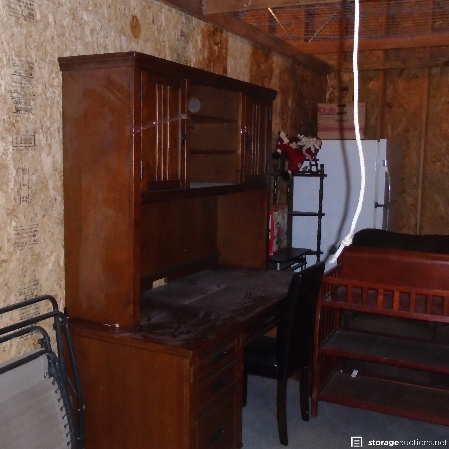 Unit appears to contain baby changing station, several different shelfs, bicycle, refrigerator, fishing poles, stereo system, large desk, chairs