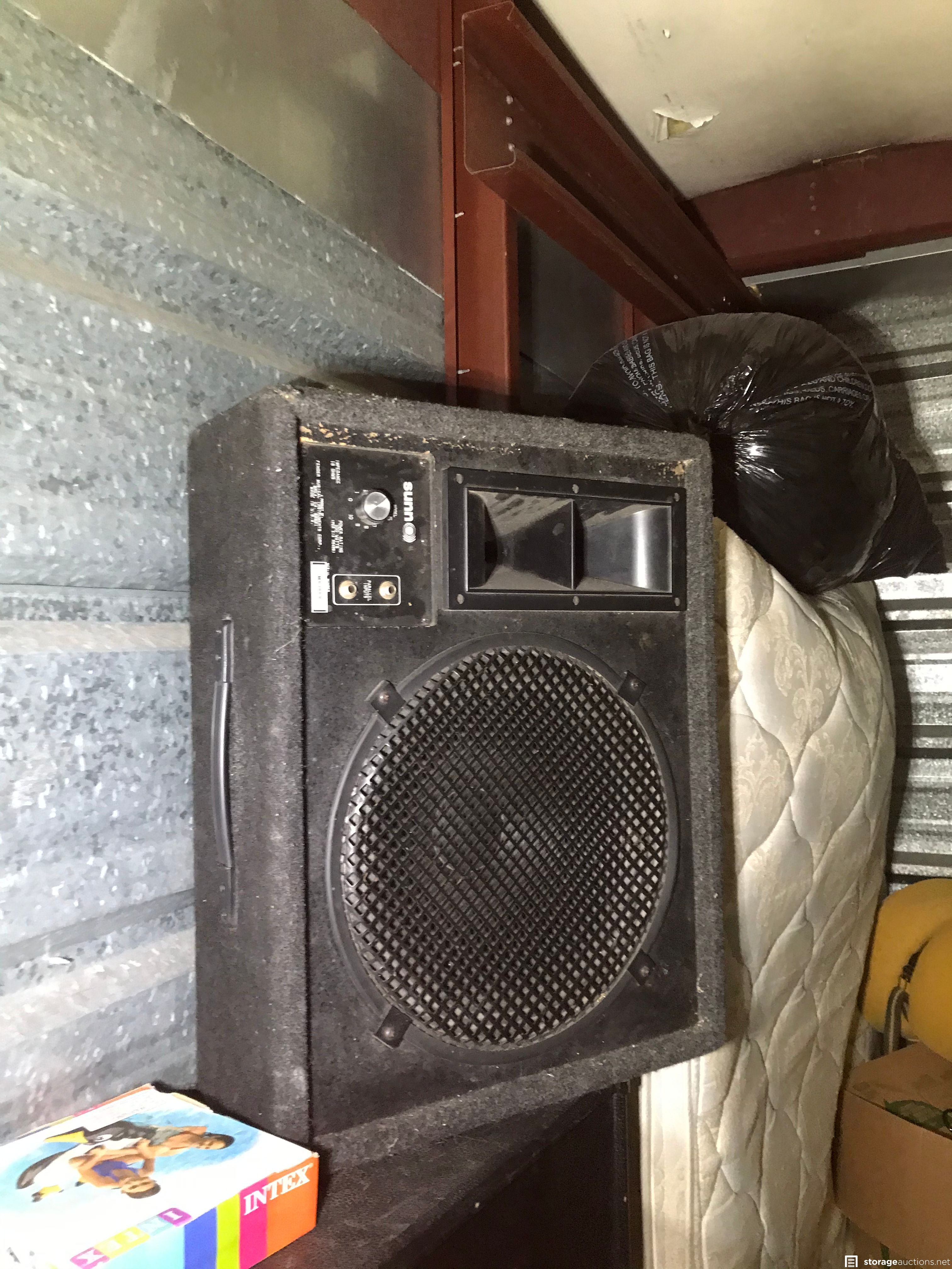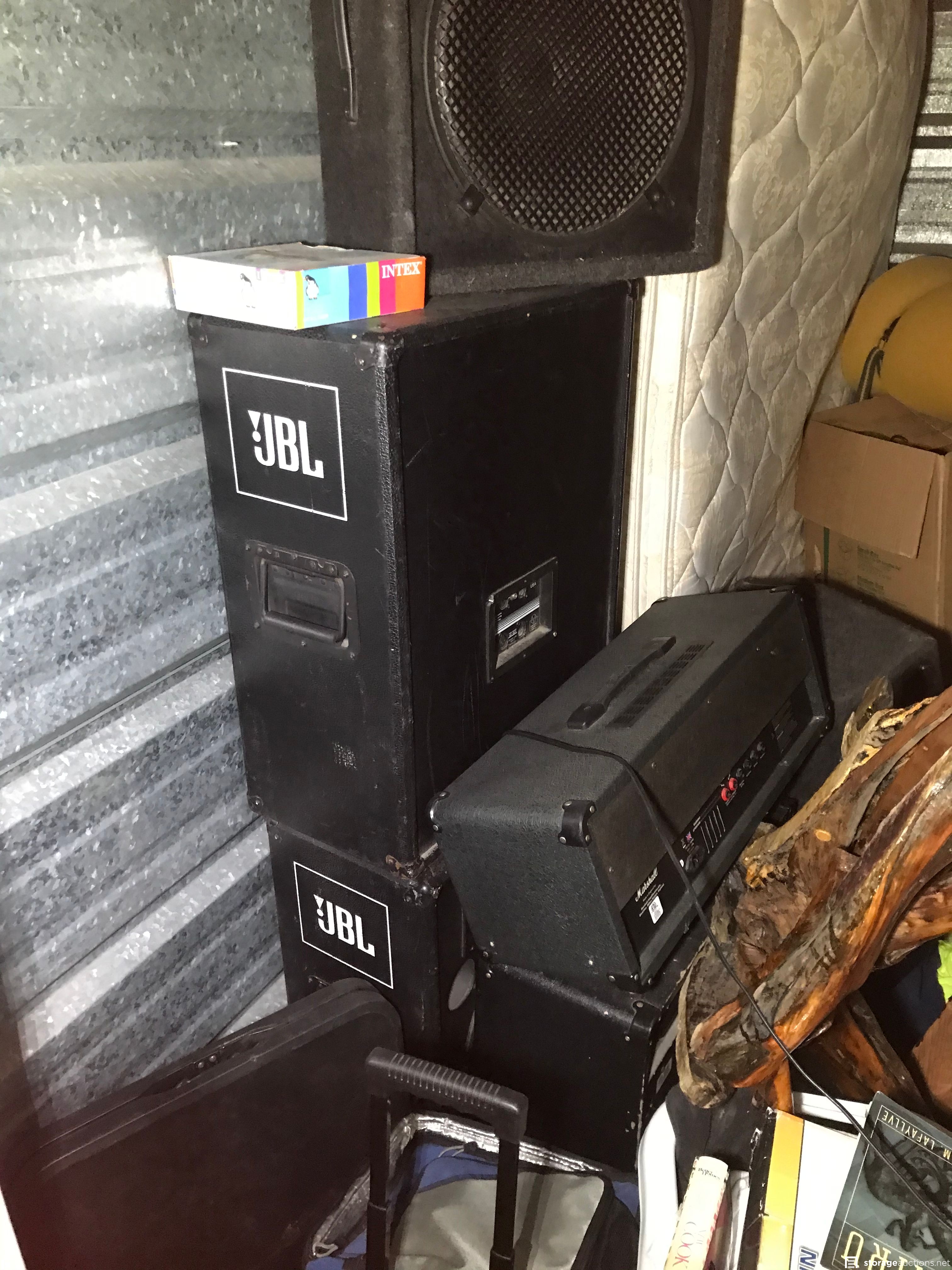 JBL speakers, boxes, totes, wood table, bags, art, mattress