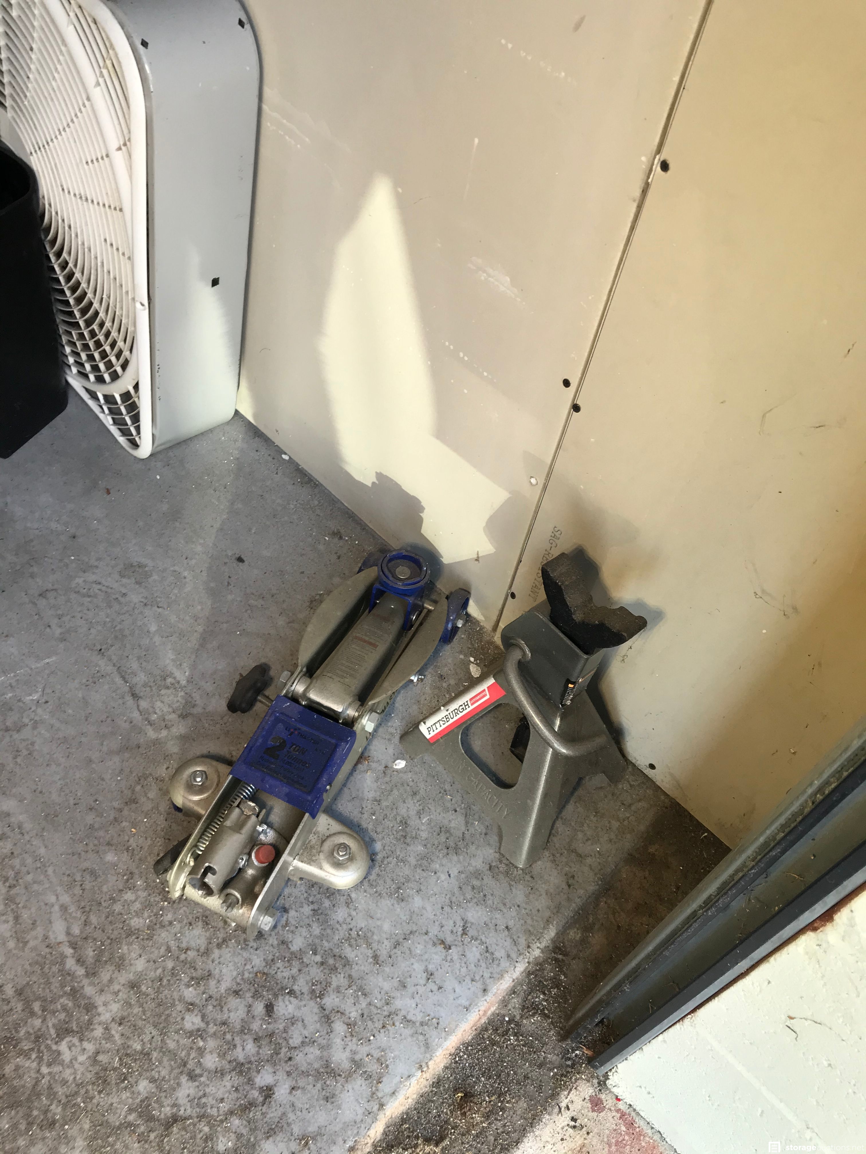 Night stand, floor jacks, husky tools, couch, floor lamps