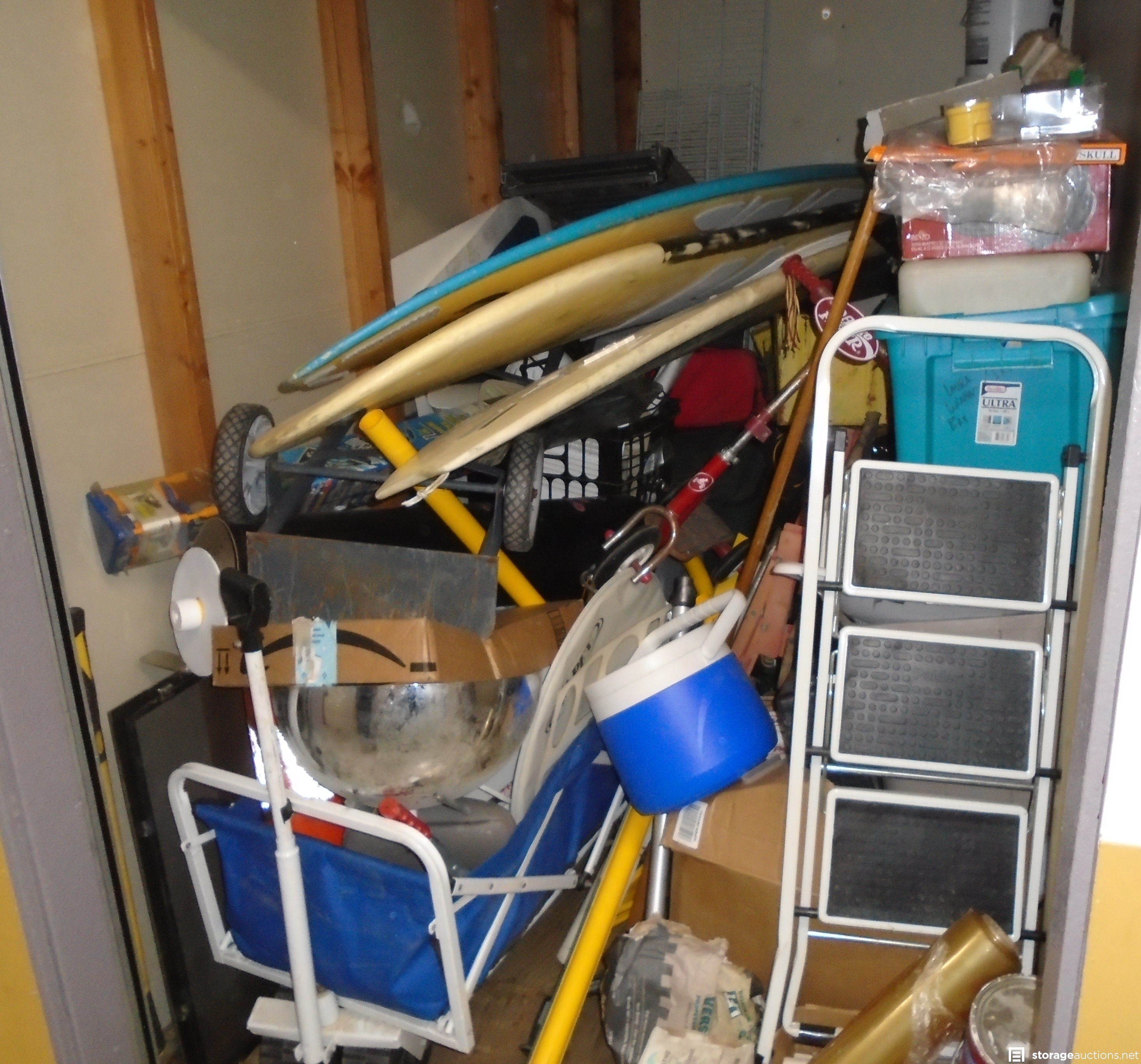 surf boards, boxes, ladder