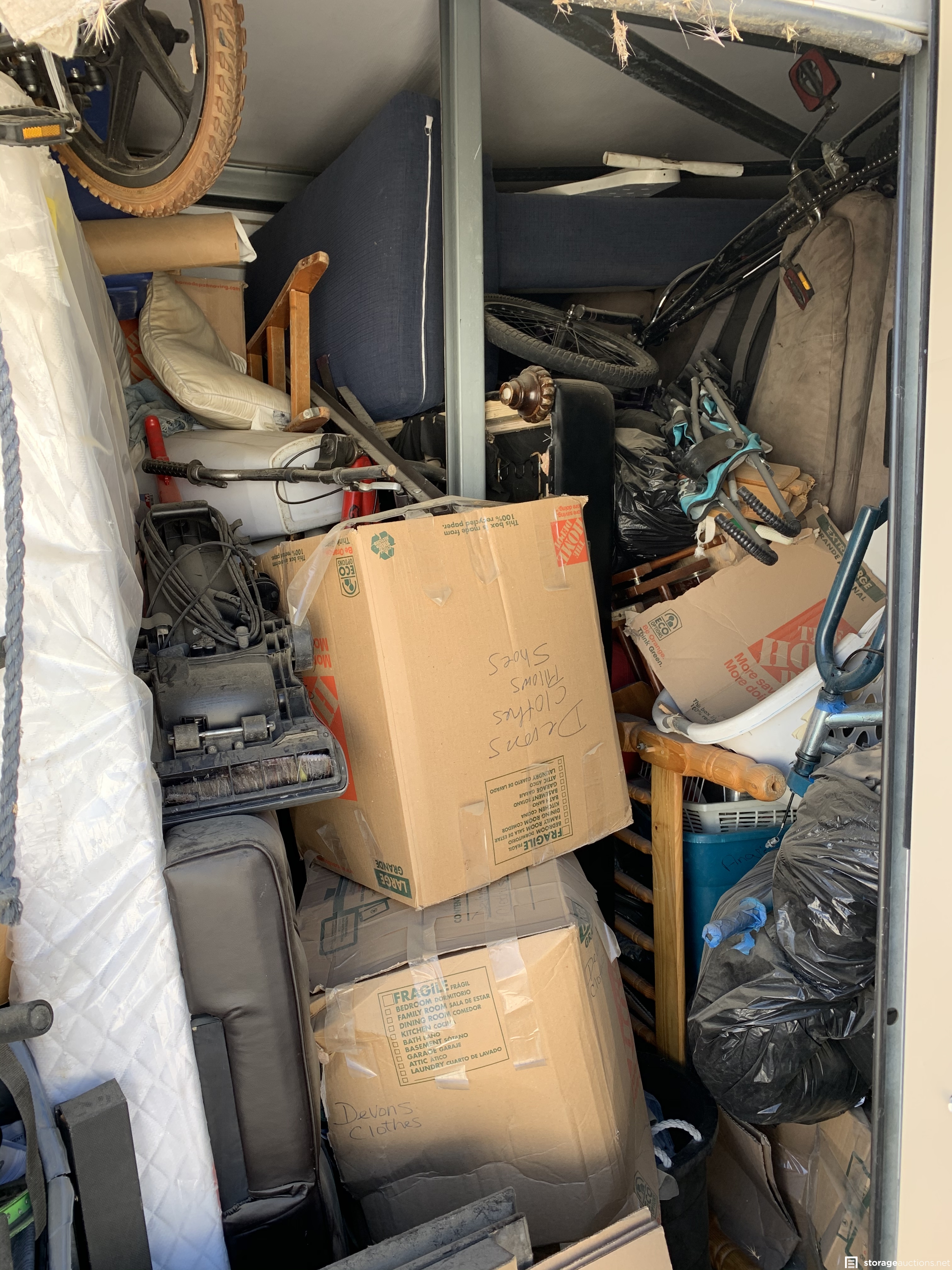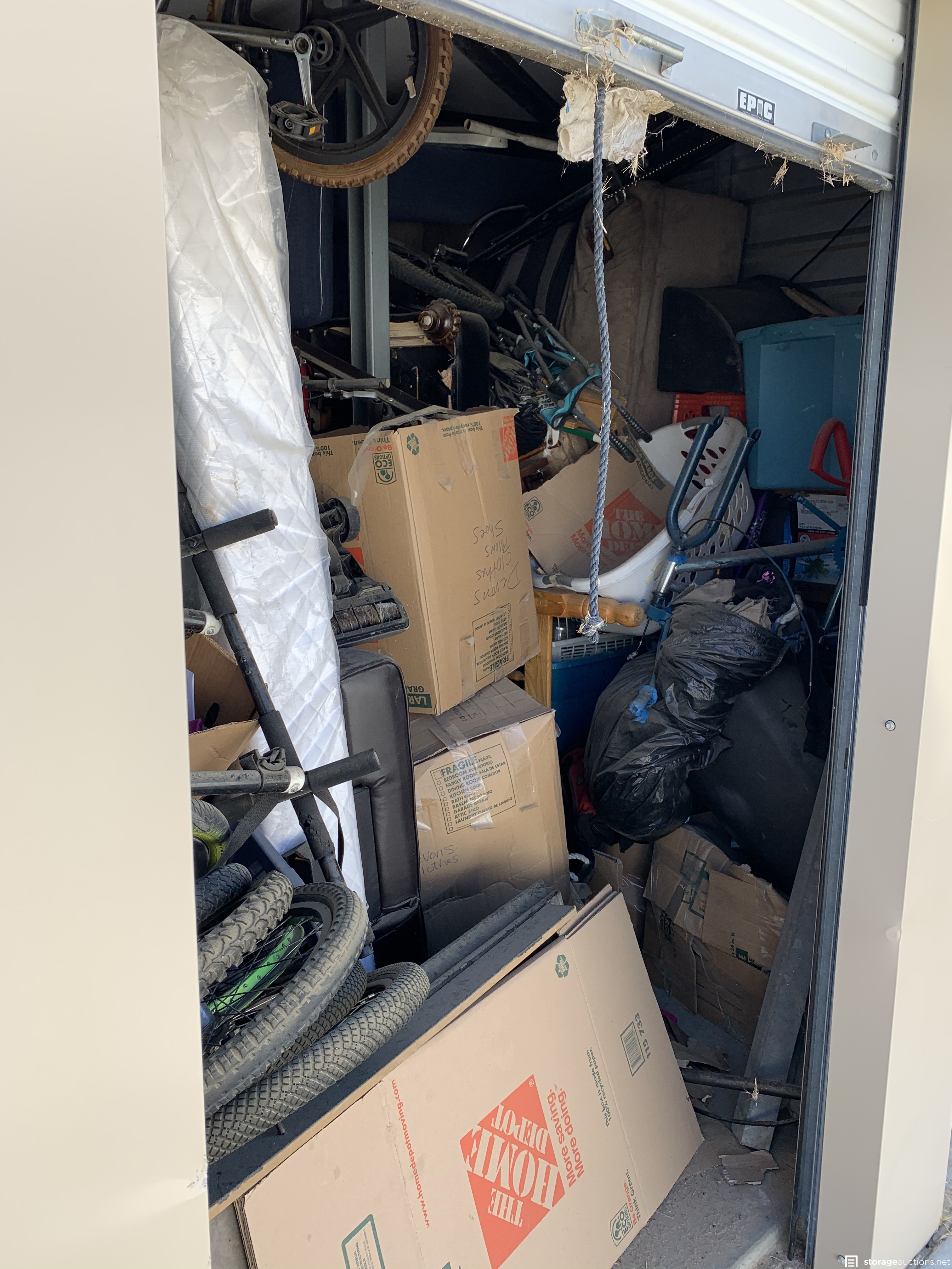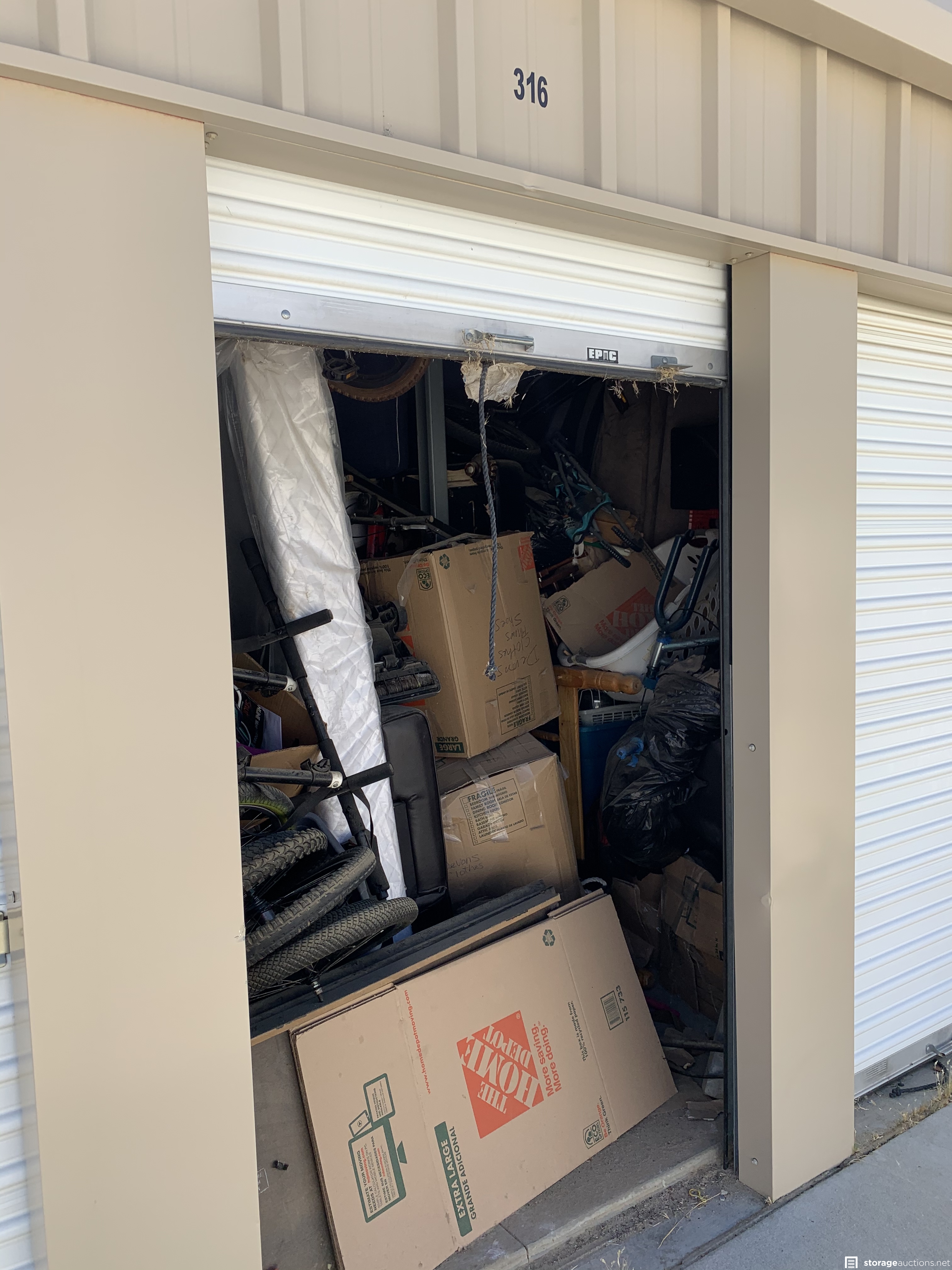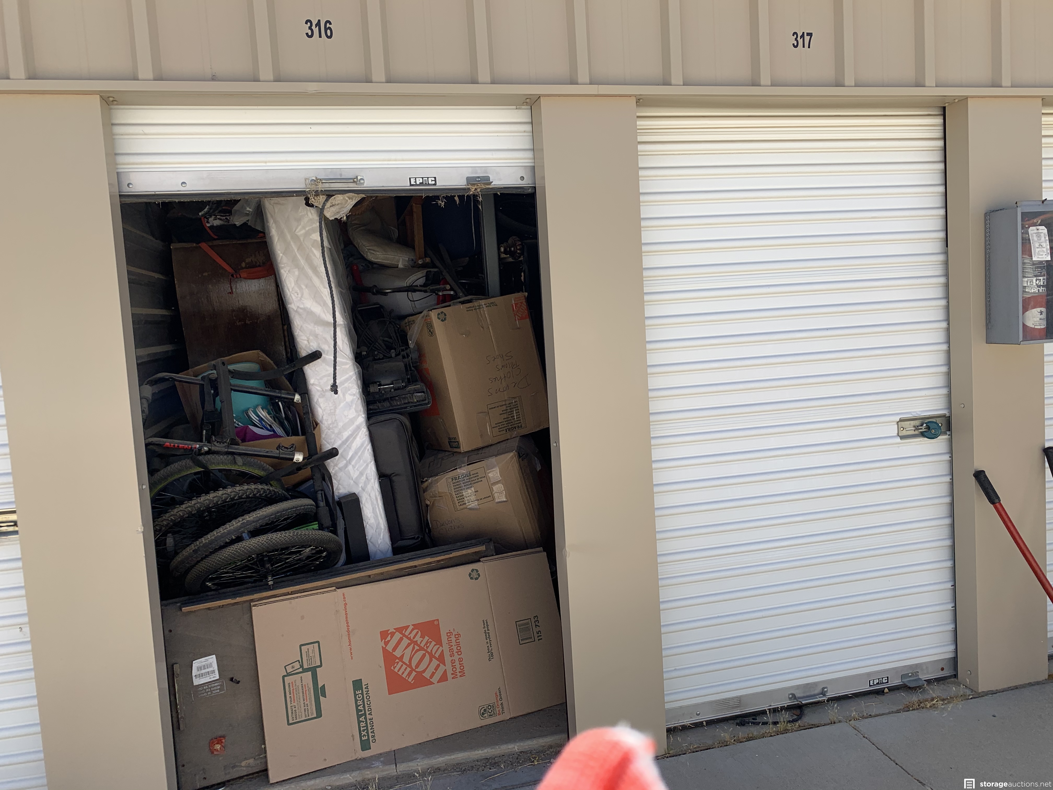 Bikes, boxes, mattress, furniture, totes, and misc. items. This unit has two doors, #316 and #317.
