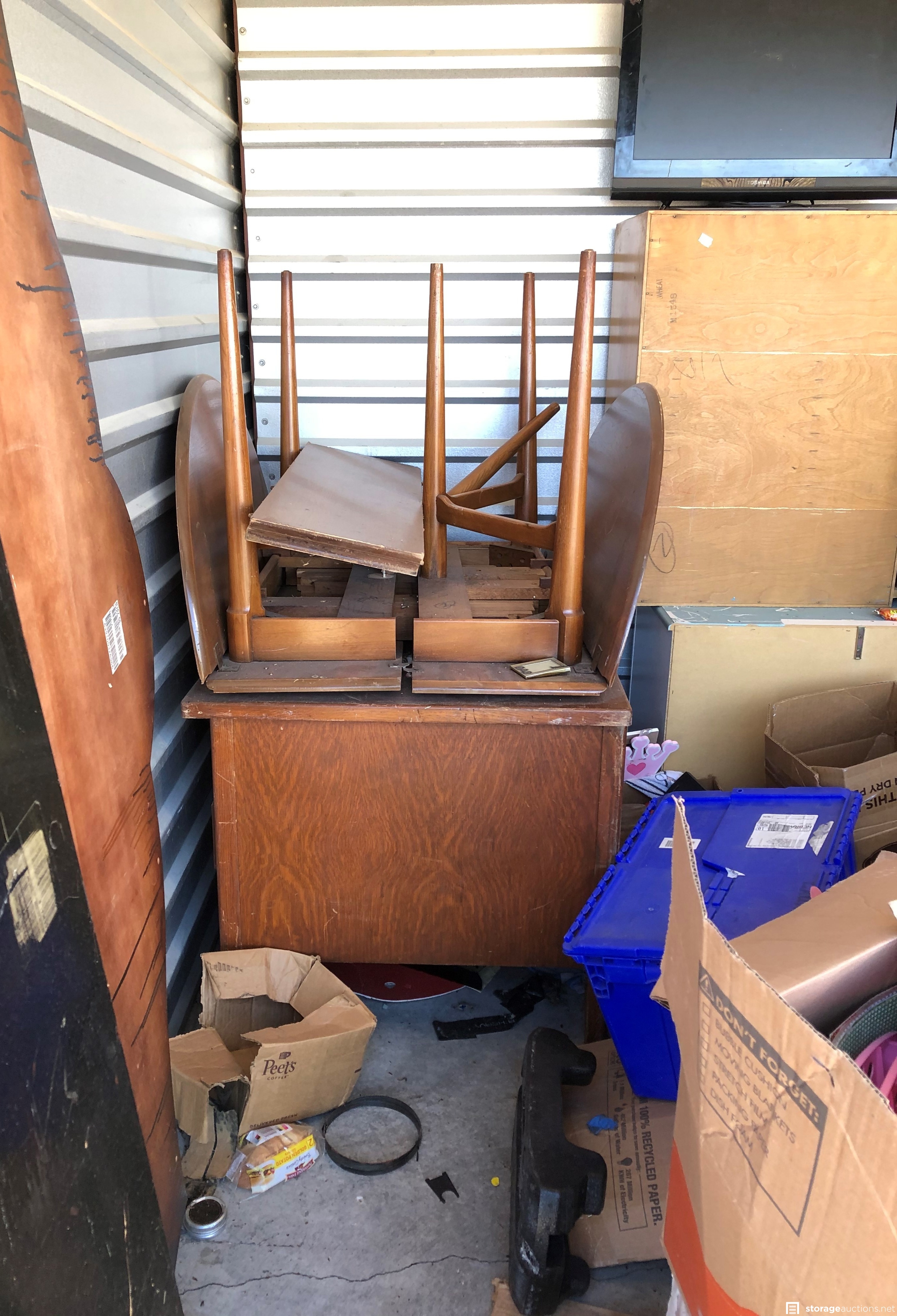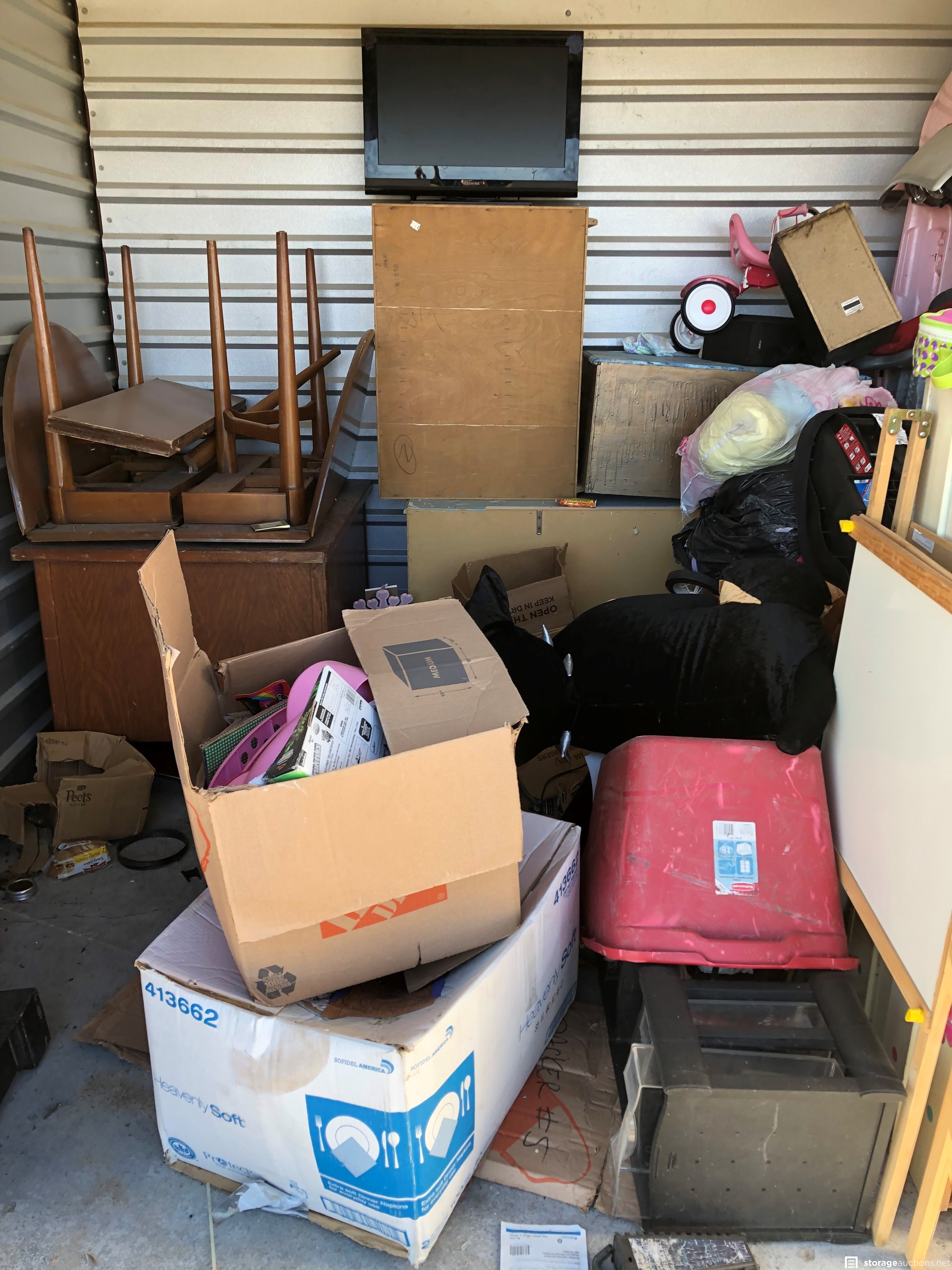 furniture, bed frames, bedding, baby crib, crib mattress, dinette set, table, chairs, boxes, toys, tricycle, big wheel car, dresser