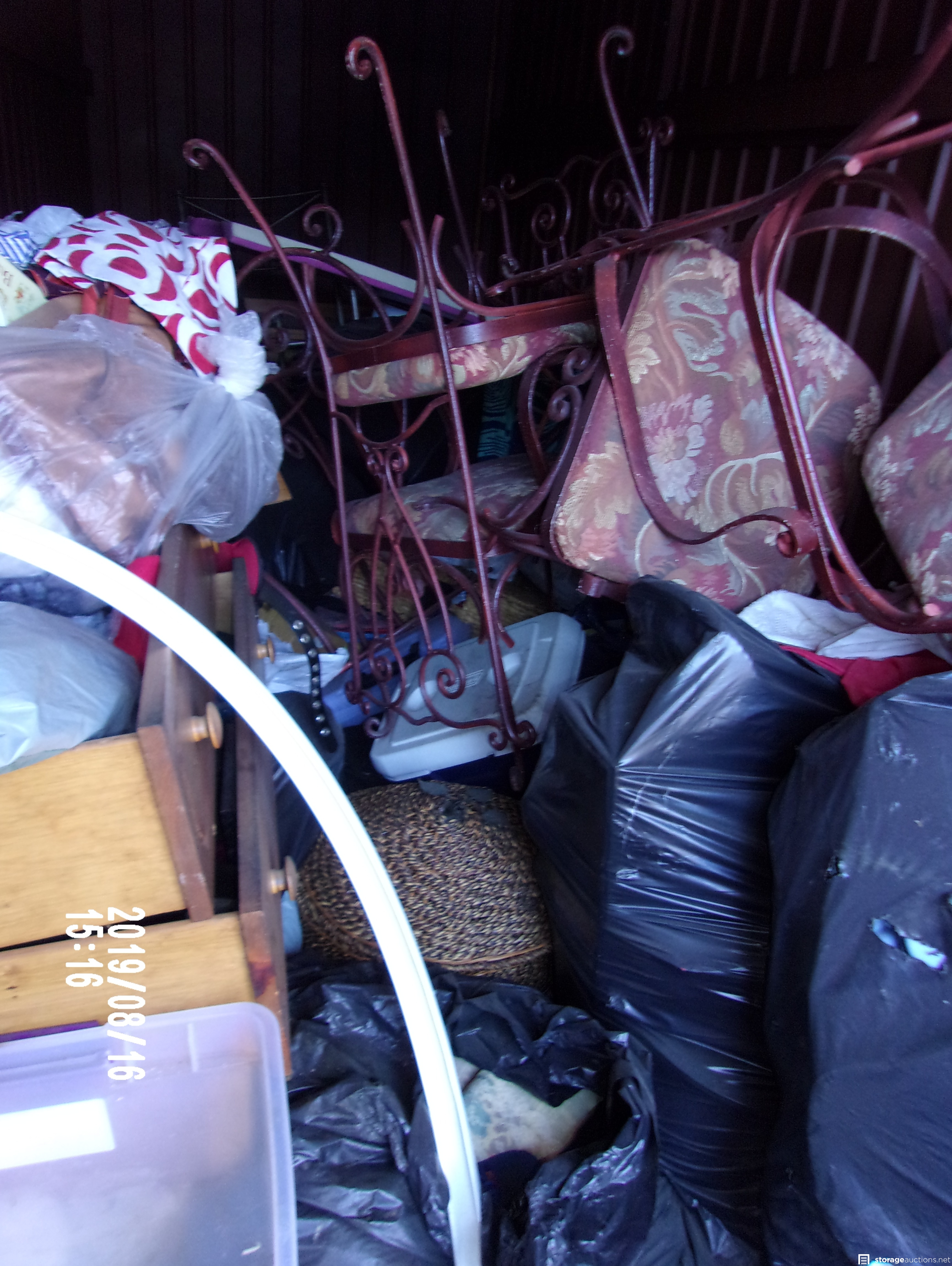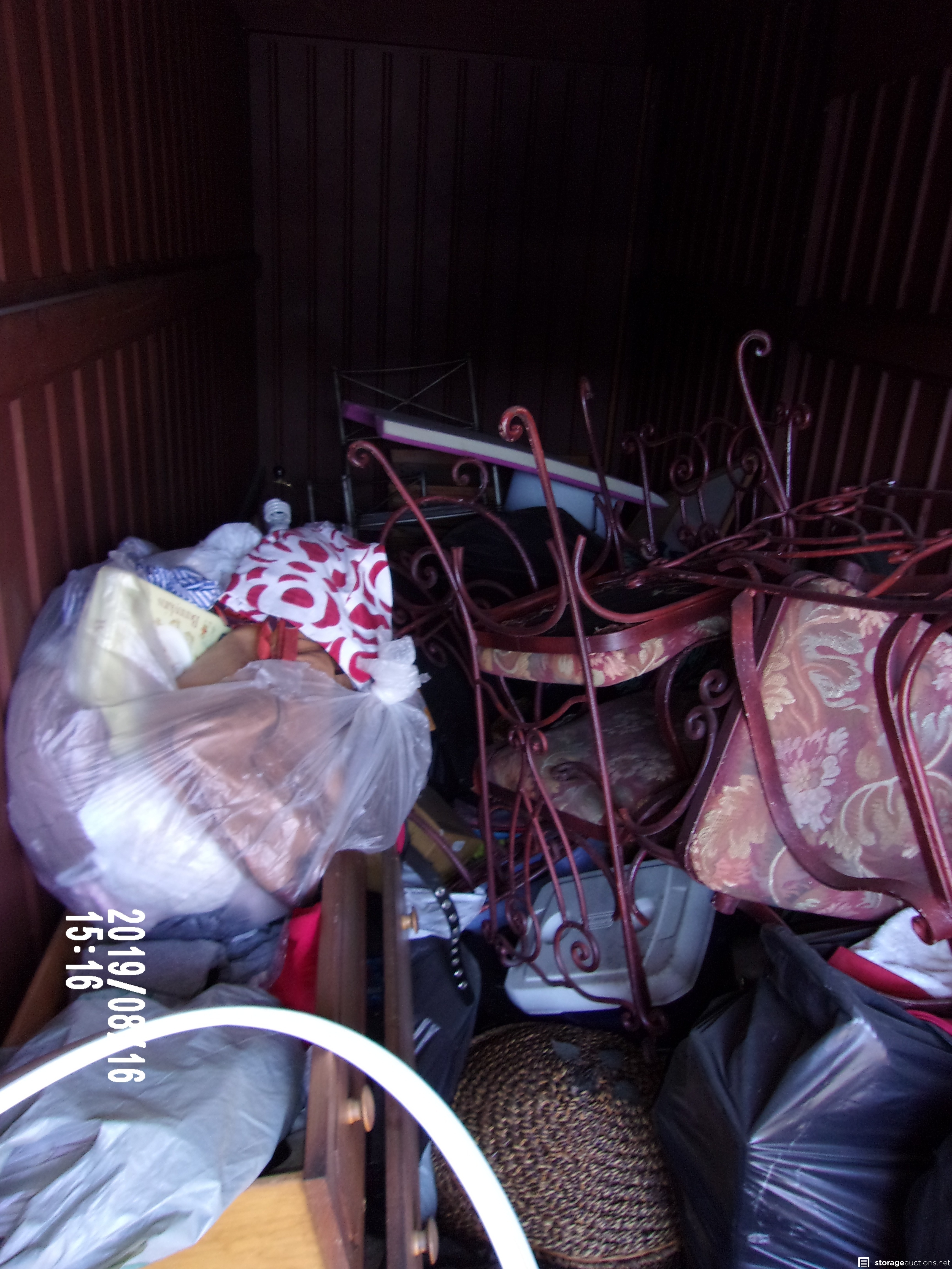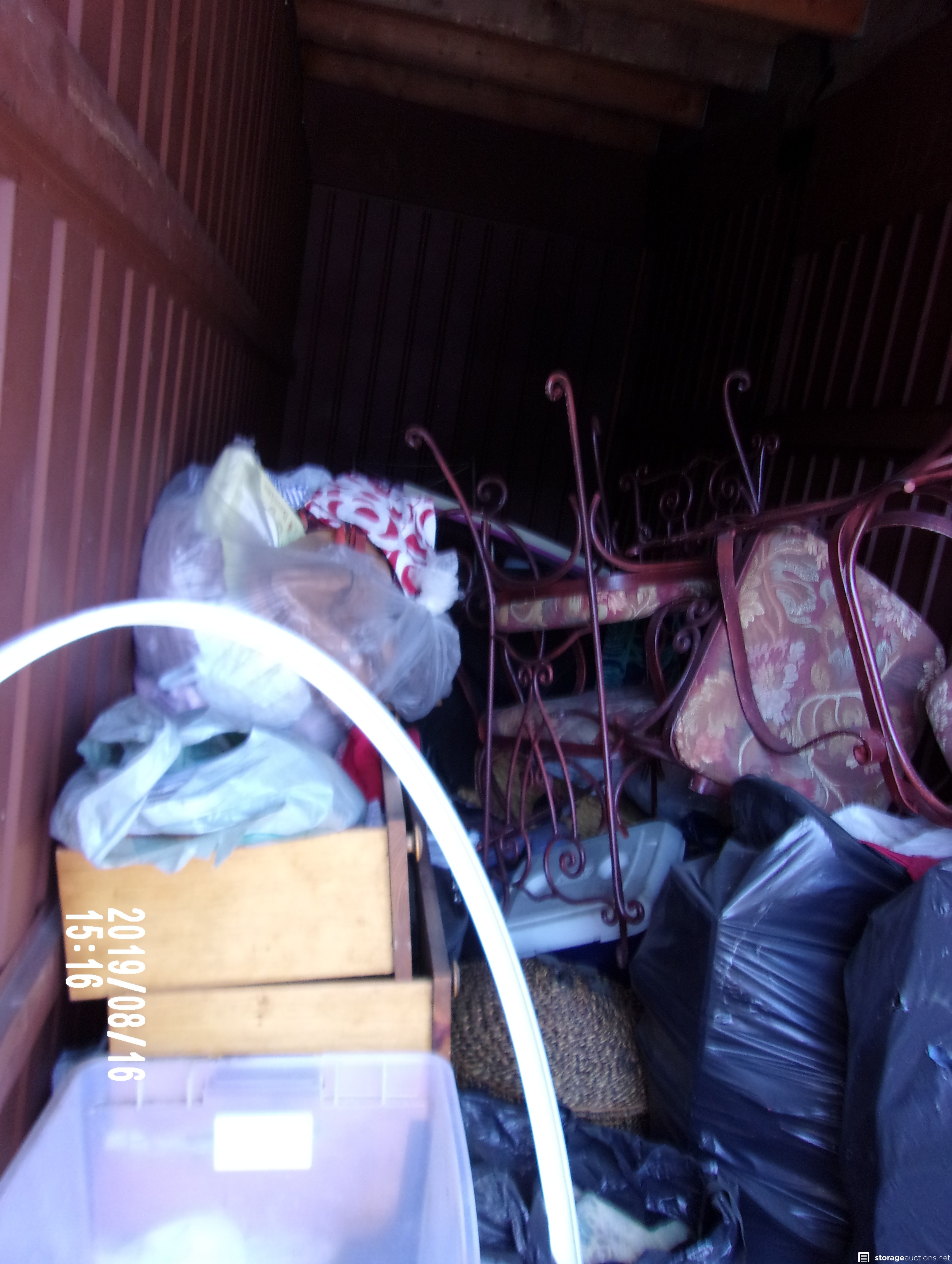 UNIT APPEARS TO CONTAIN: CHAIRS, 3 WICKER BASKET, TUBS, ICE CHEST, PATIO TABLE, CHAIRS, BAGS, AND BOXES