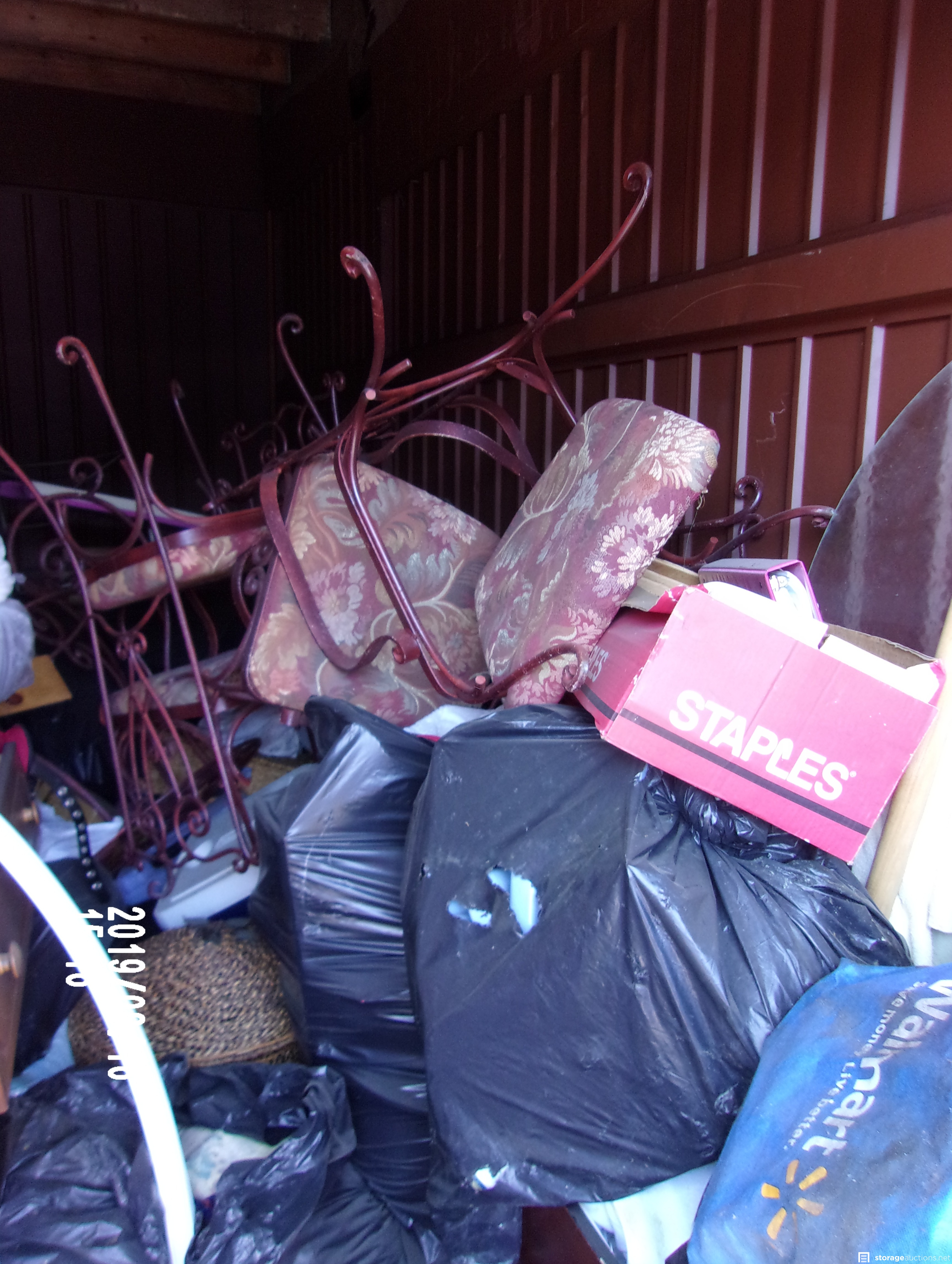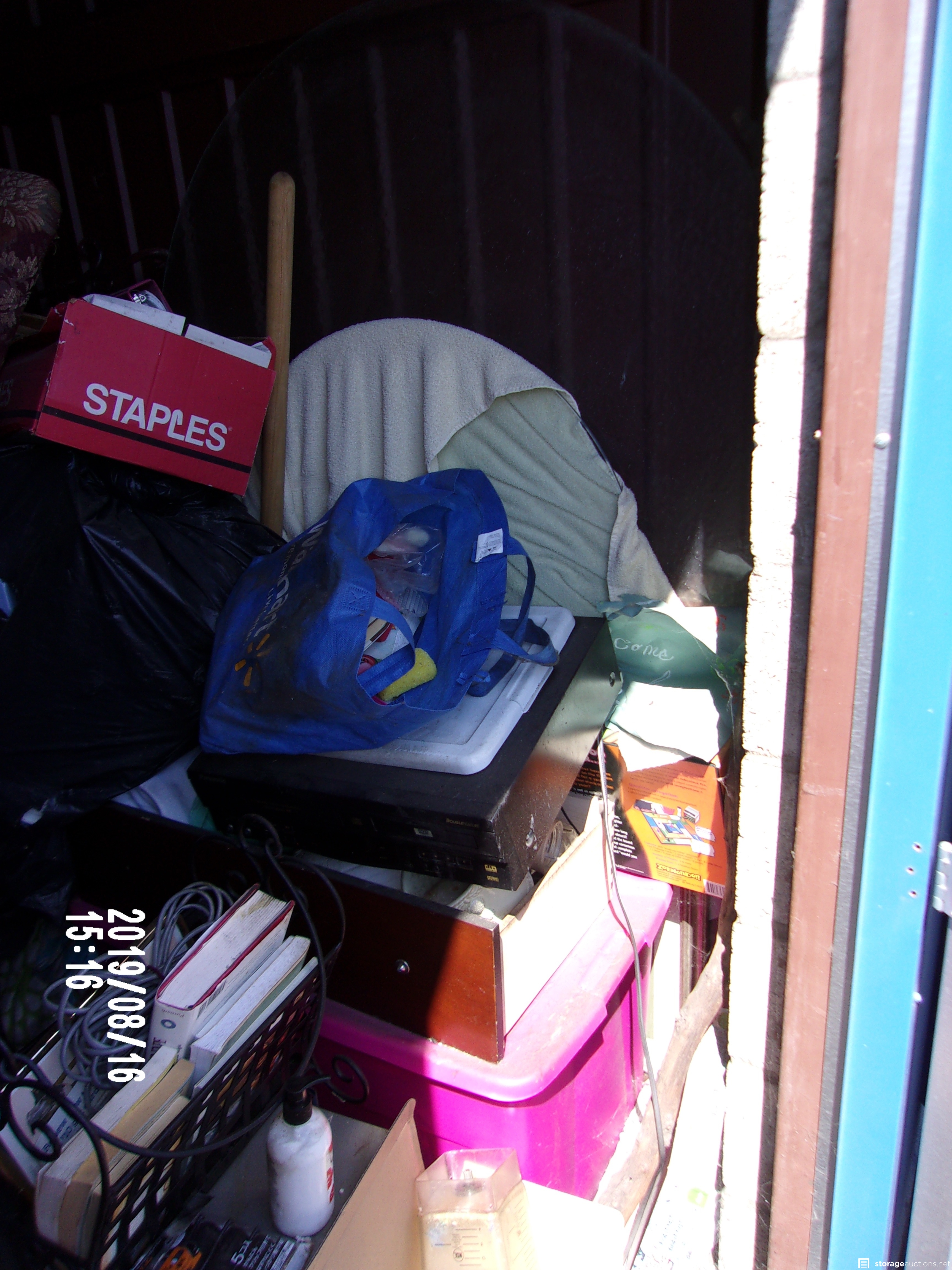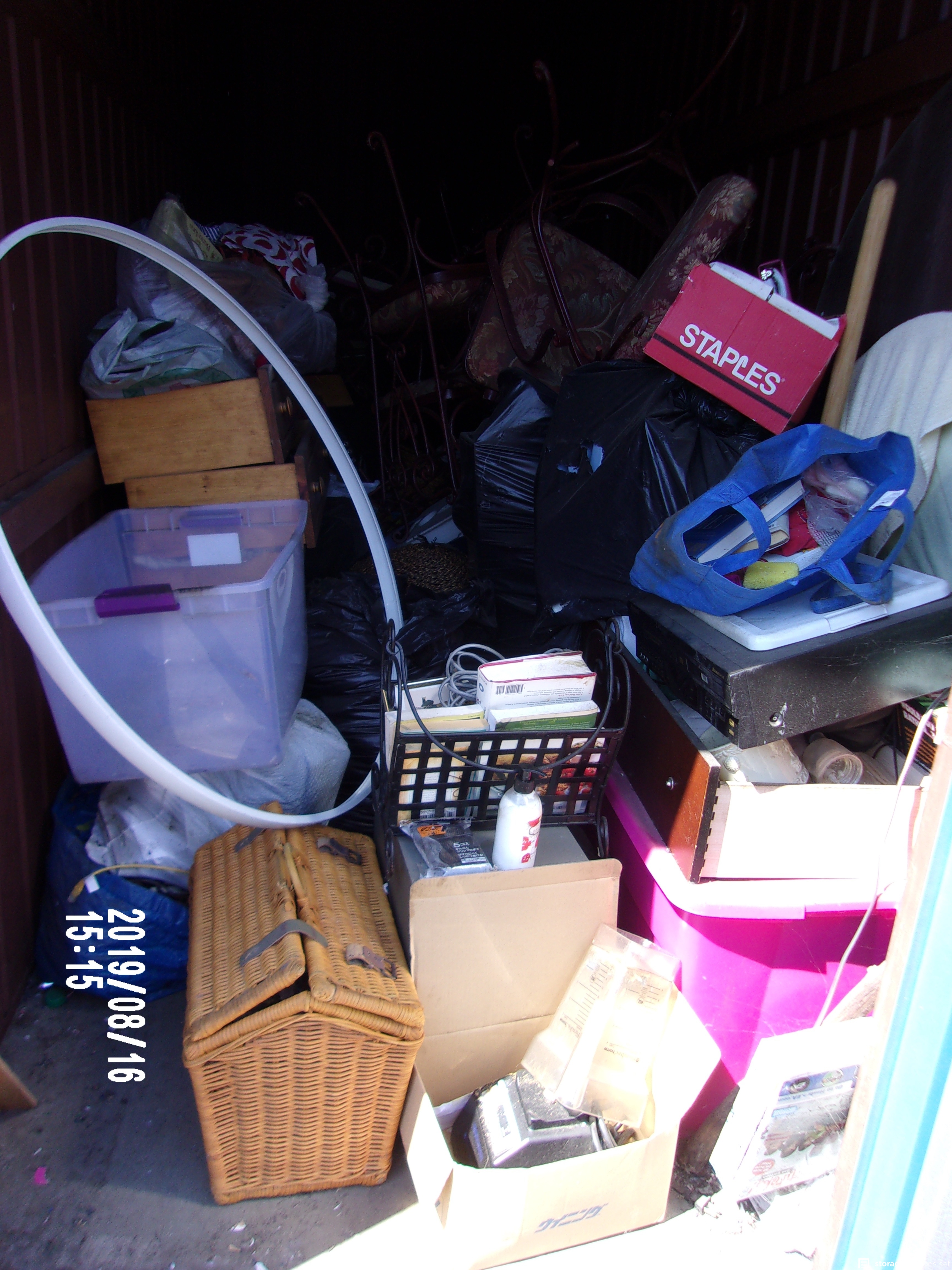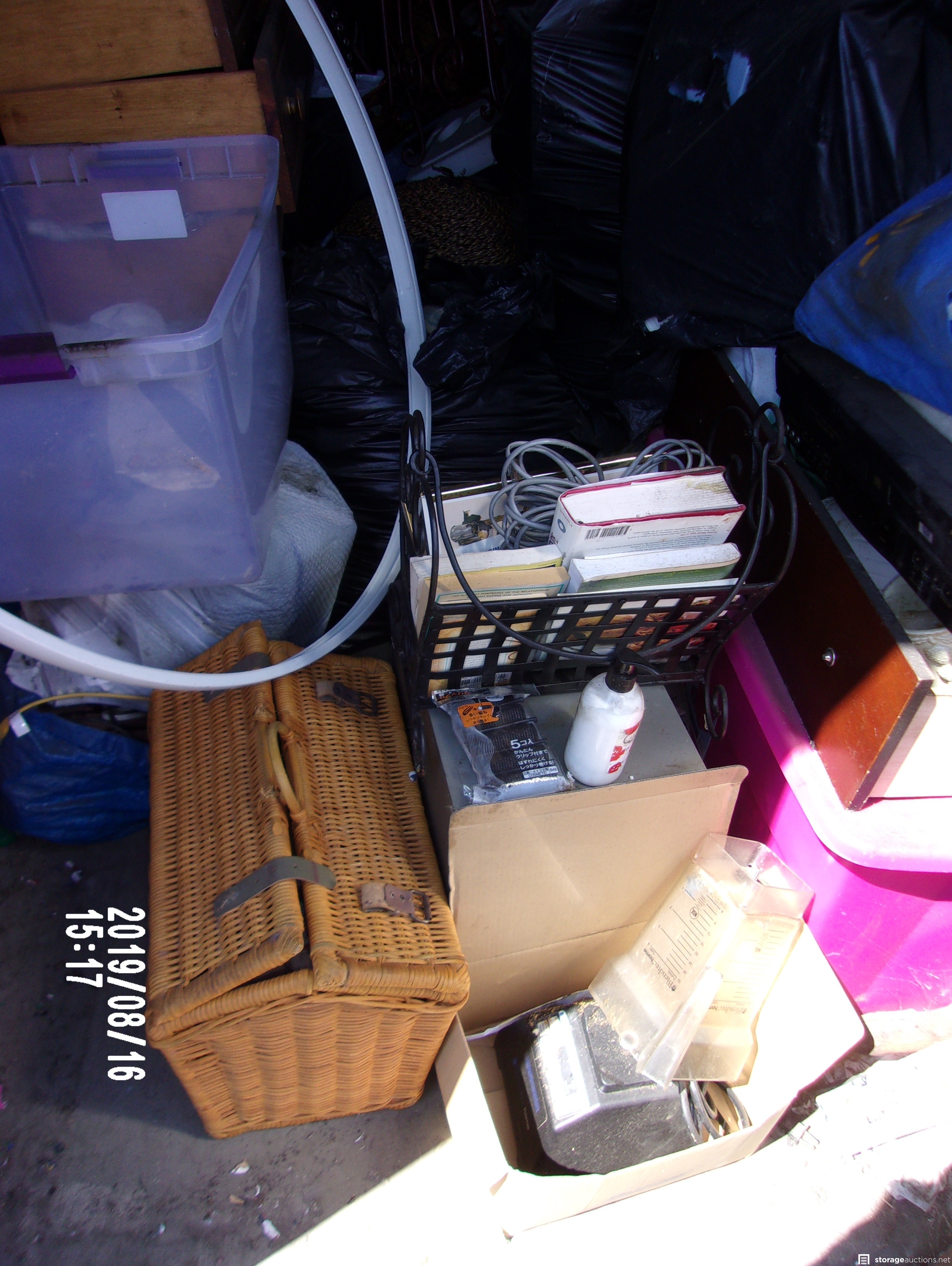 UNIT APPEARS TO CONTAIN: CHAIRS, 3 WICKER BASKET, TUBS, ICE CHEST, PATIO TABLE, CHAIRS, BAGS, AND BOXES