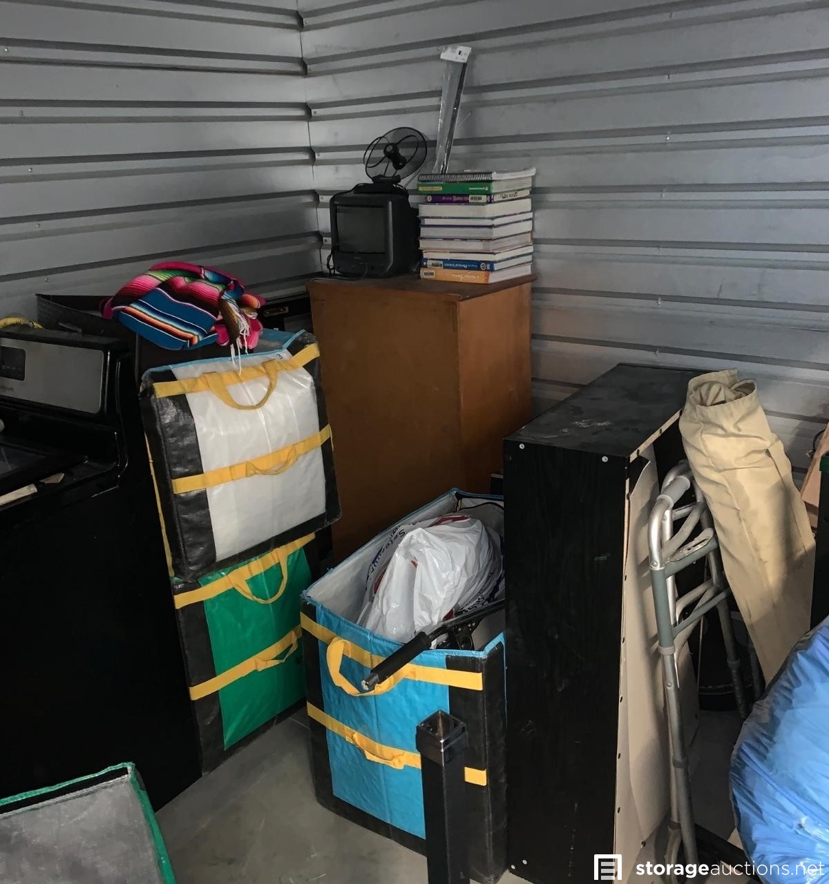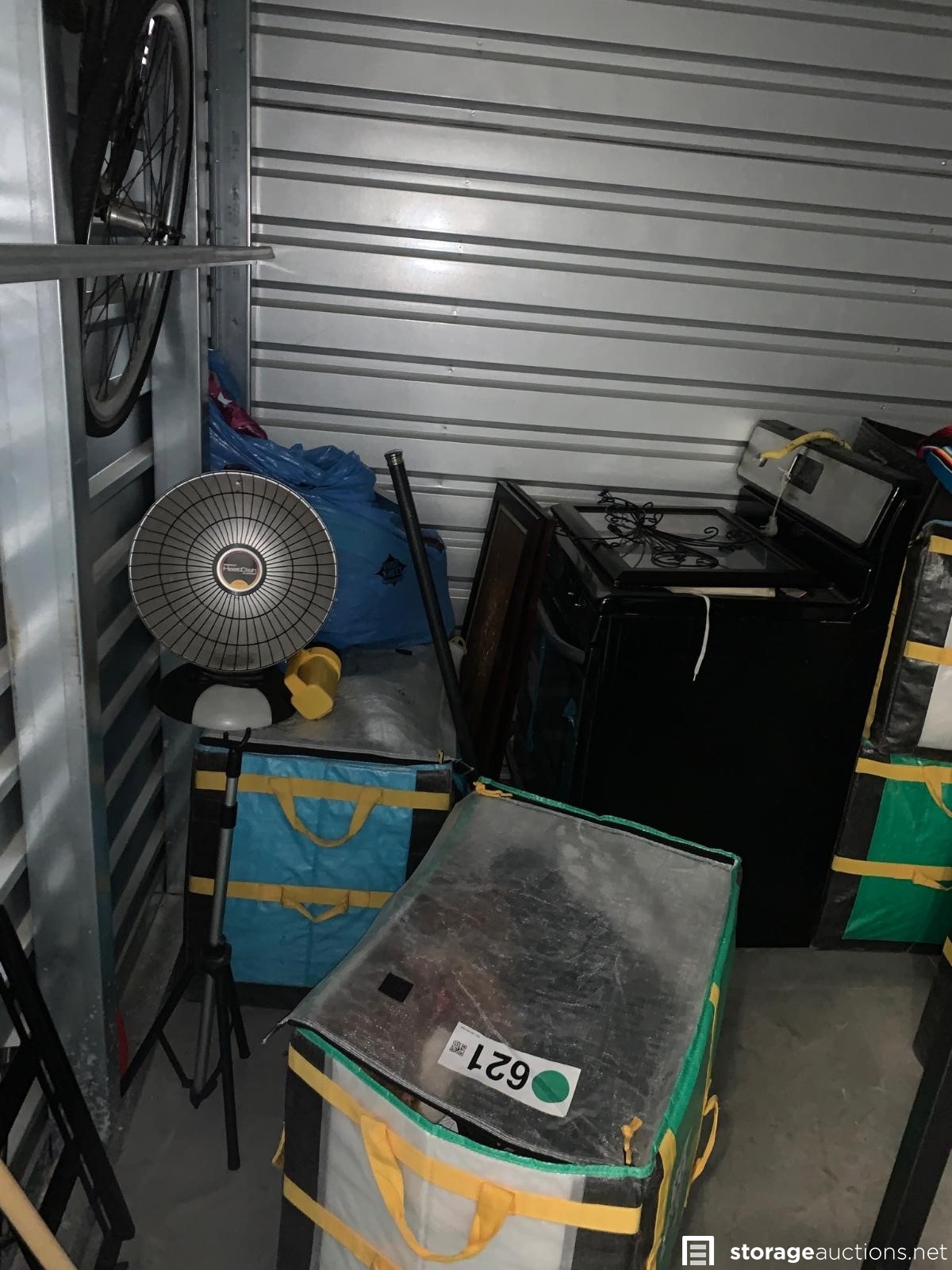 STORE SHELVES, DUFFLE BAGS, BOOKS, SMALL T.V , WALKER, TOILET, FAN, BICYCLE WHEELS, UMBRELLA, BOXES.