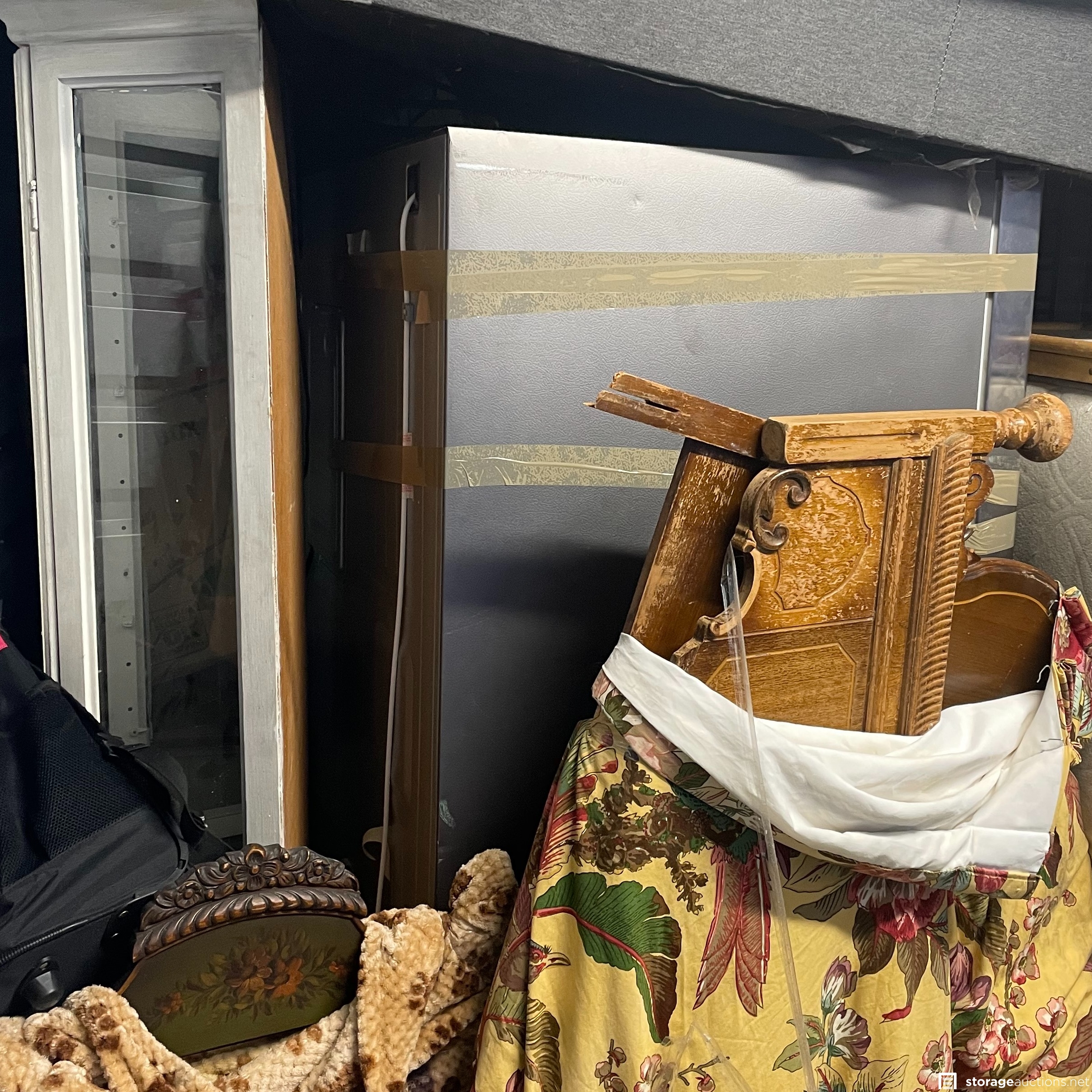 Unit appears to contain furniture, bed, refrigerator, microwave, lamps, artwork, miscellaneous household goods, and miscellaneous containers of unknown content.