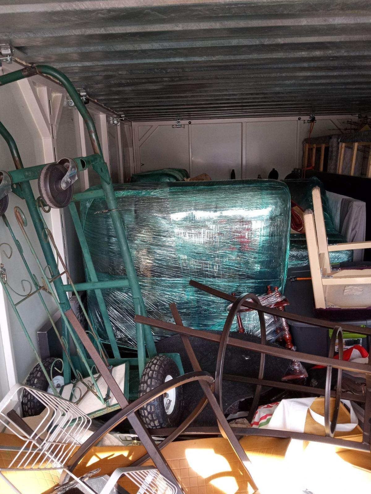 Chairs, barstools, end tables, mattresses, fishing poles, assorted wrapped furniture, bicycle, totes, boxes, bins, additional luggage pieces.