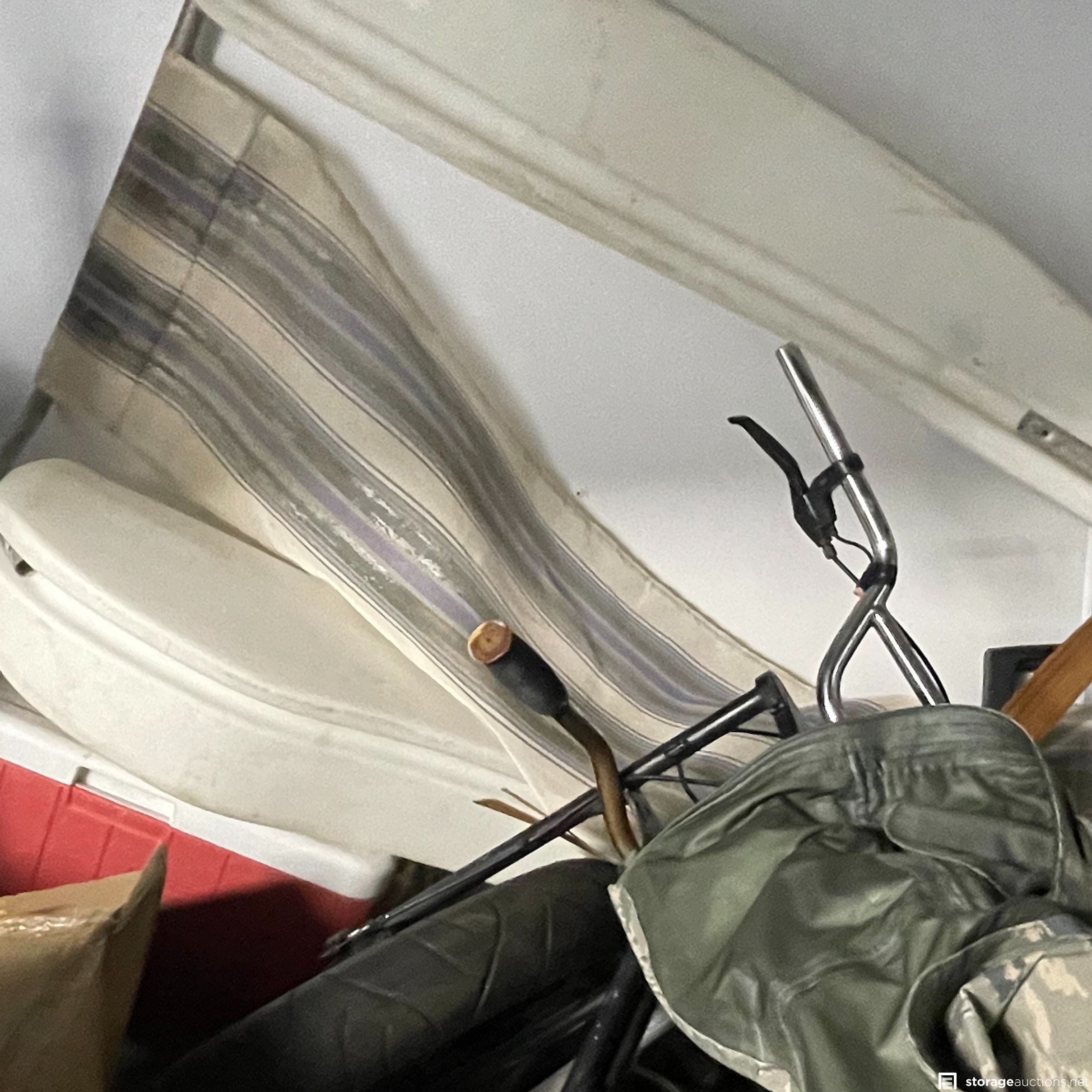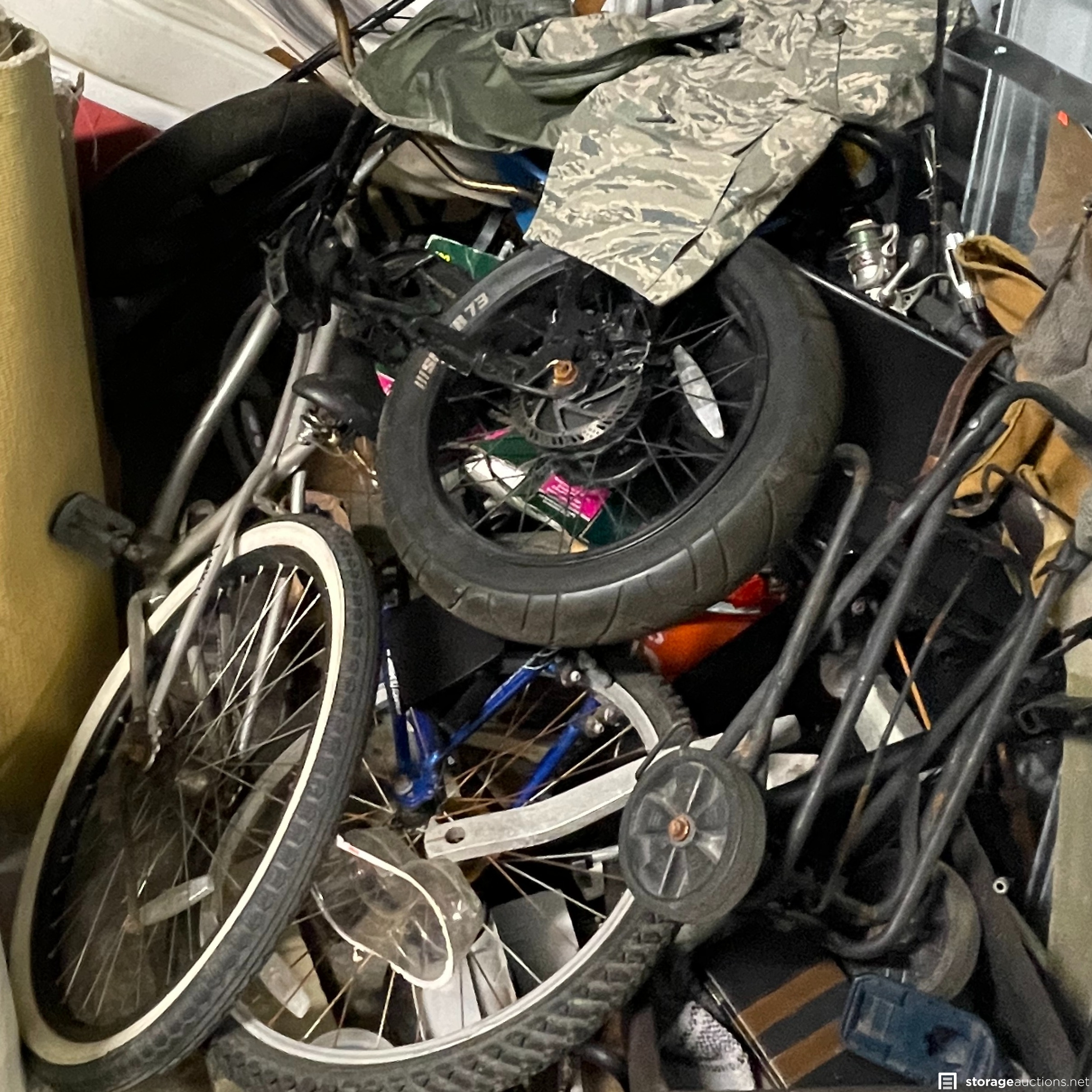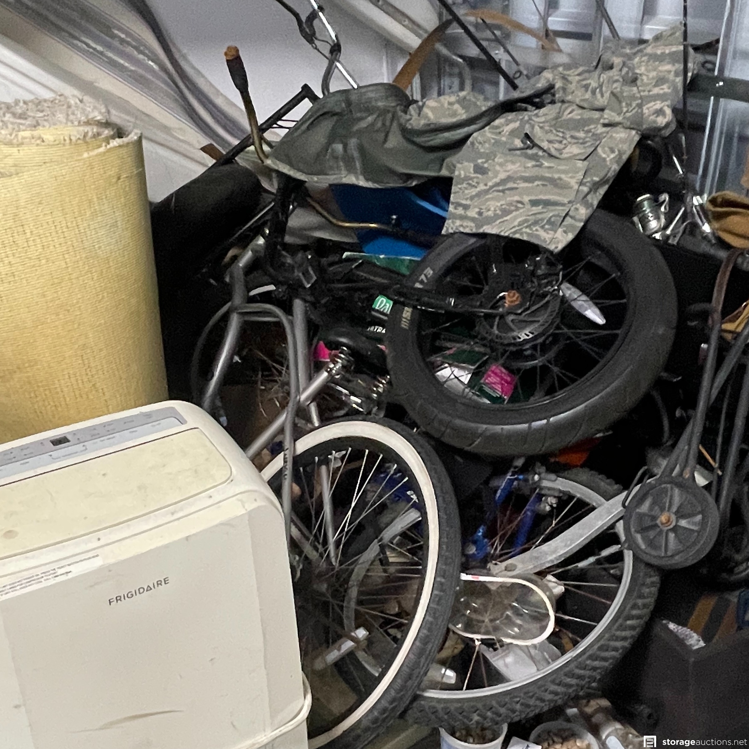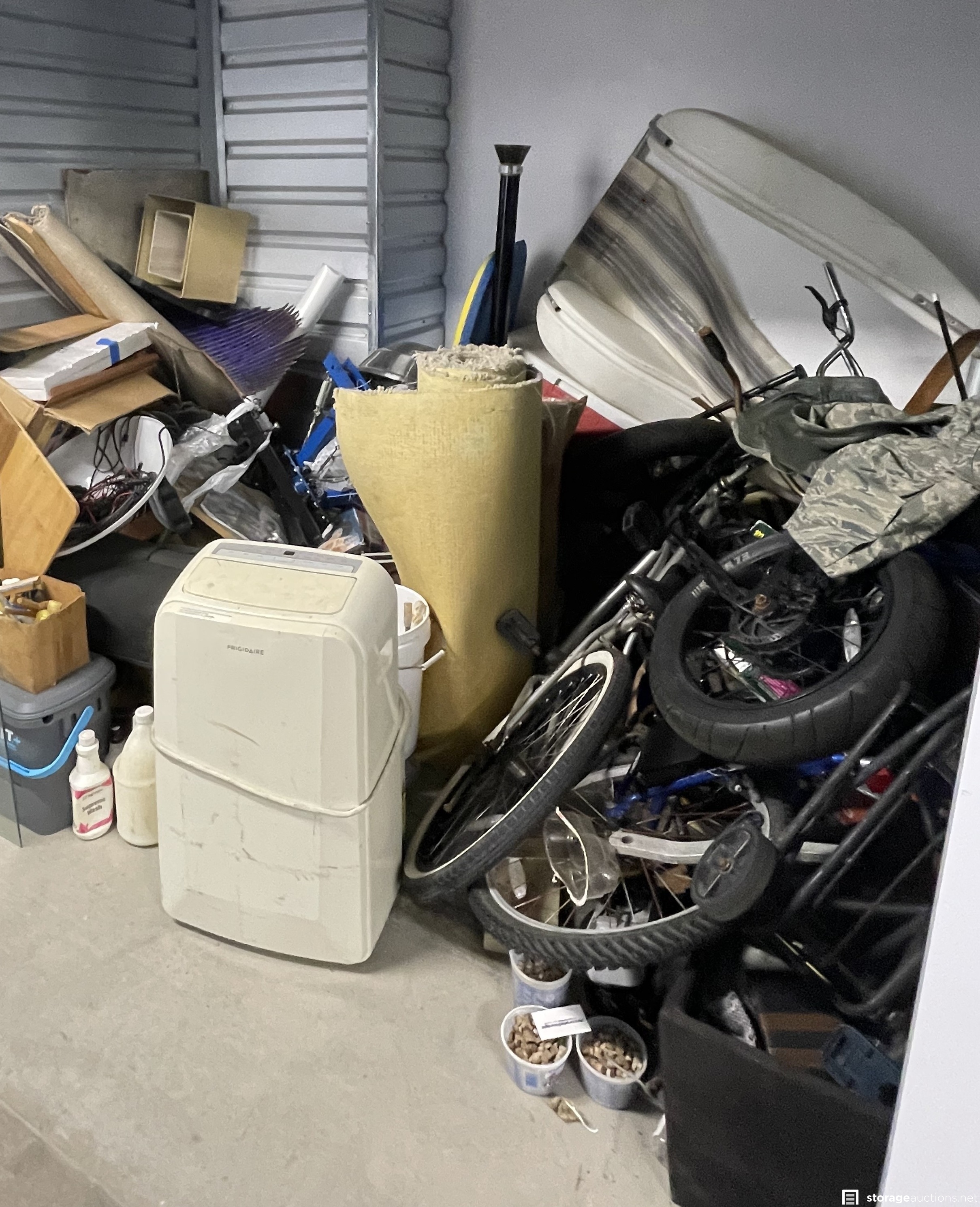 The storage unit appears to contain miscellaneous household goods, furniture, bicycles, portable A/C unit, floating chair raft, fishing poles, rinse kit, ice chest, and miscellaneous containers of unknown content.