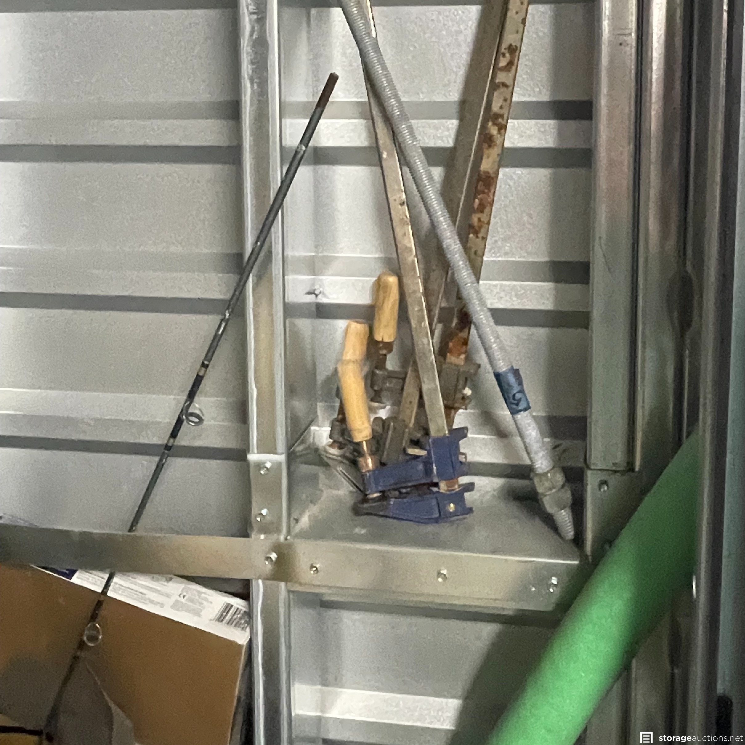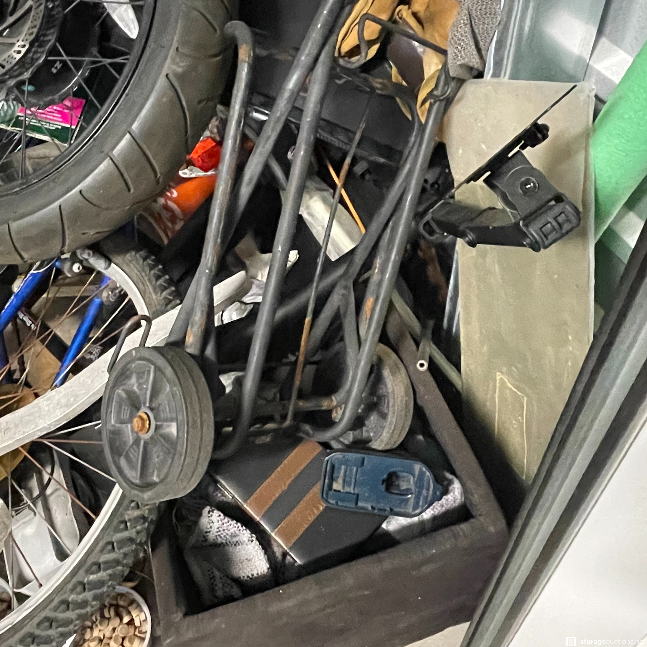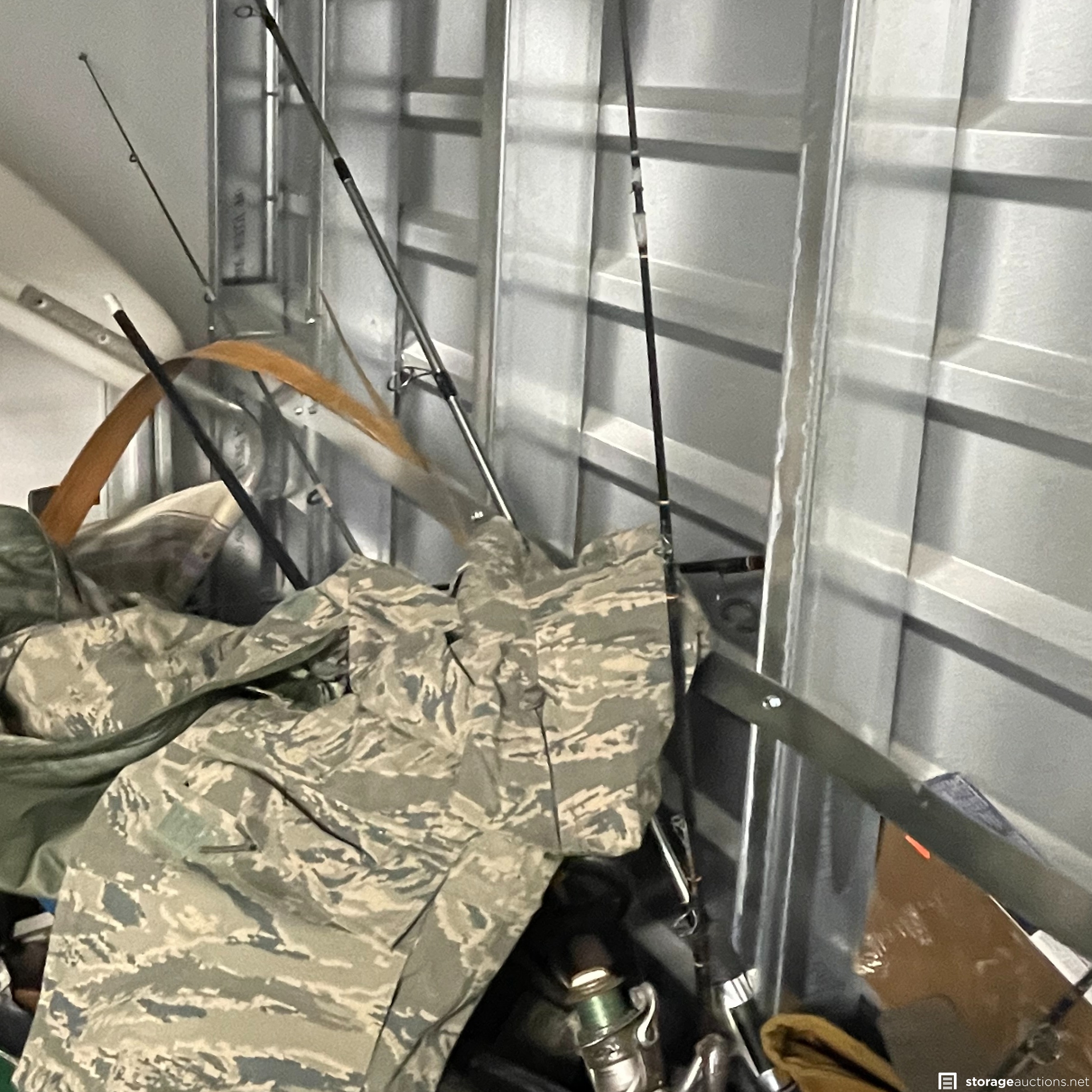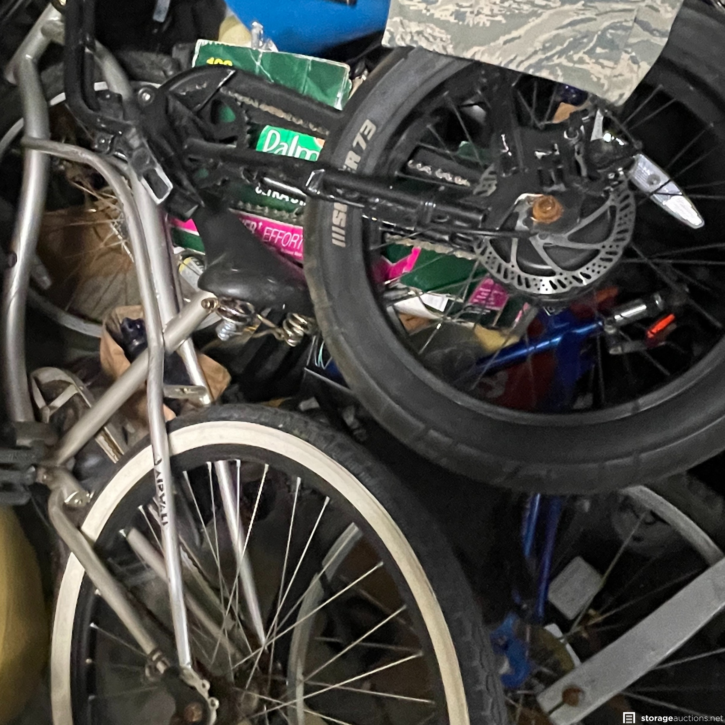 The storage unit appears to contain miscellaneous household goods, furniture, bicycles, portable A/C unit, floating chair raft, fishing poles, rinse kit, ice chest, and miscellaneous containers of unknown content.