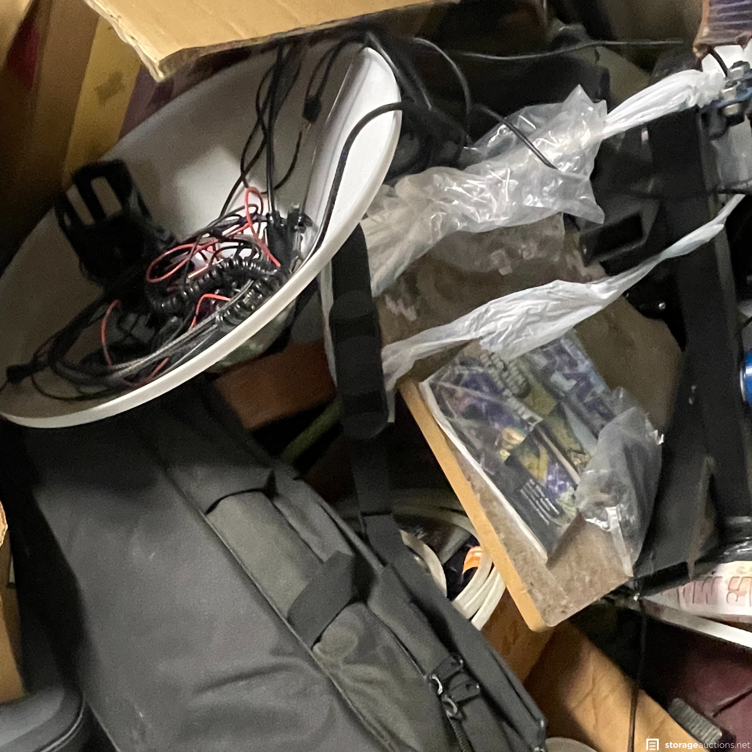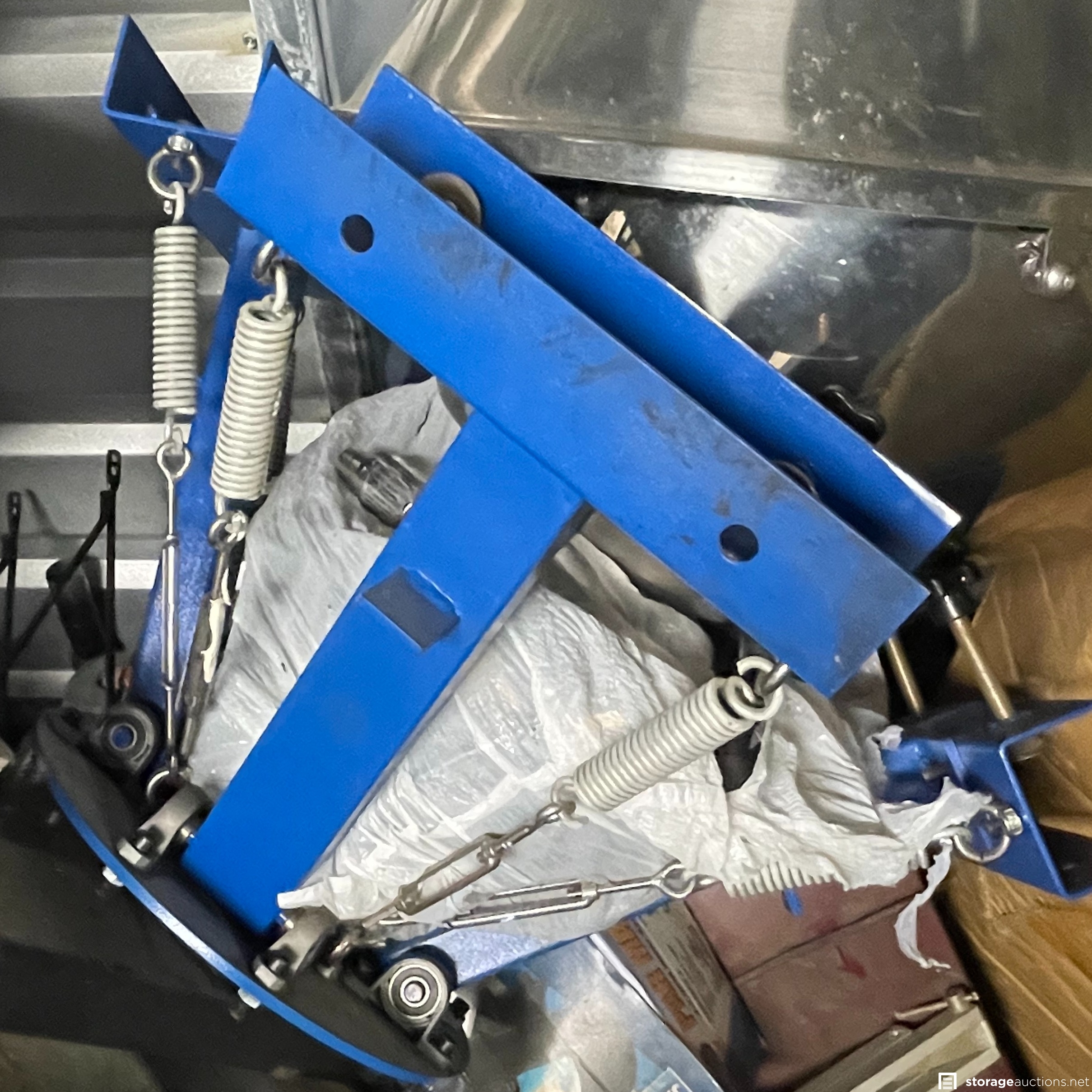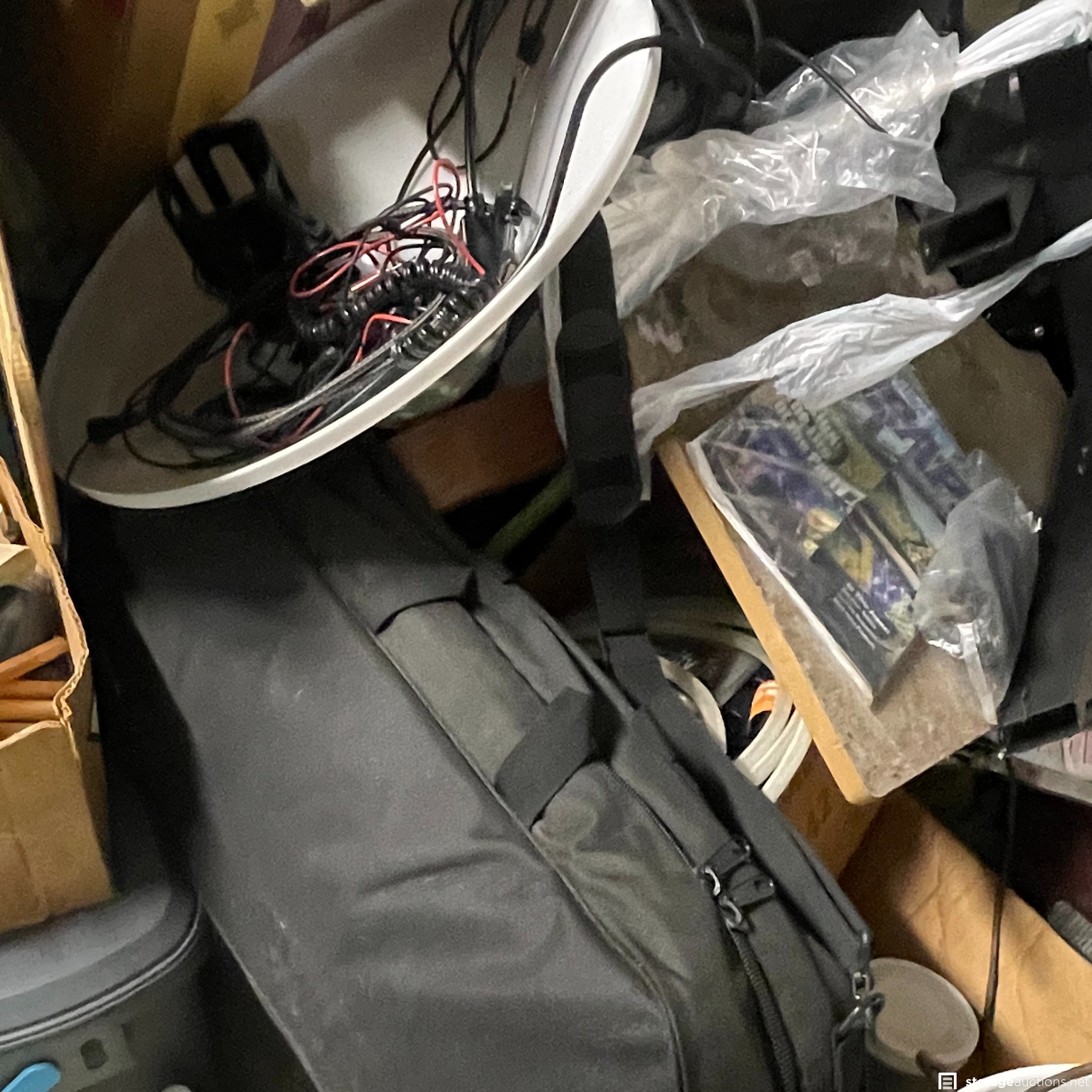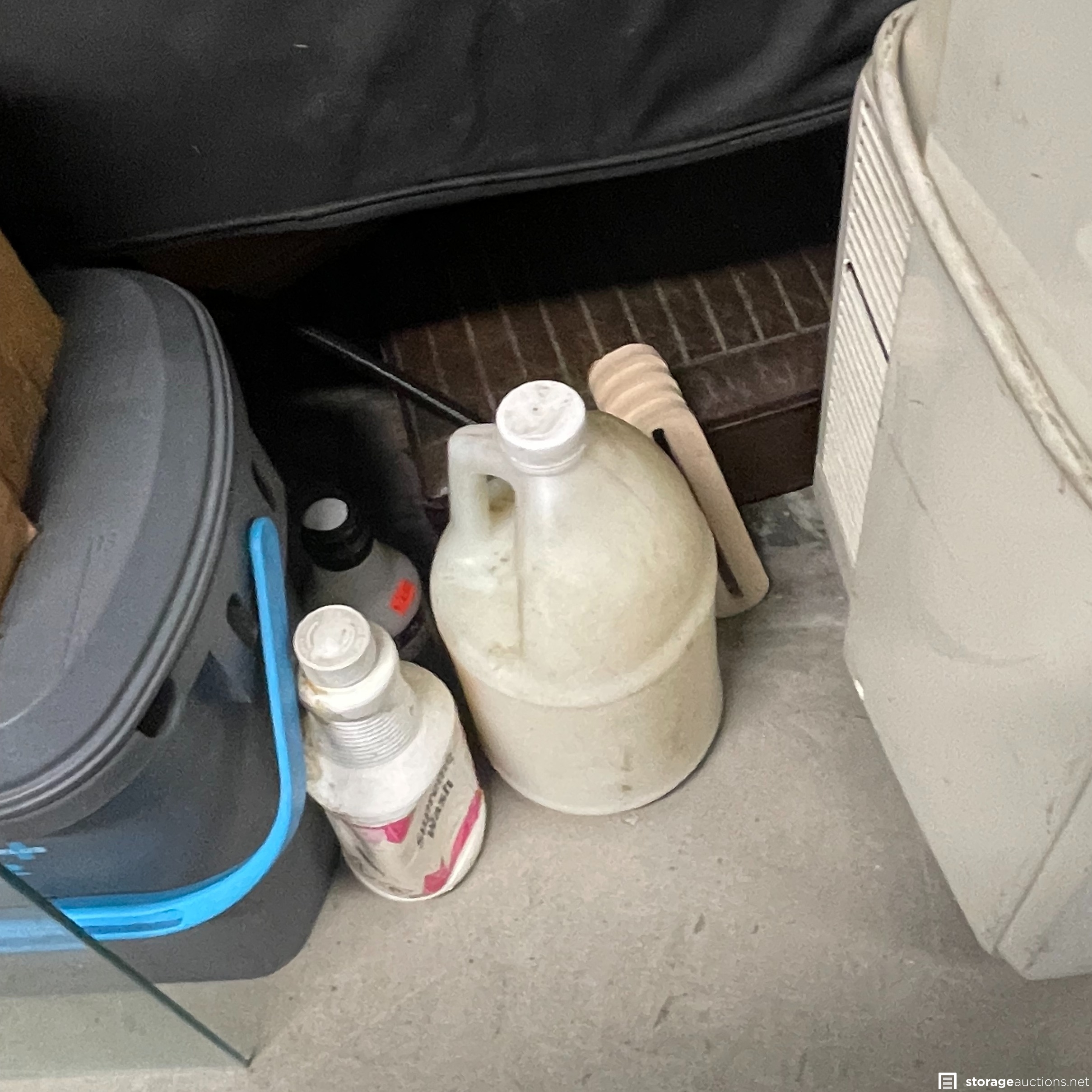 The storage unit appears to contain miscellaneous household goods, furniture, bicycles, portable A/C unit, floating chair raft, fishing poles, rinse kit, ice chest, and miscellaneous containers of unknown content.