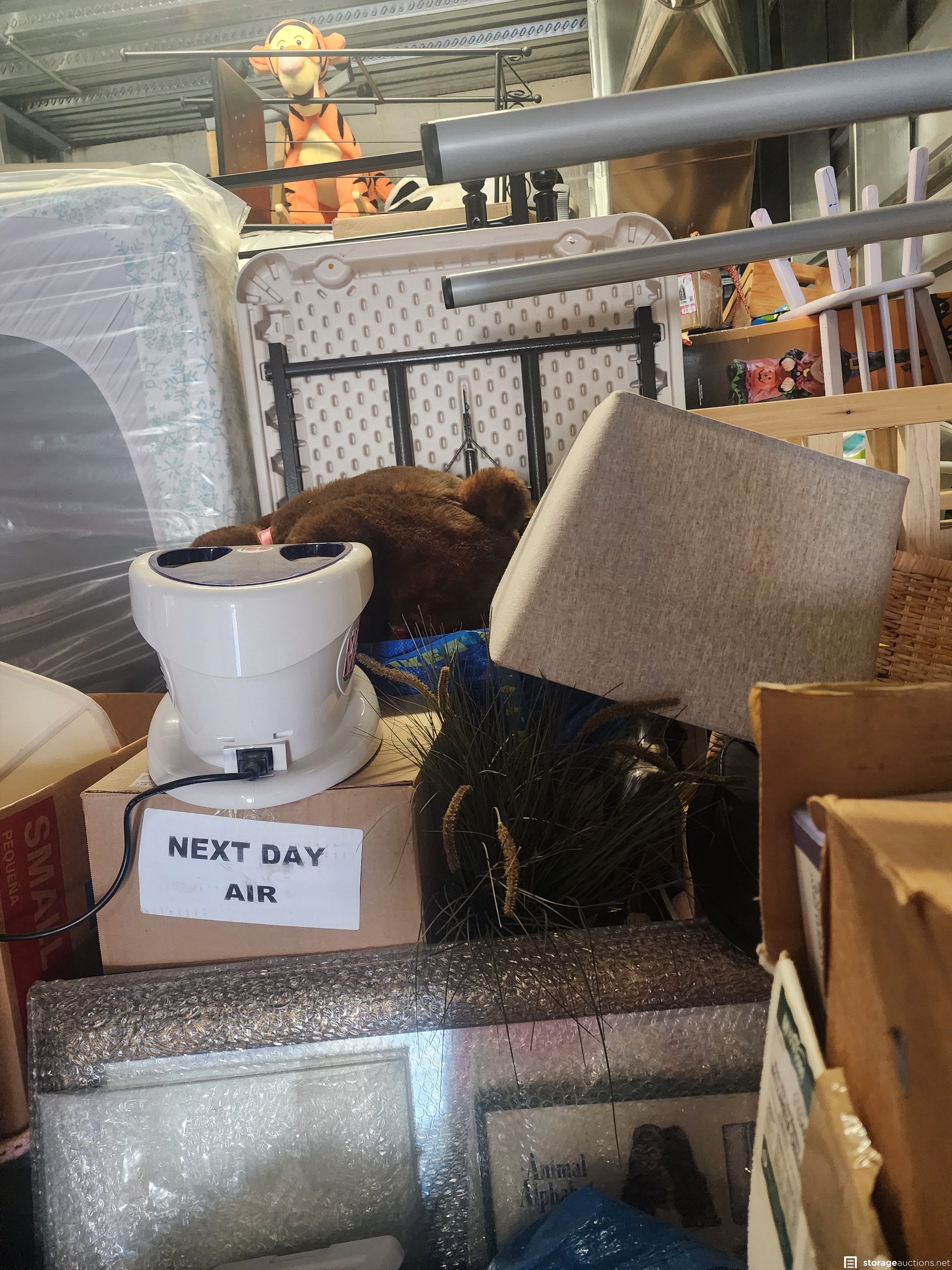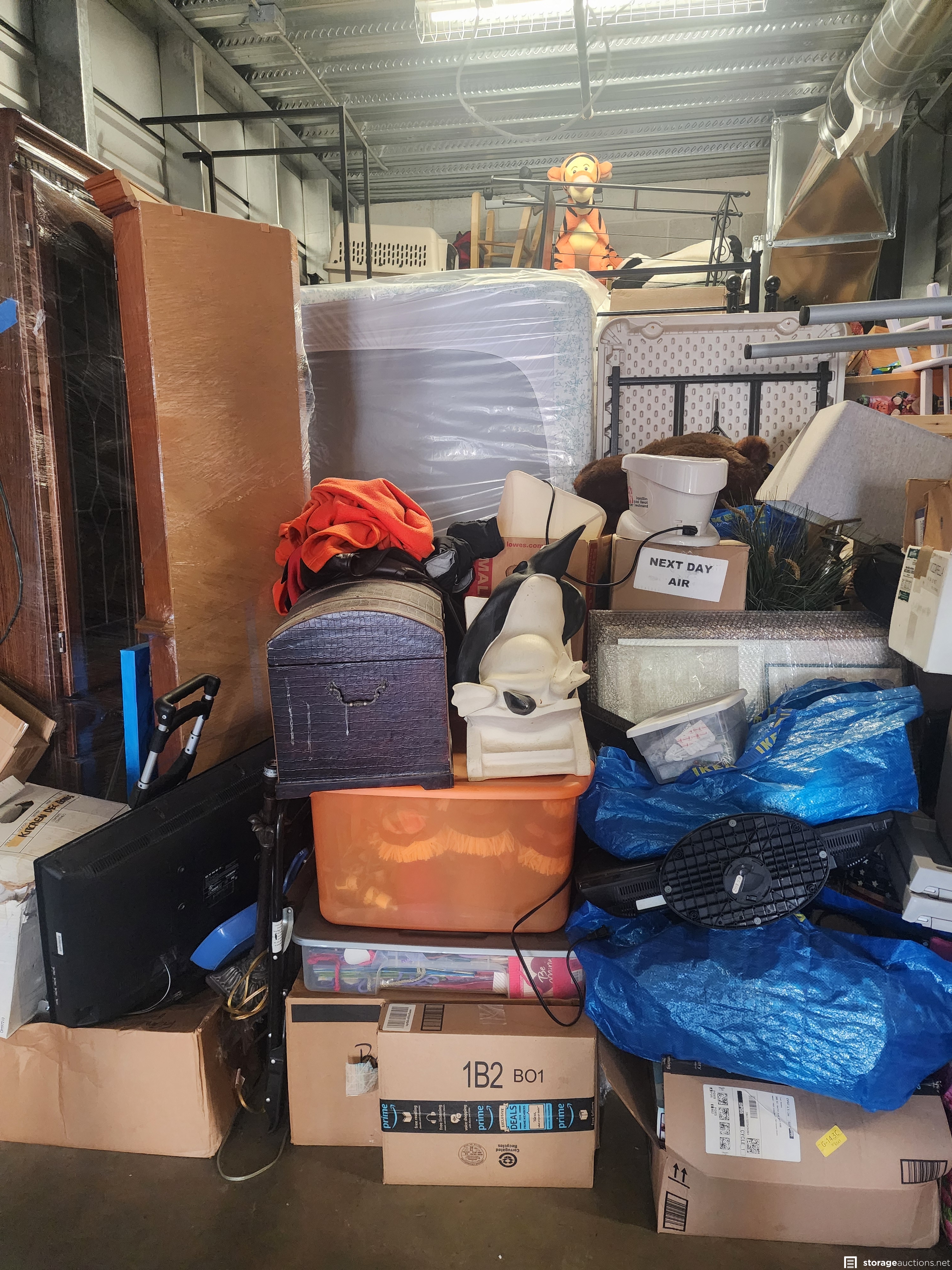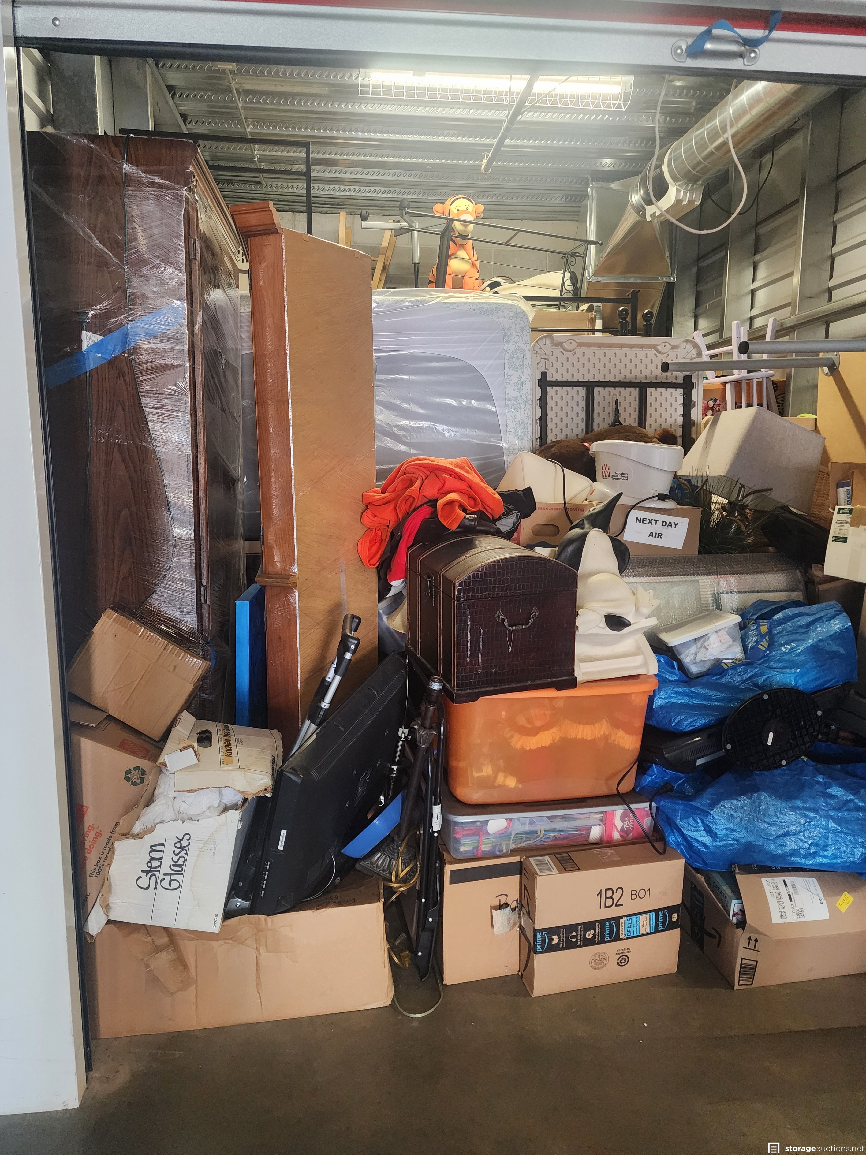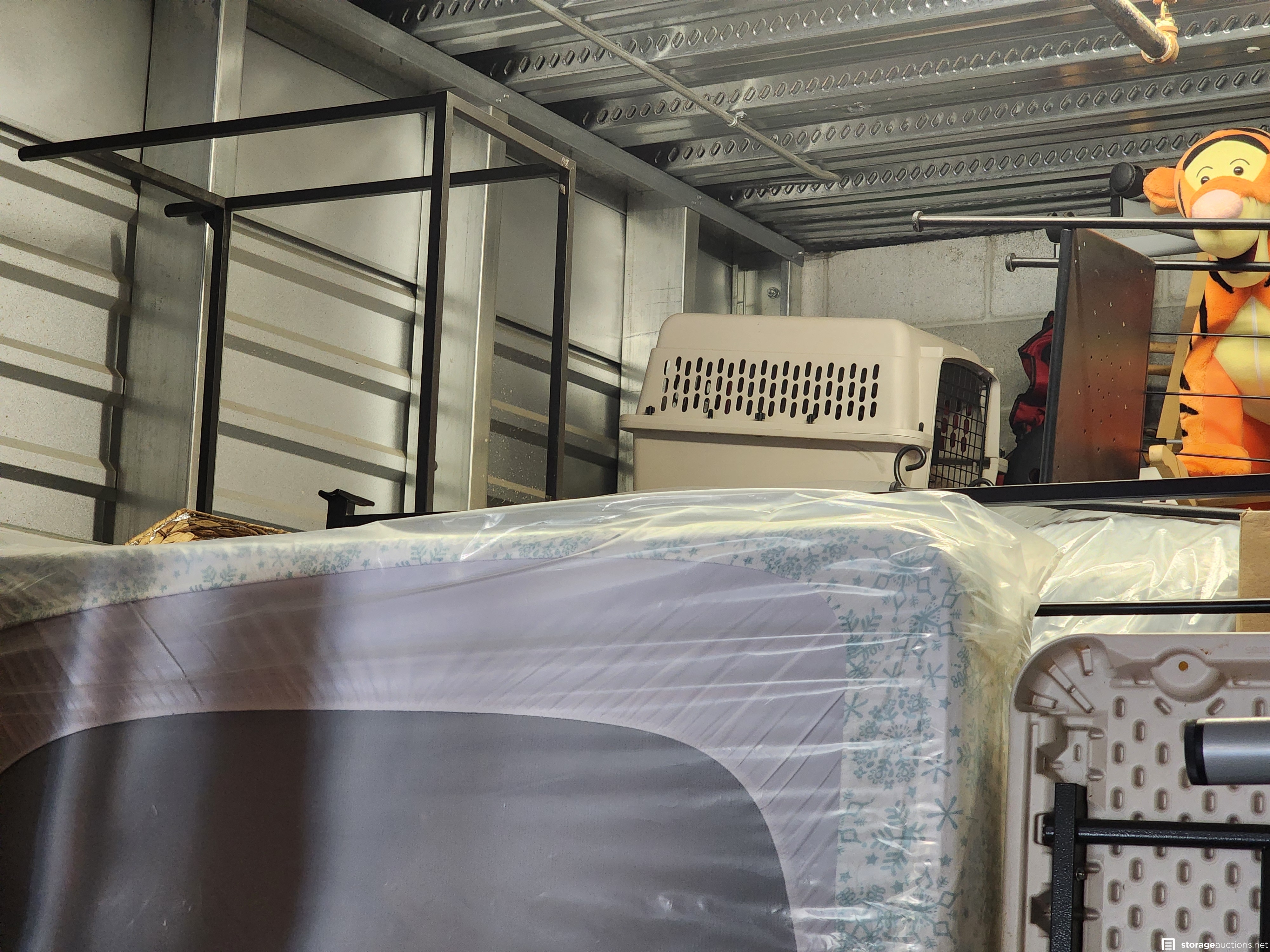 Unit appears to have T.V., hutch, corner shelf, plastic table, Queen mattress, hope chest, lamp, foot massager, Tigger toy, pet carrier, clothes, HP printer, totes, step ladder, wooden chairs, wicker baskets, boxes.