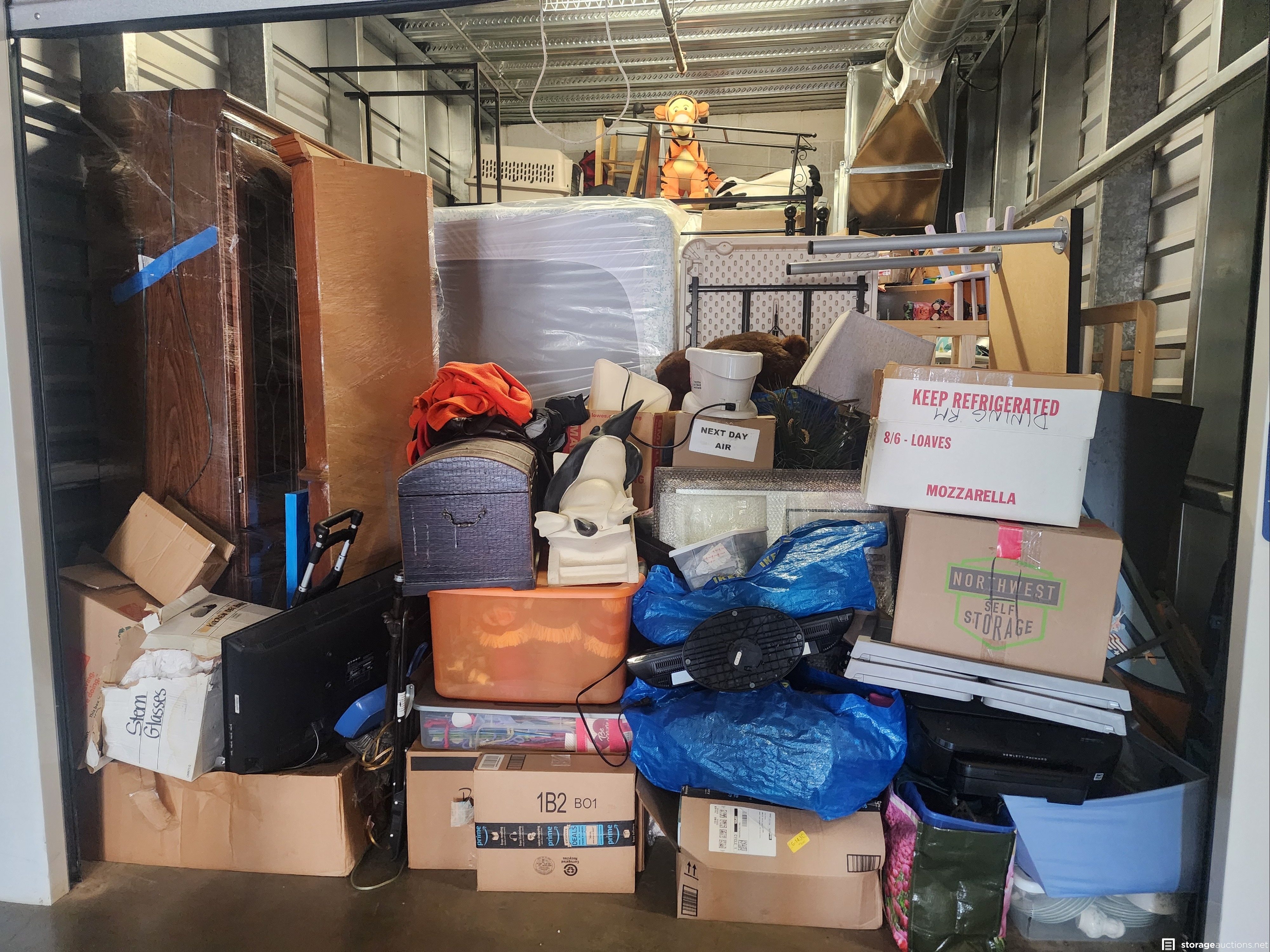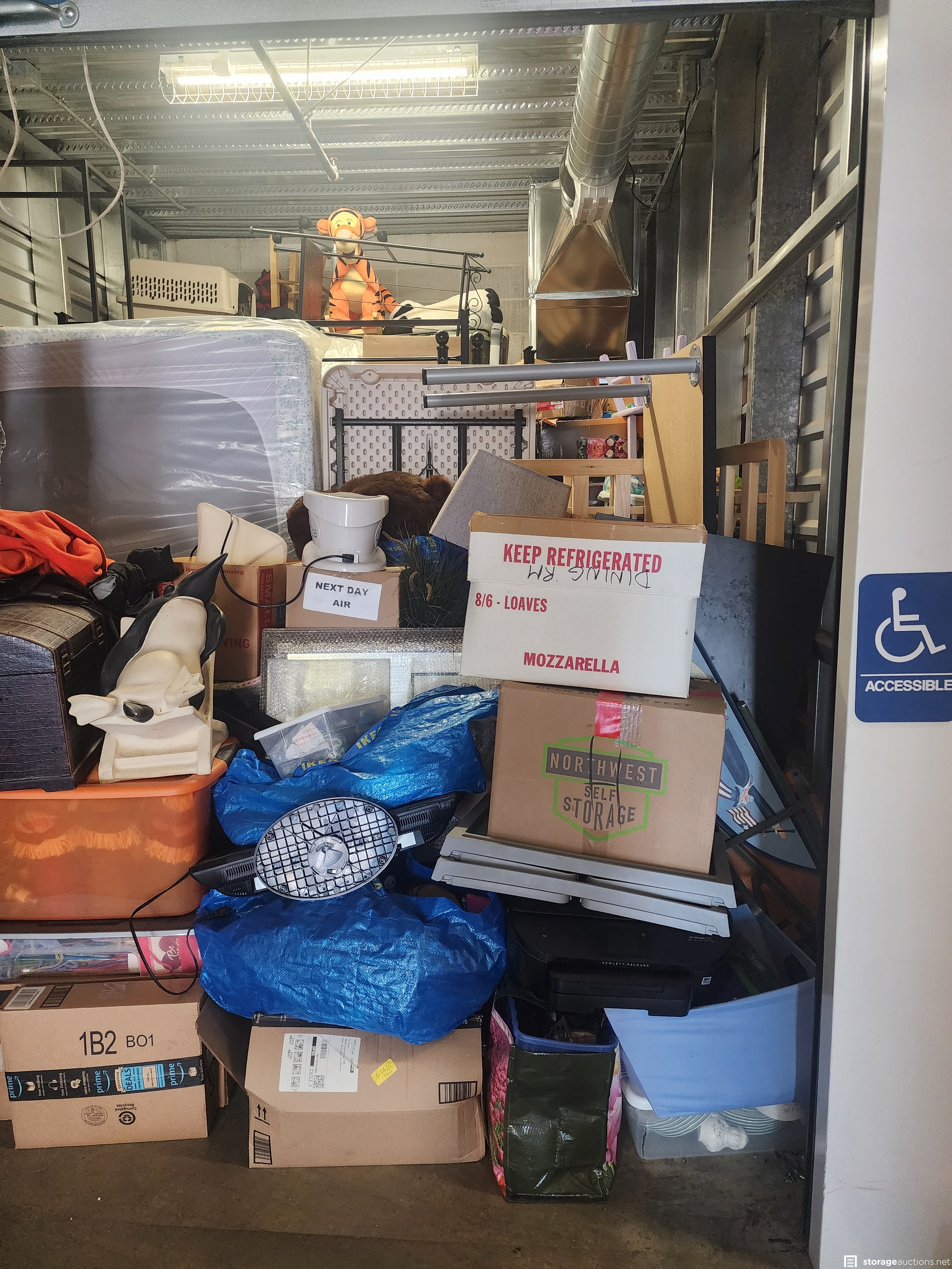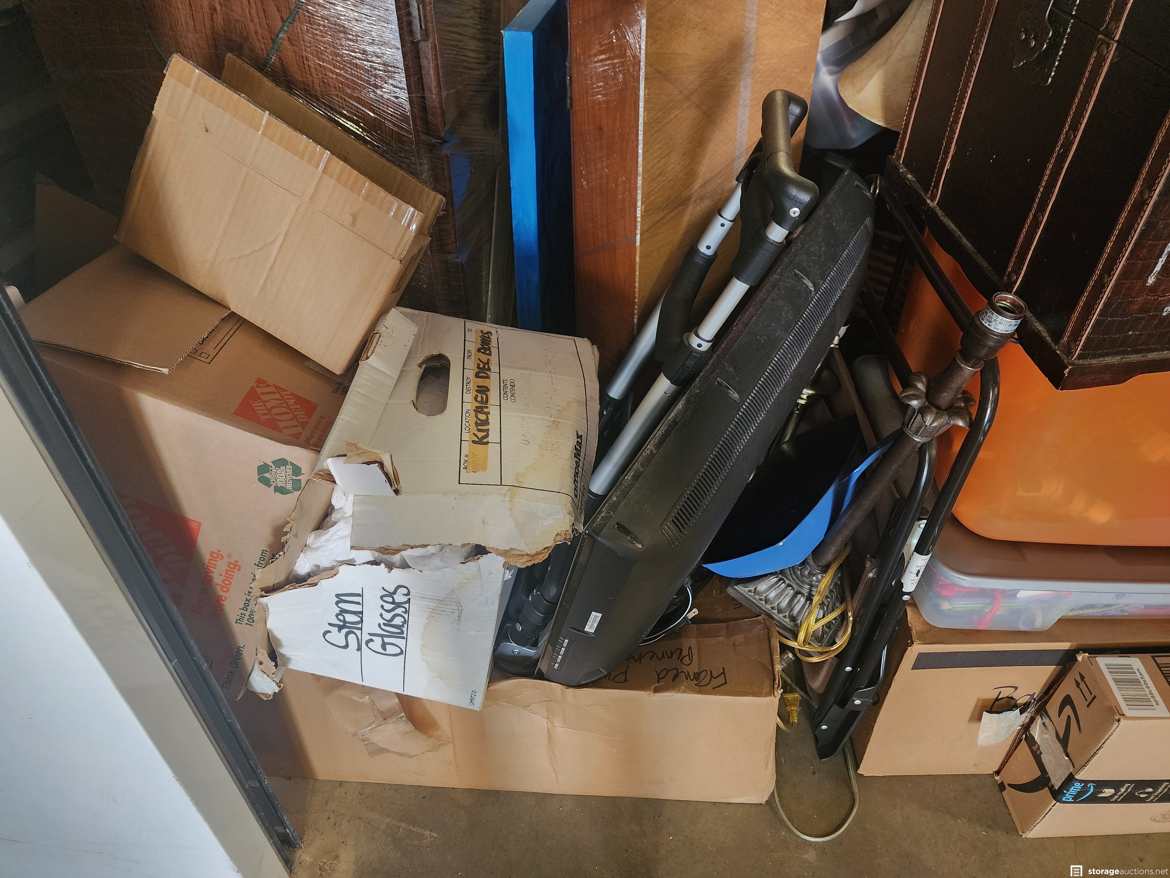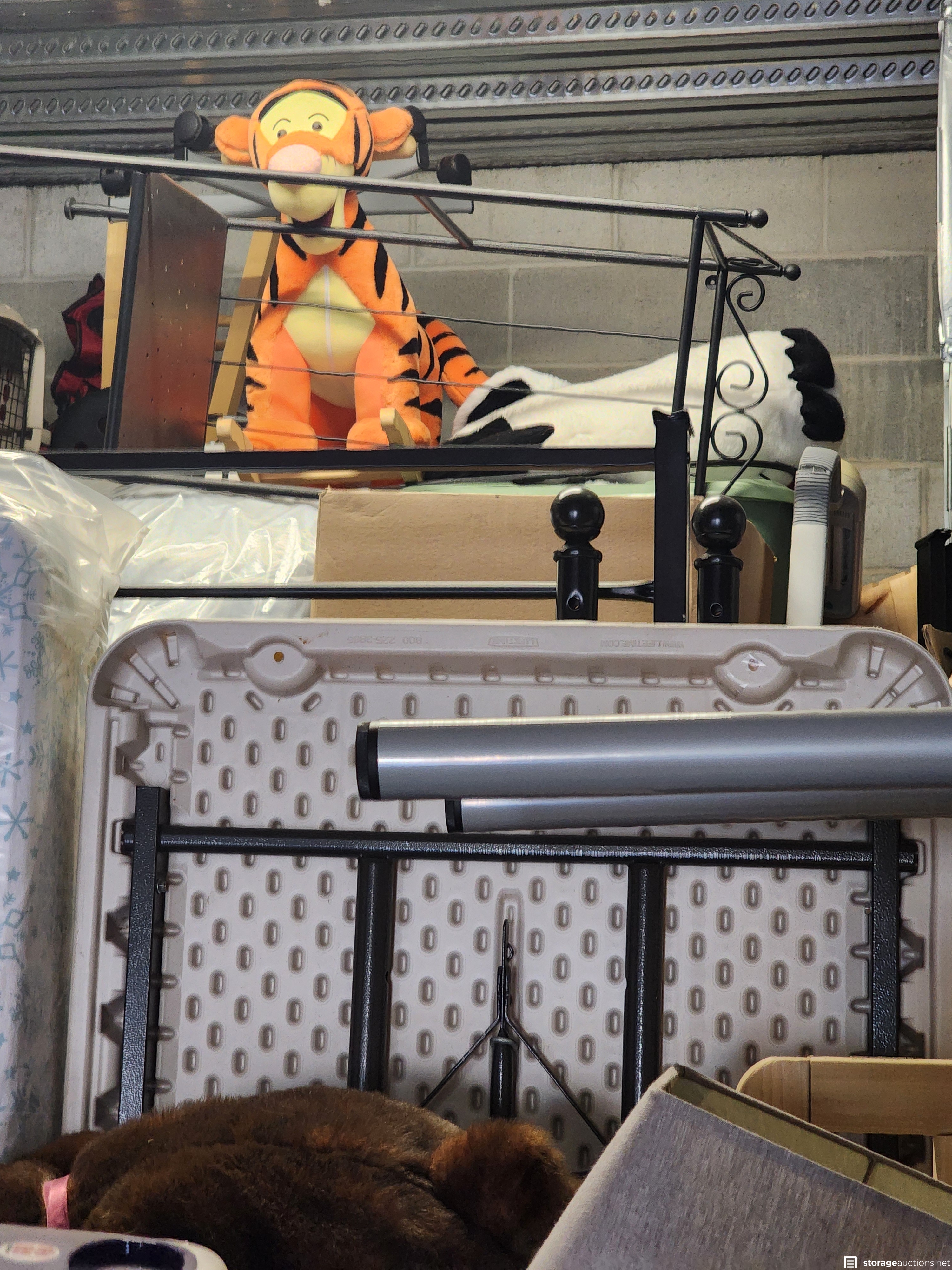 Unit appears to have T.V., hutch, corner shelf, plastic table, Queen mattress, hope chest, lamp, foot massager, Tigger toy, pet carrier, clothes, HP printer, totes, step ladder, wooden chairs, wicker baskets, boxes.