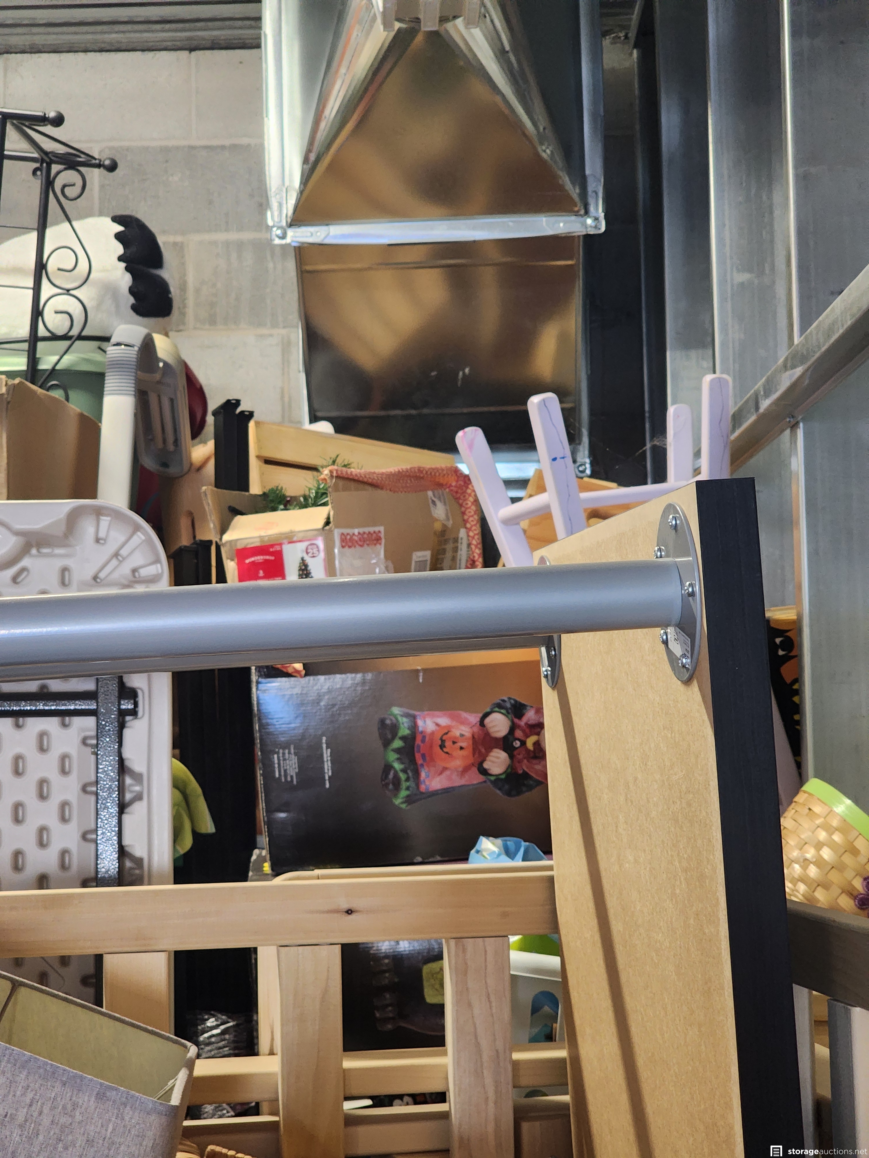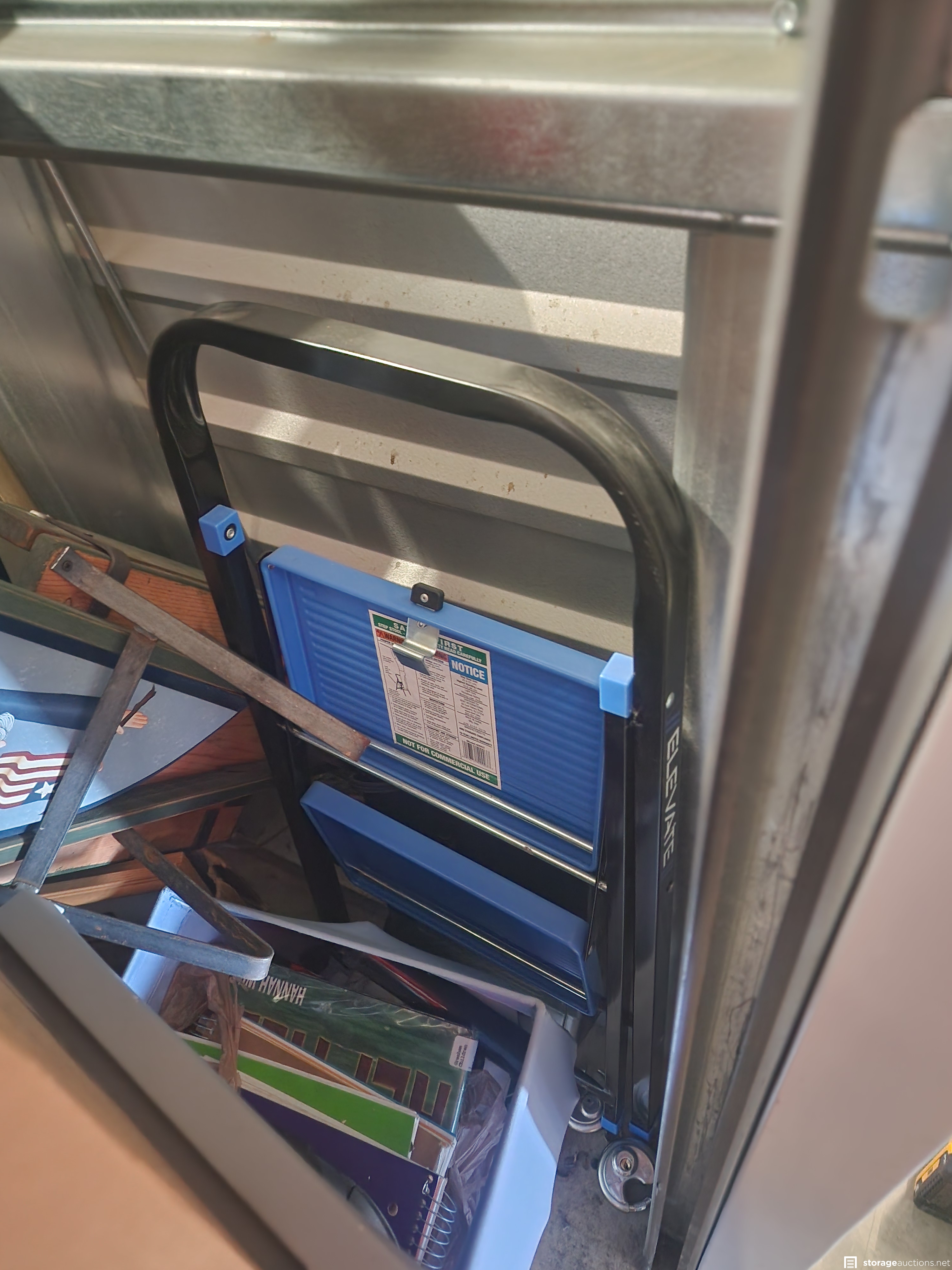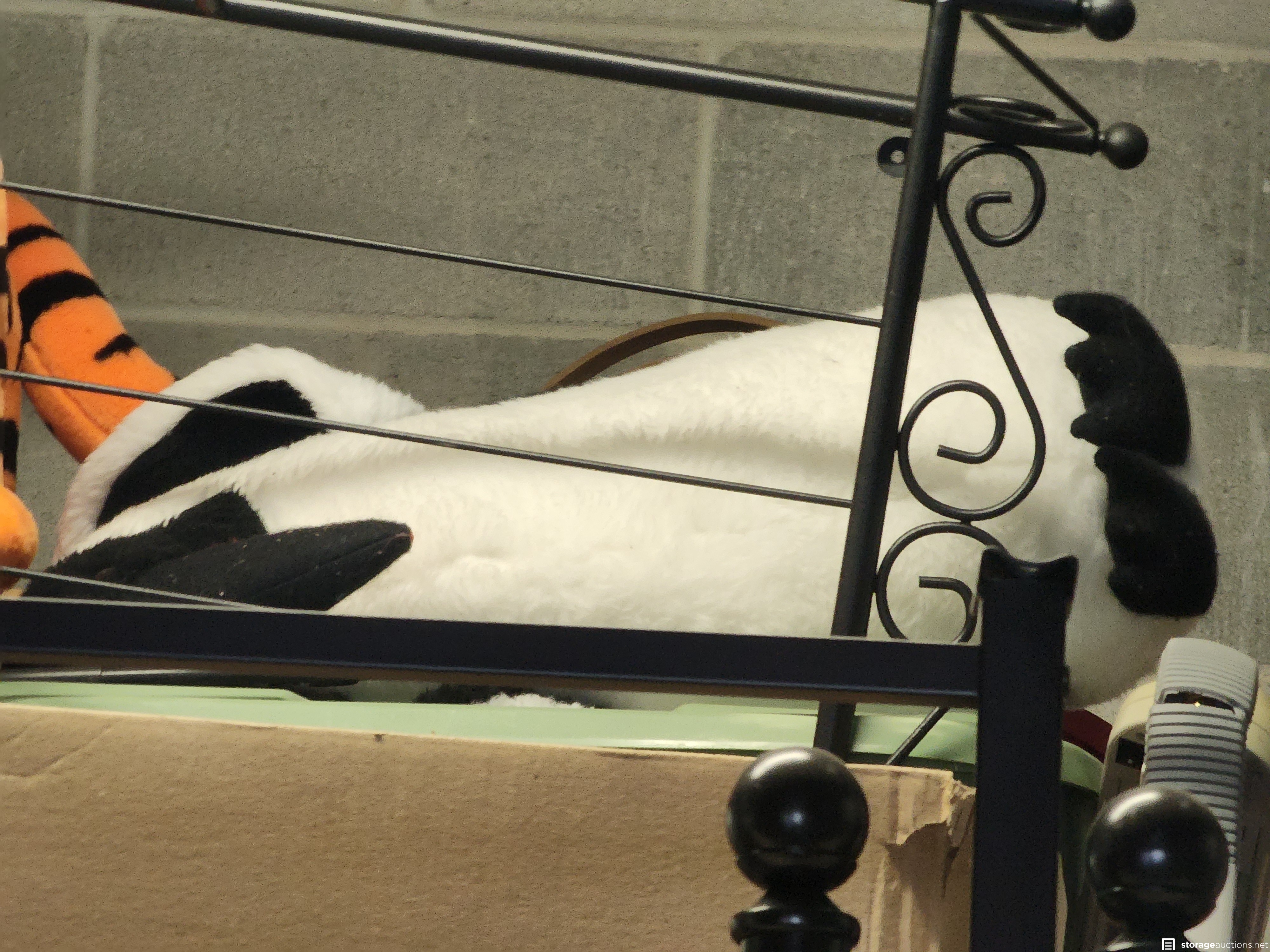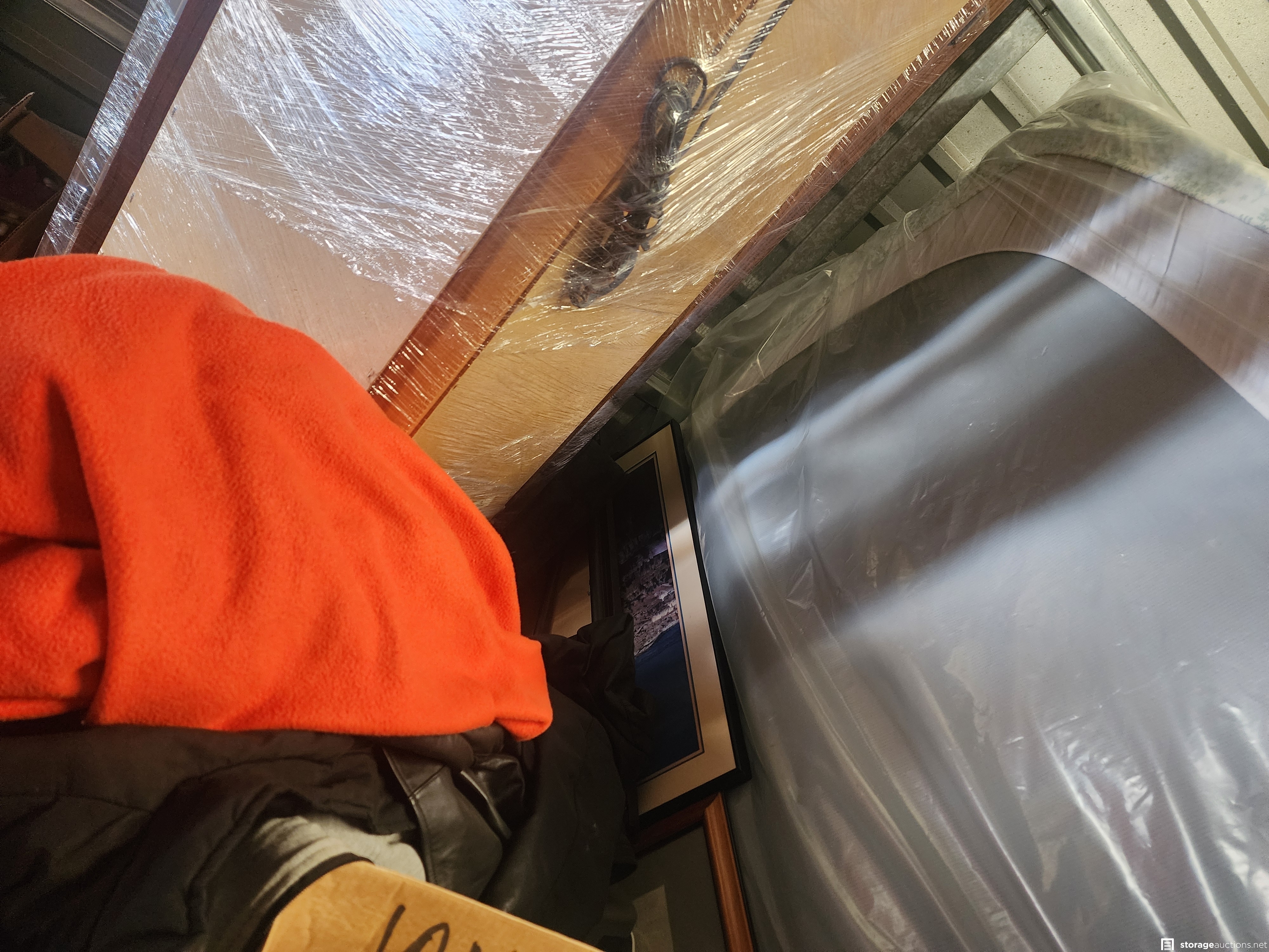 Unit appears to have T.V., hutch, corner shelf, plastic table, Queen mattress, hope chest, lamp, foot massager, Tigger toy, pet carrier, clothes, HP printer, totes, step ladder, wooden chairs, wicker baskets, boxes.