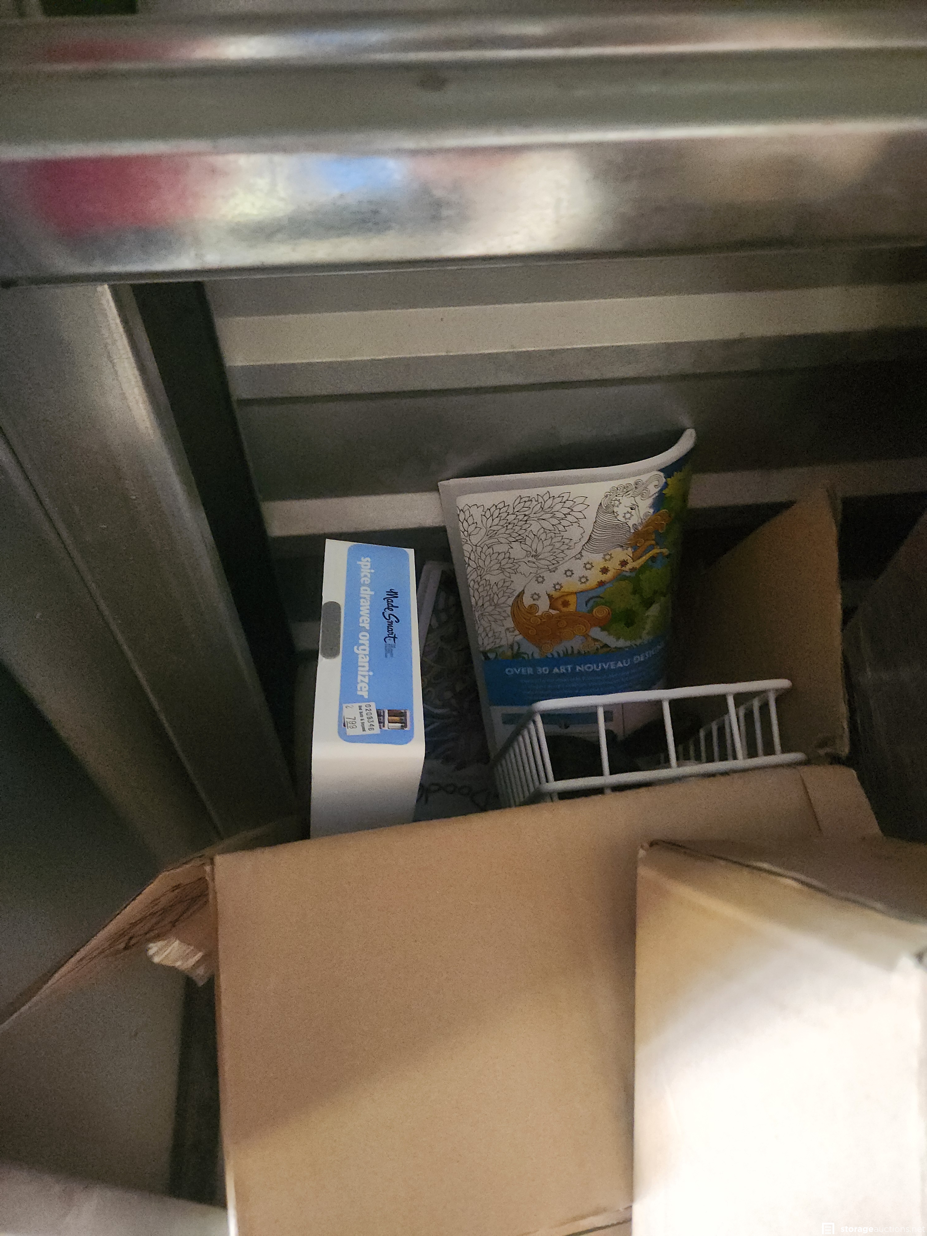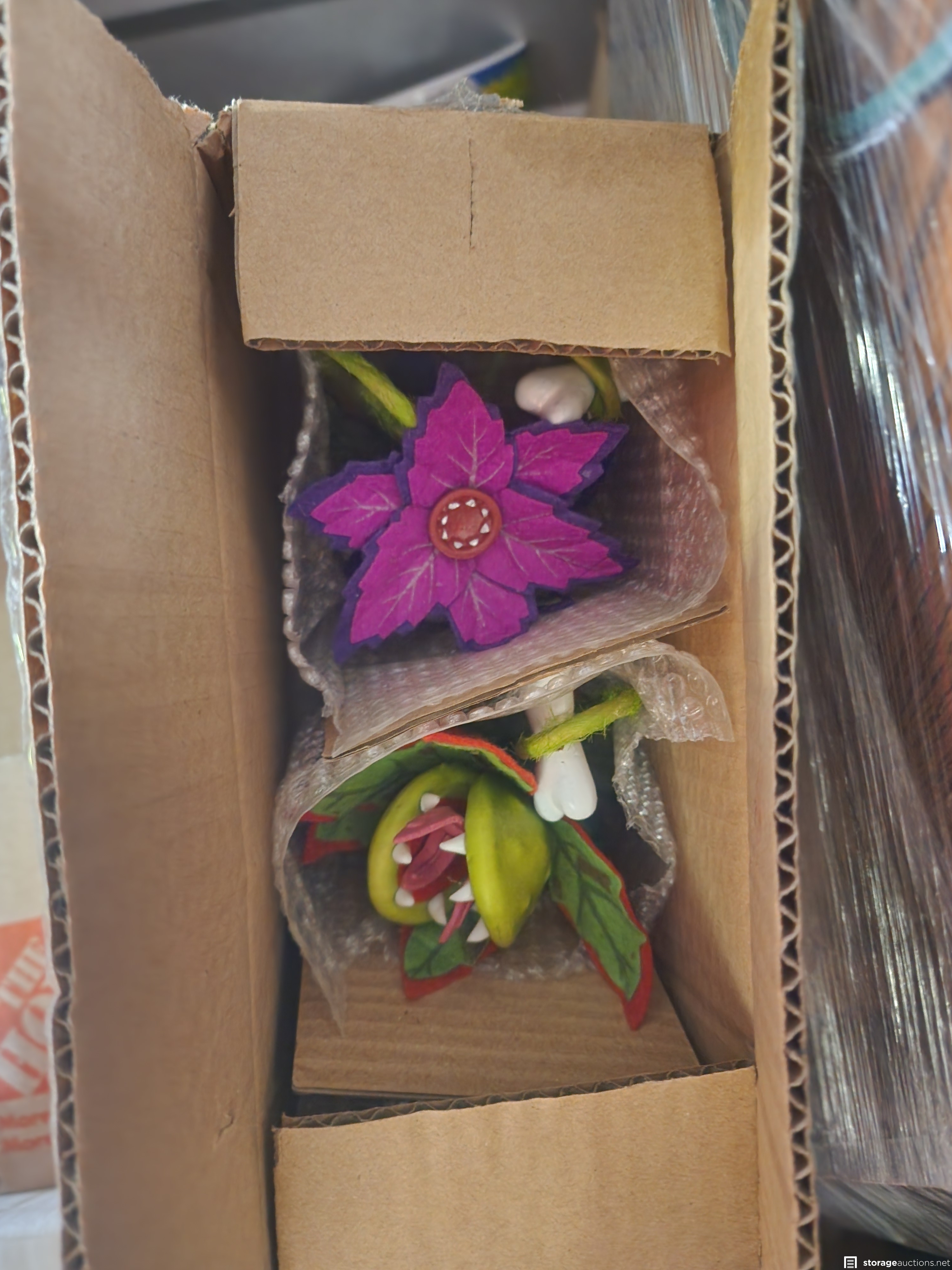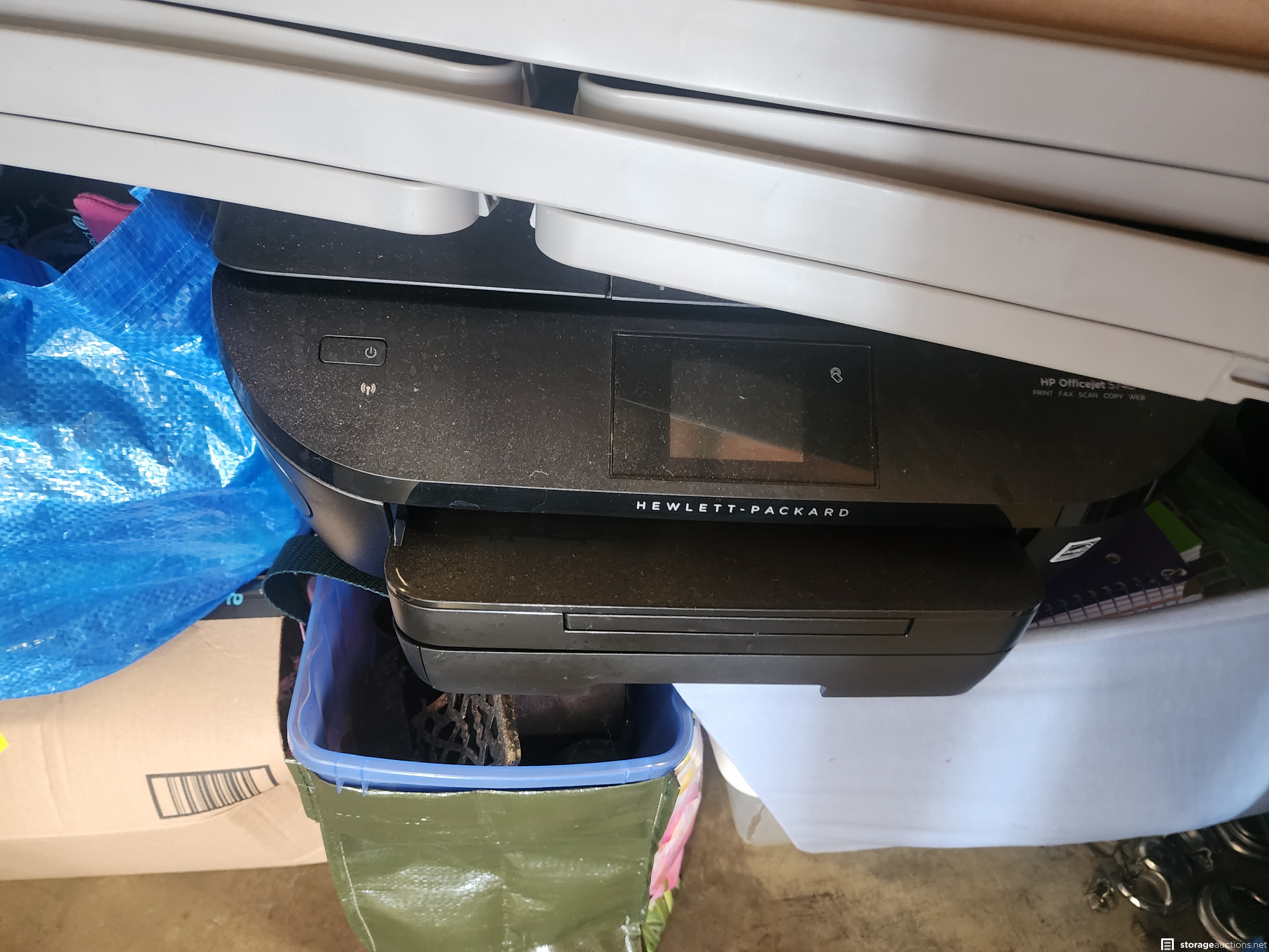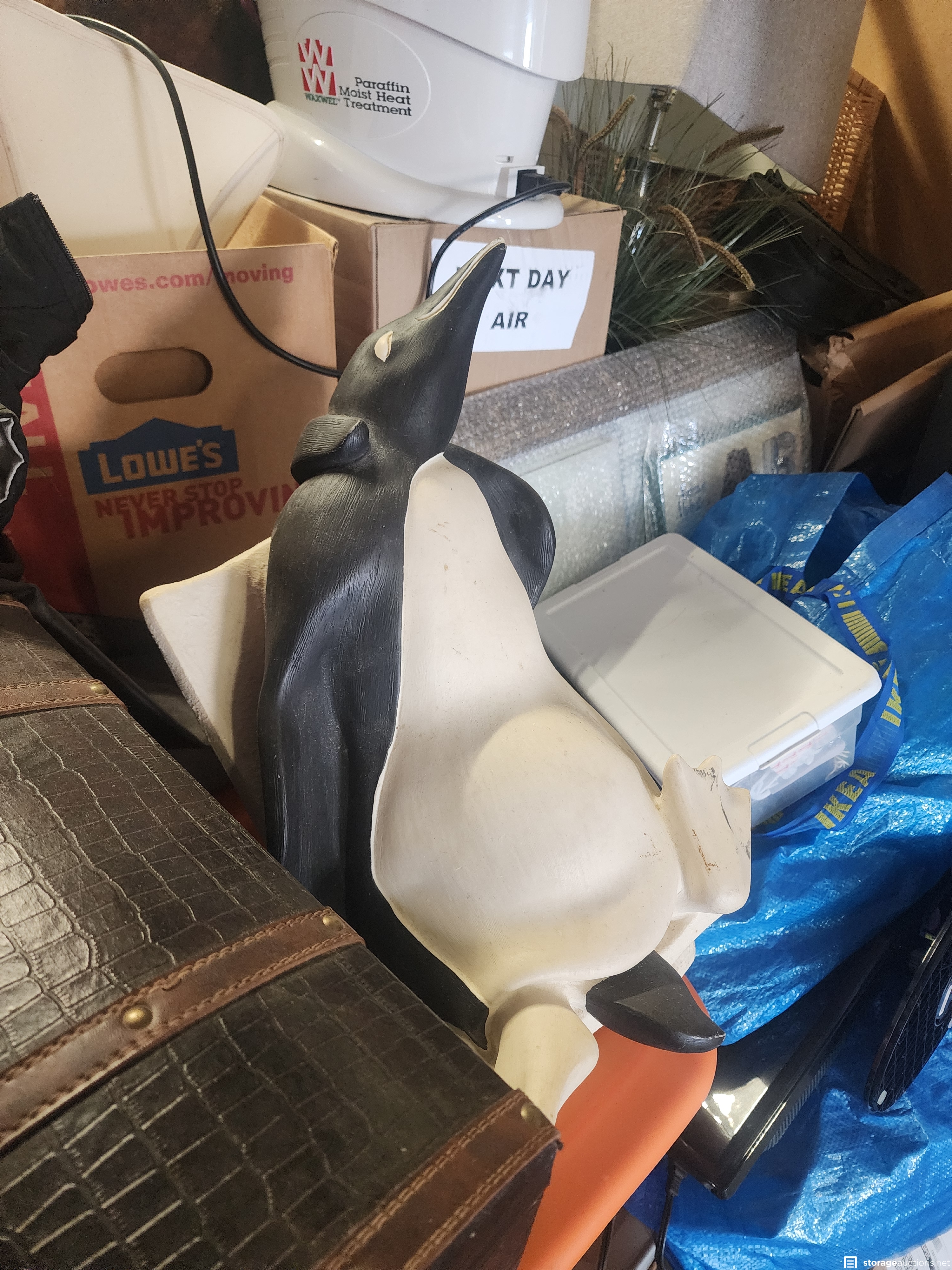 Unit appears to have T.V., hutch, corner shelf, plastic table, Queen mattress, hope chest, lamp, foot massager, Tigger toy, pet carrier, clothes, HP printer, totes, step ladder, wooden chairs, wicker baskets, boxes.