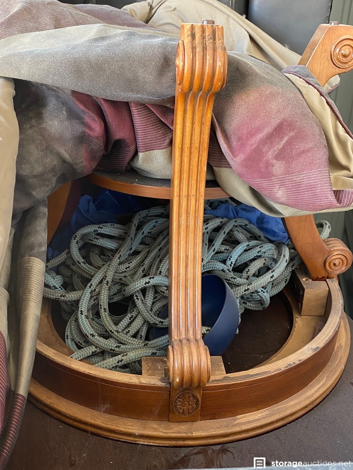 Wheelbarrow, floor rug, tables, gas can, sofa, rope, camping chair