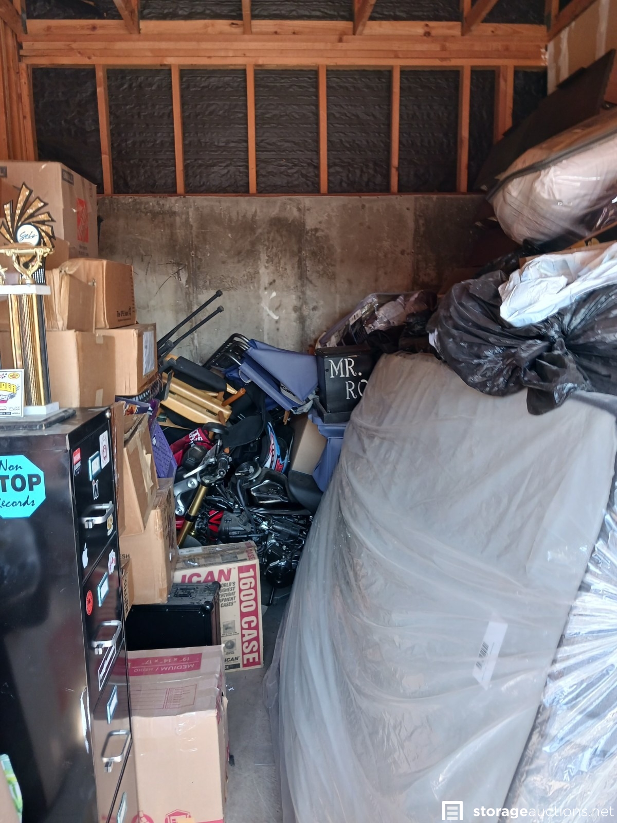 Pedestal bed with drawers, pillow top mattress, file cabinet, small tool box, vacuum, printer and misc boxes (motorcycle is not included in the sale)