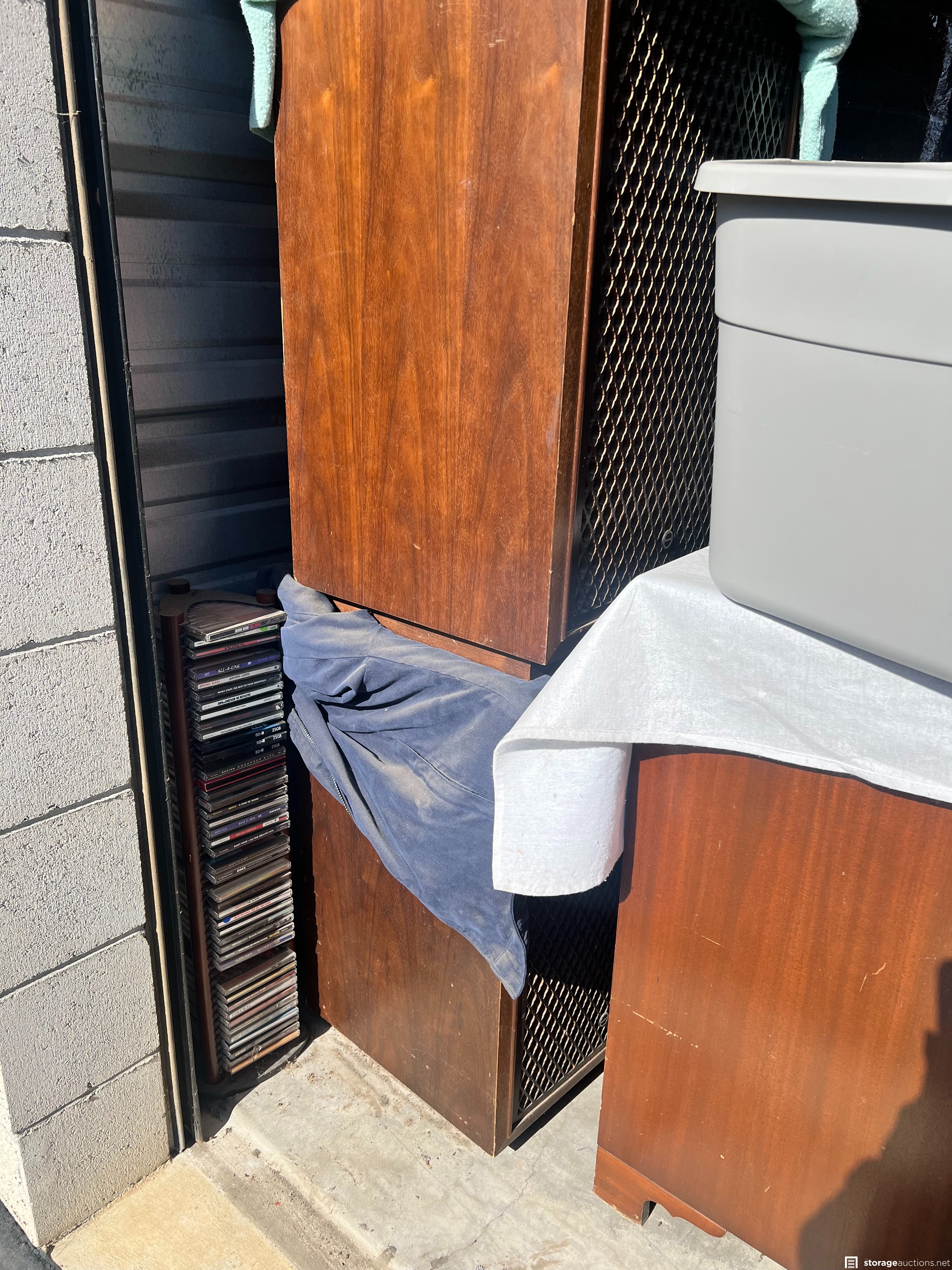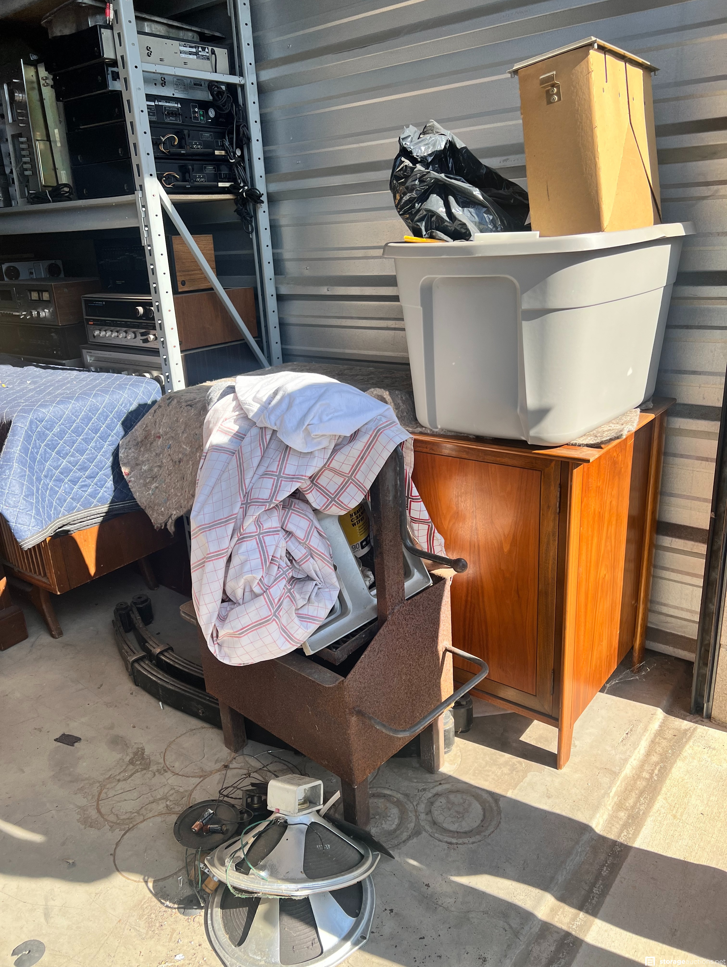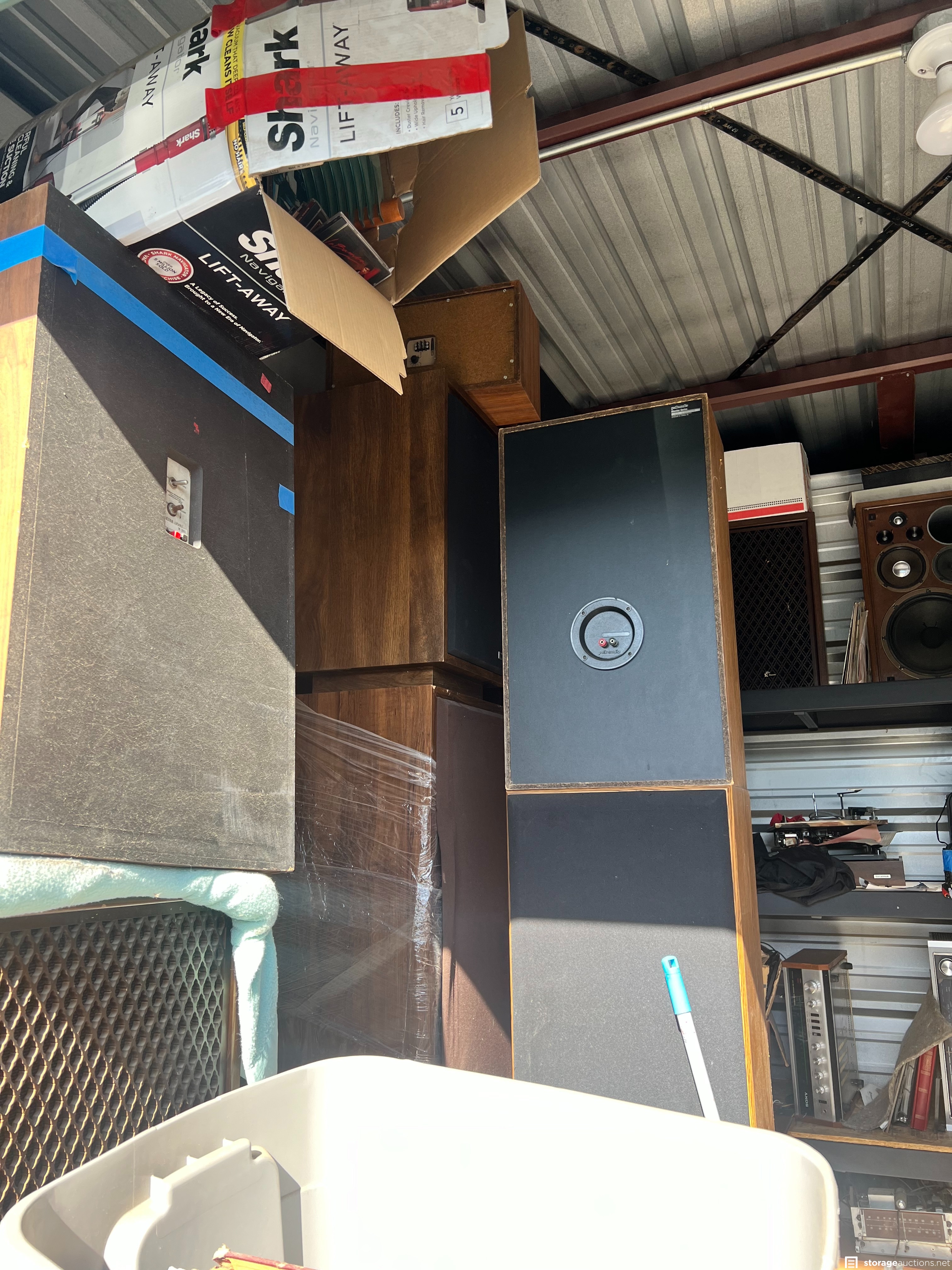 Items appear to consist of but are not limited to: multiple pairs of box speakers, CD's, vinyl records, small BBQ pit, leaf springs, multiple home stereo units of various brands, shelving units, small cabinets