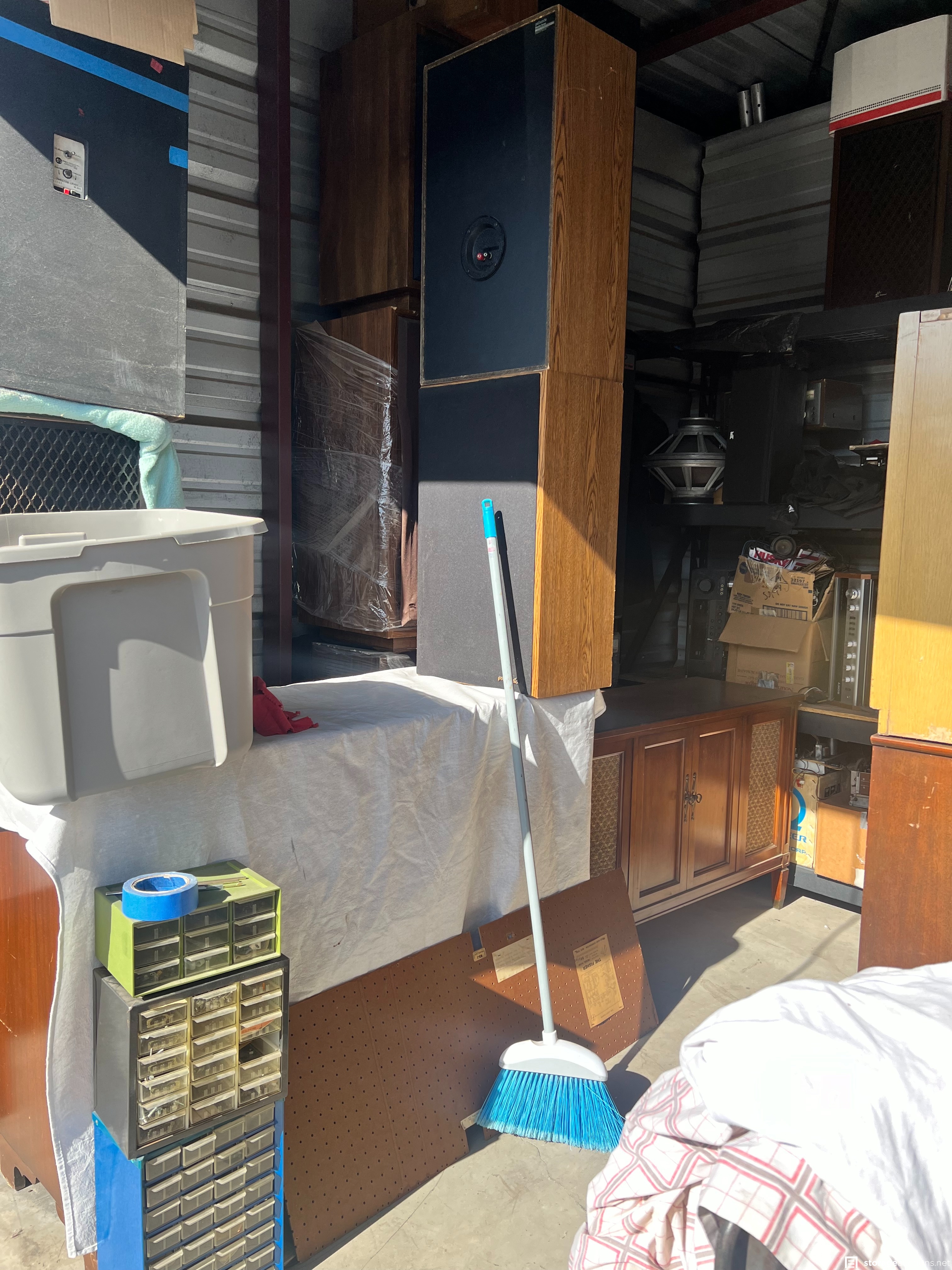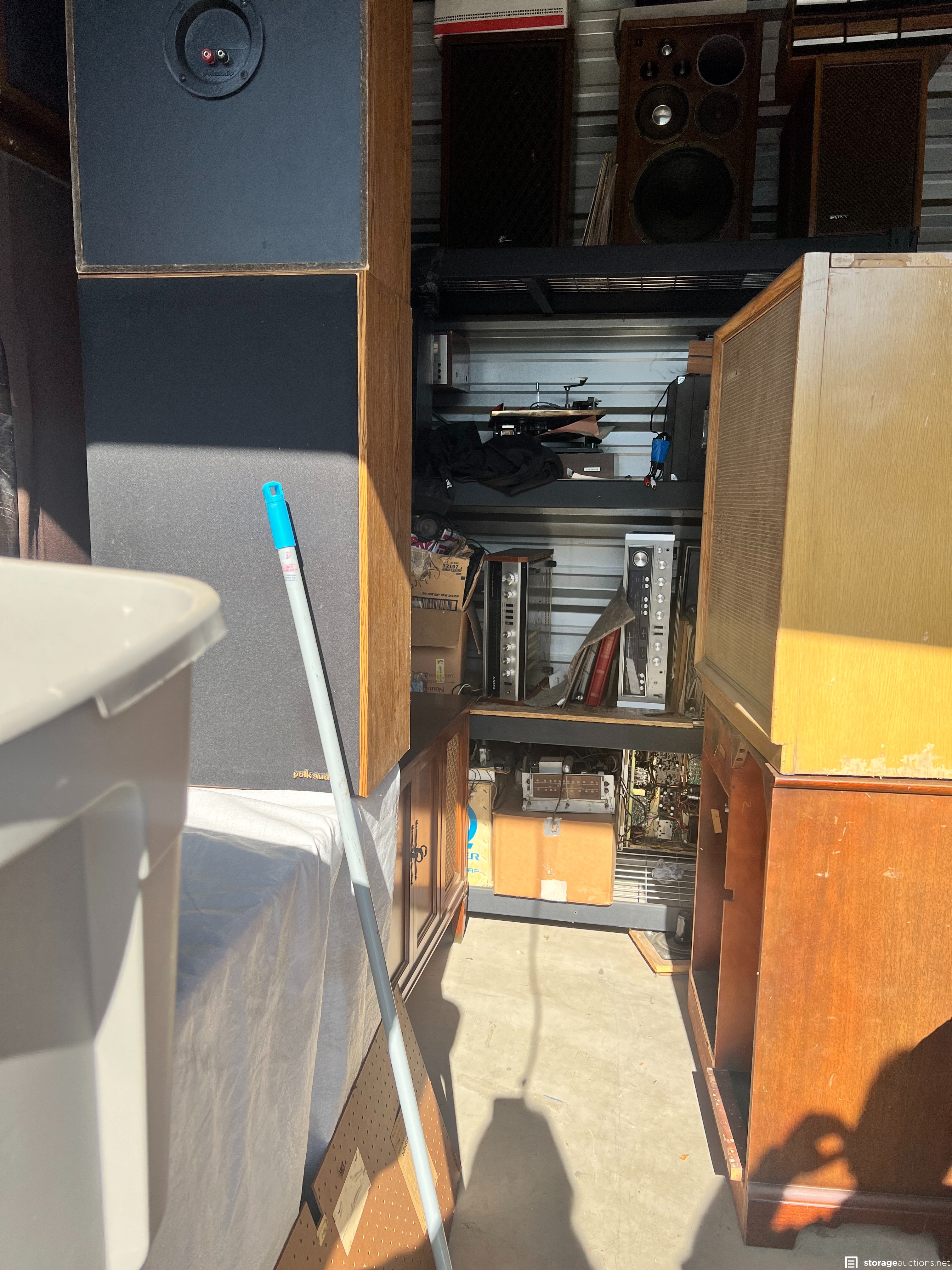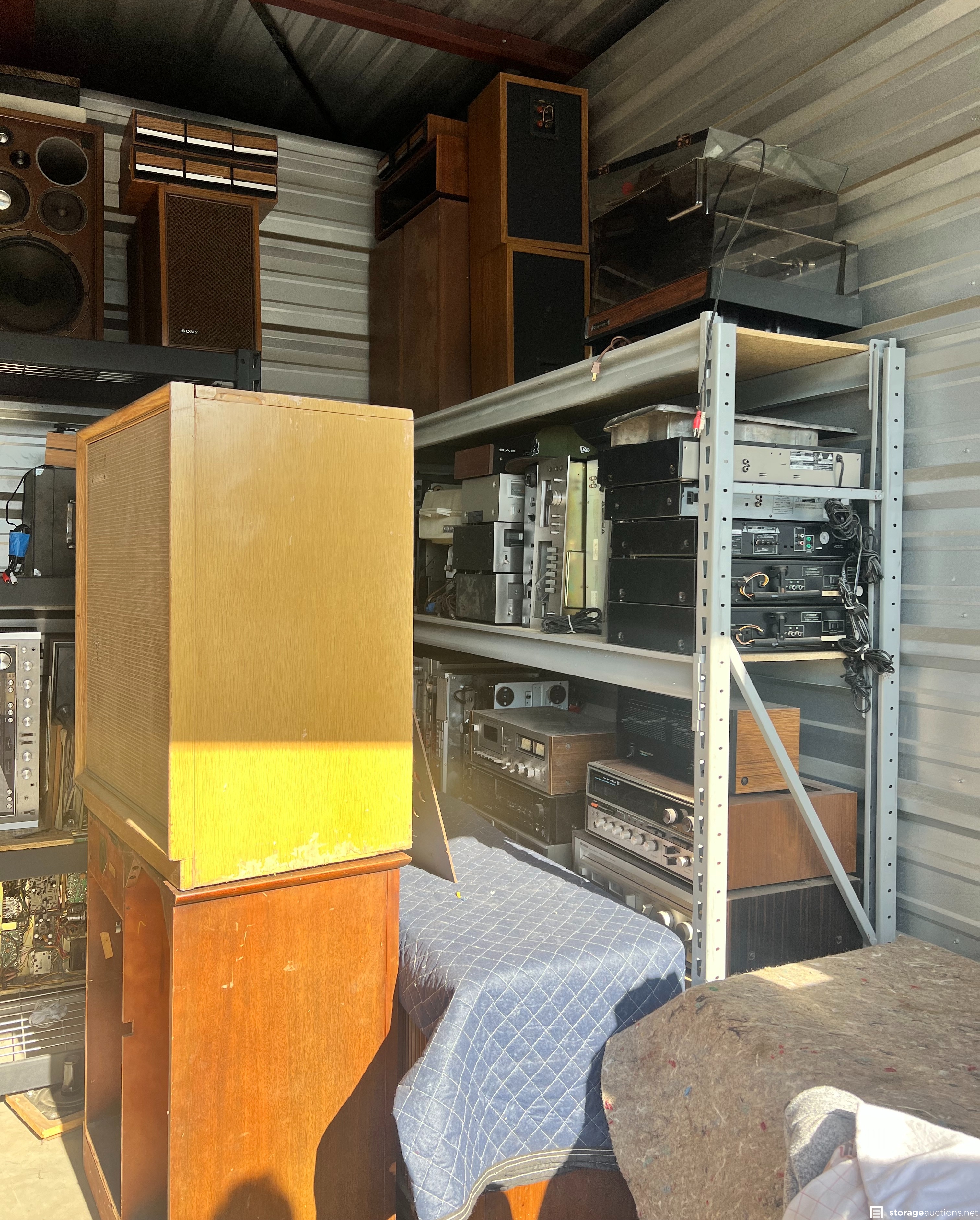 Items appear to consist of but are not limited to: multiple pairs of box speakers, CD's, vinyl records, small BBQ pit, leaf springs, multiple home stereo units of various brands, shelving units, small cabinets