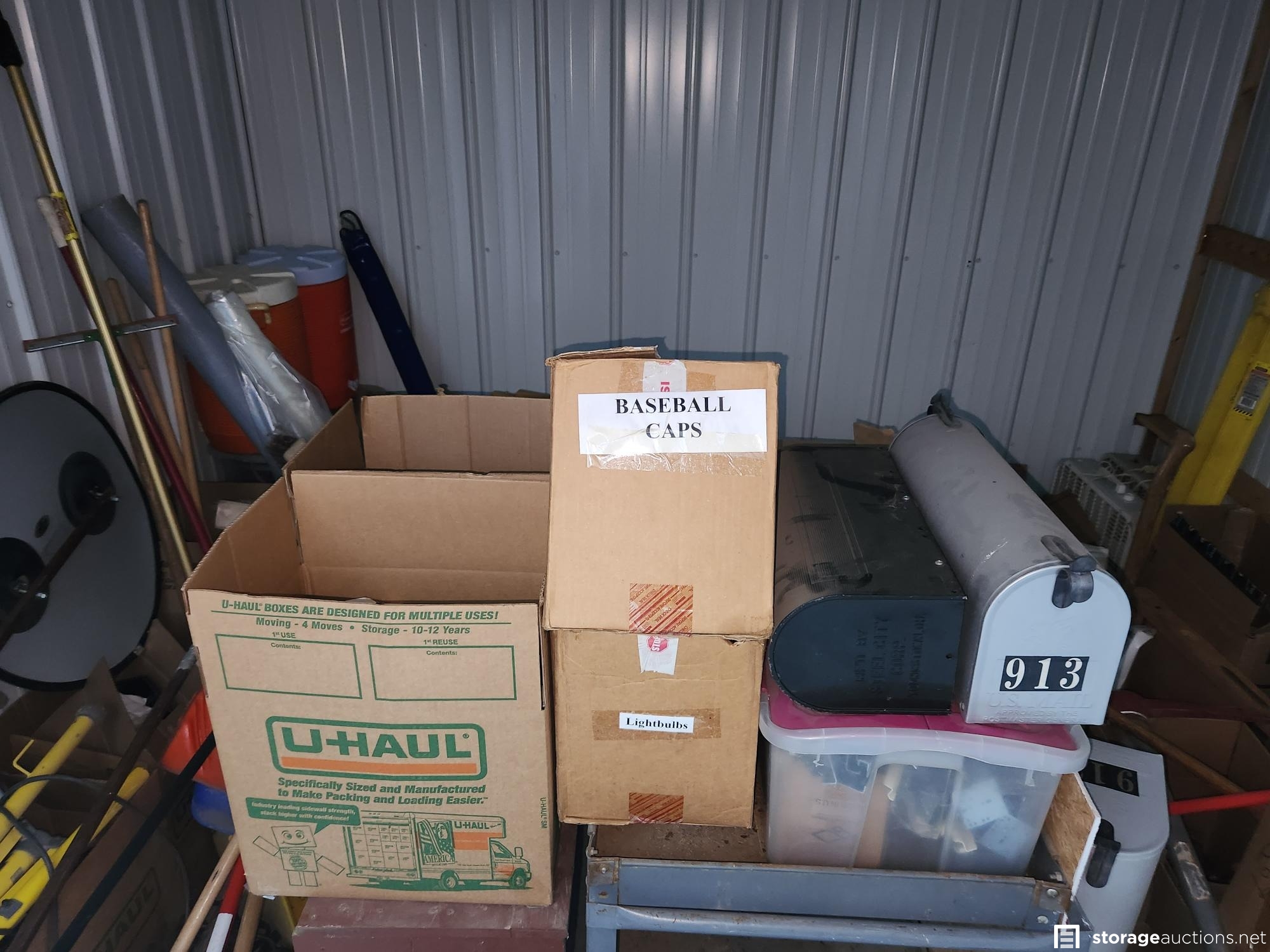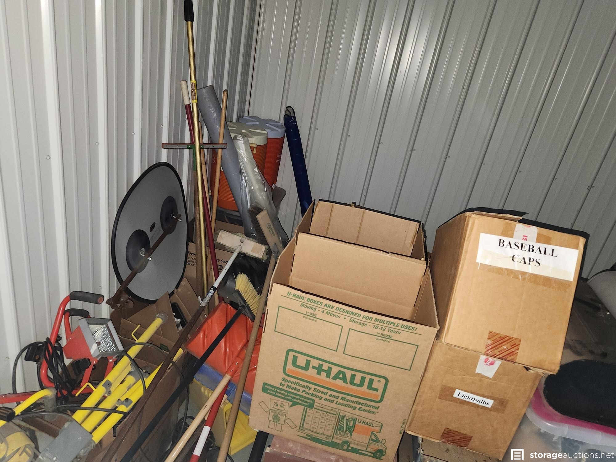 Looks like - Totes, boxes, tools, lights, snow shovel, rope, fans, mail boxes, light bulbs, water coolers, brooms, misc items