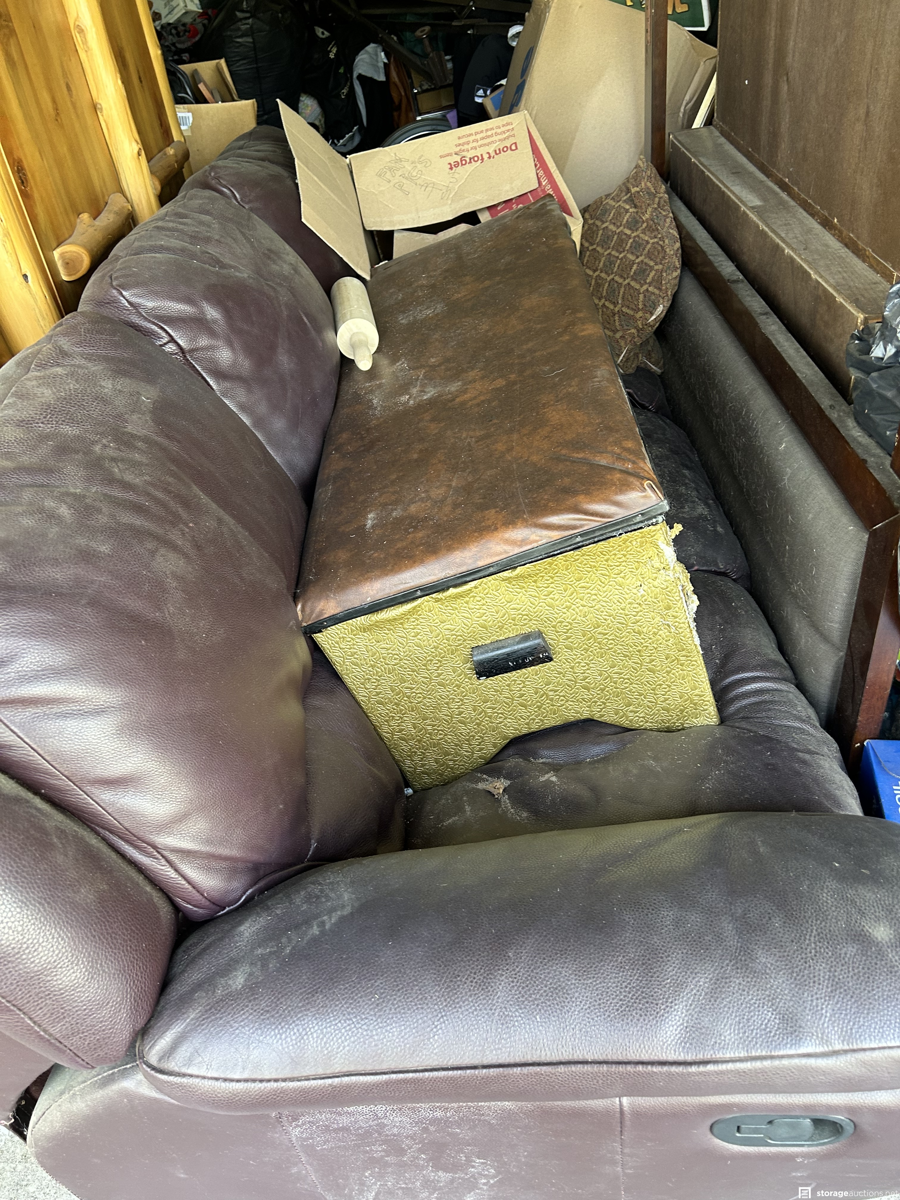 Brown leather reclining sofa, wood armoire, mini fridge, compound? bow, serving tray, wheel chair, wood cushioned headboard, cooler, MN Wild clock, storage chest, ottoman, stereo, picture frames, fishing gear, lava lamp, dining room cabinet with stained glass doors, and more