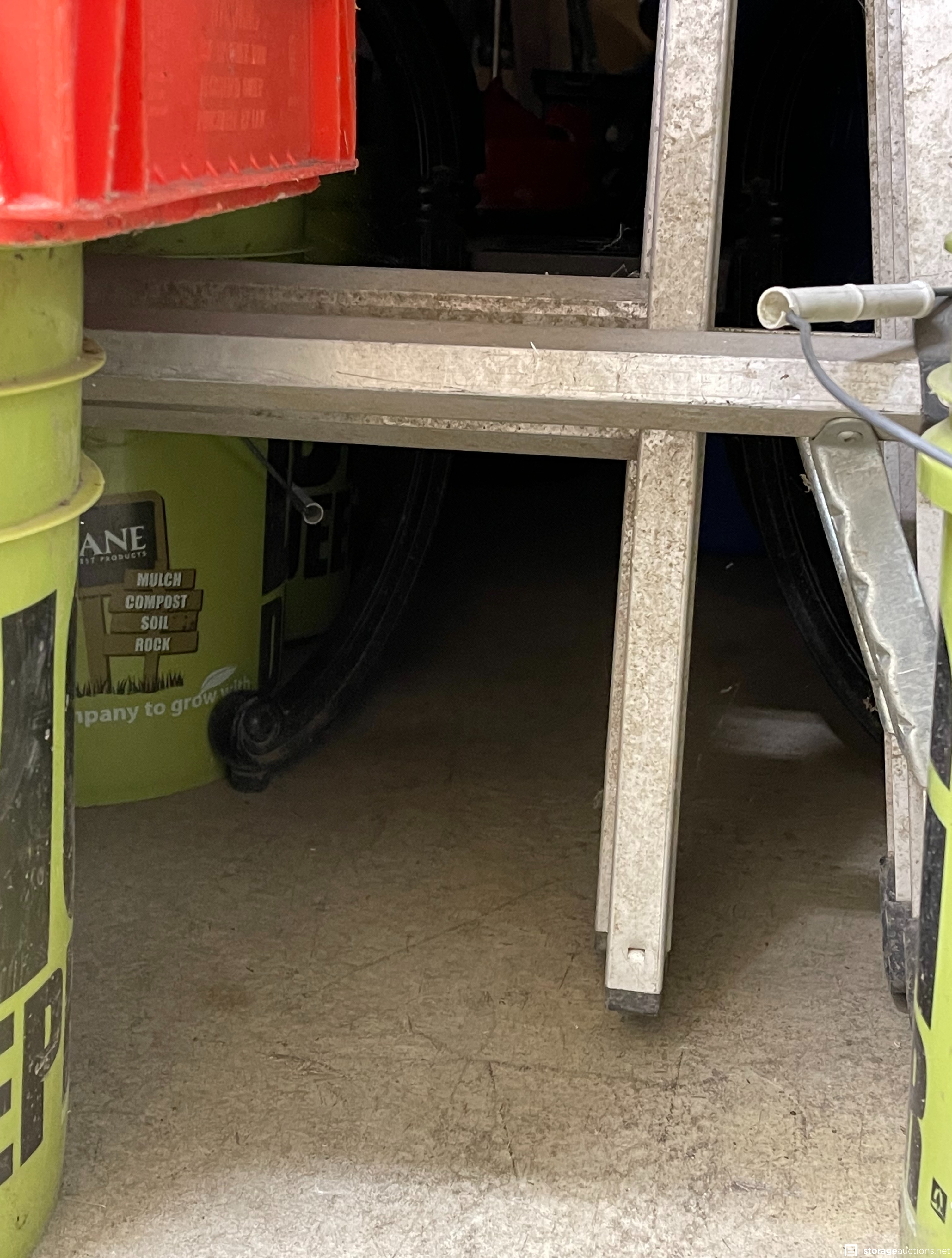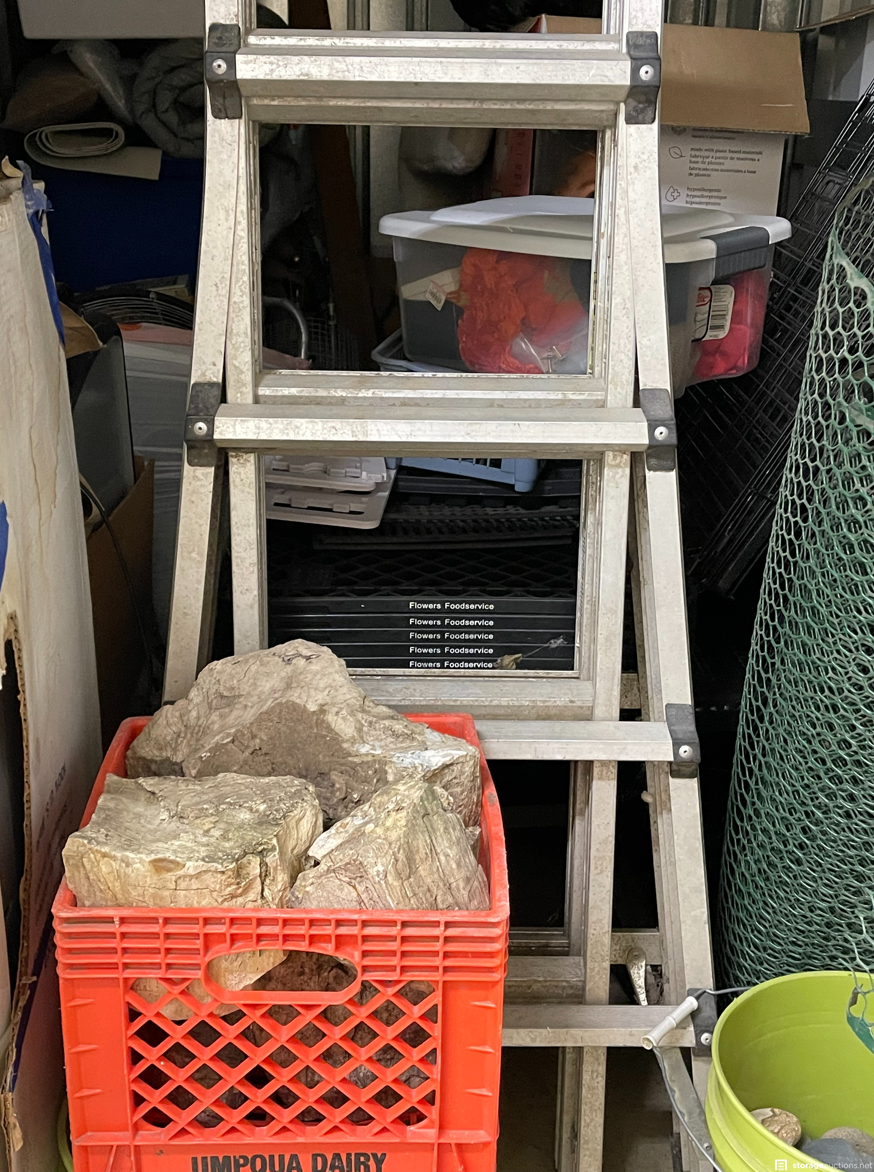 There appears to be a rock collection, aluminum ladder, metal pet crates, fan, roll of wire, air mattress, wooden plane, plastic crates, small table, swivel chair, totes, and other misc. items.