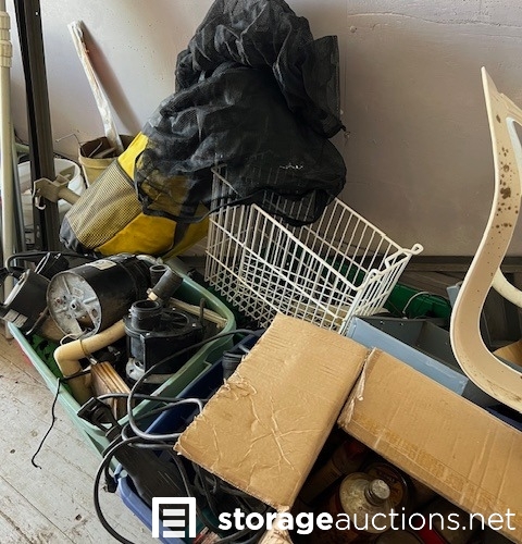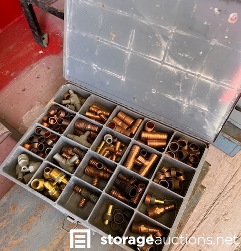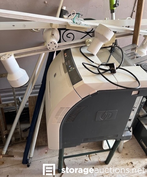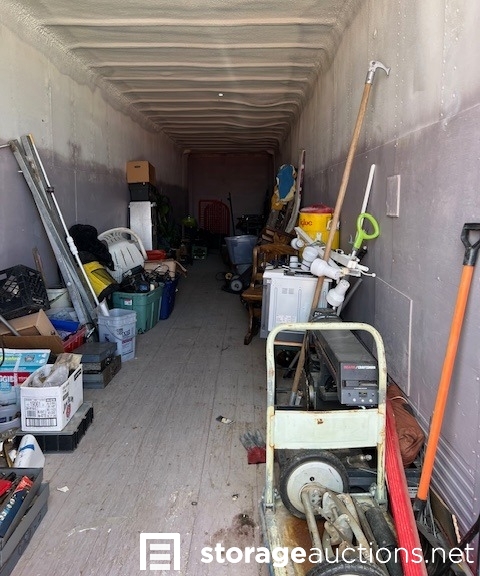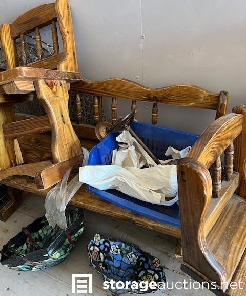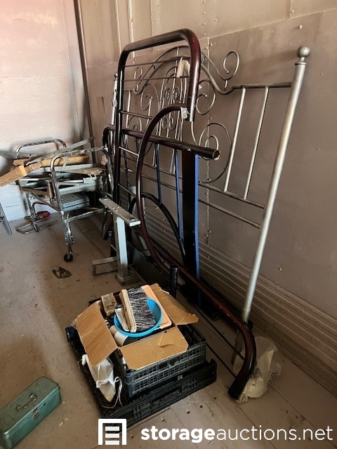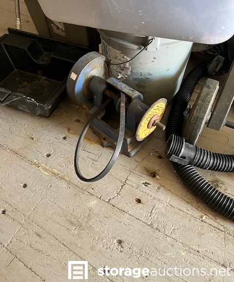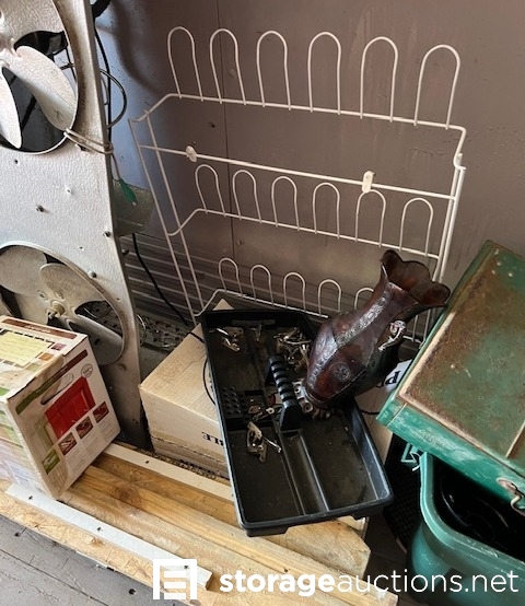 This unit has a radial saw, another table like saw, track lights, wooden chairs and bench, bed frames, printer on a stand, old fashion rotary blade mower, Coleman stove, cd's, glass shelf, 2 beautiful stained glass light fixtures, several metal tool organizers most with locking lids some have copper fittings and other types of tools.