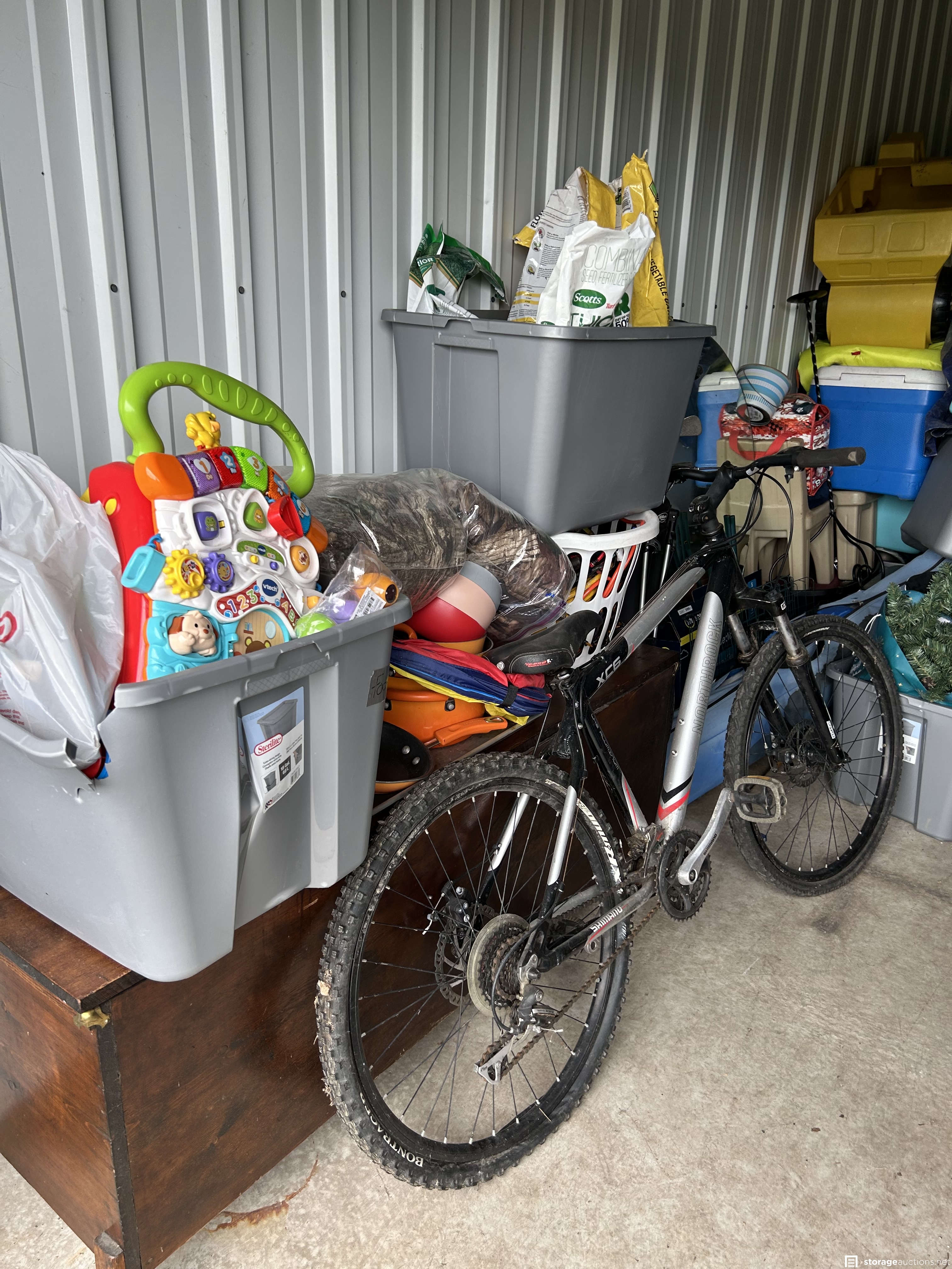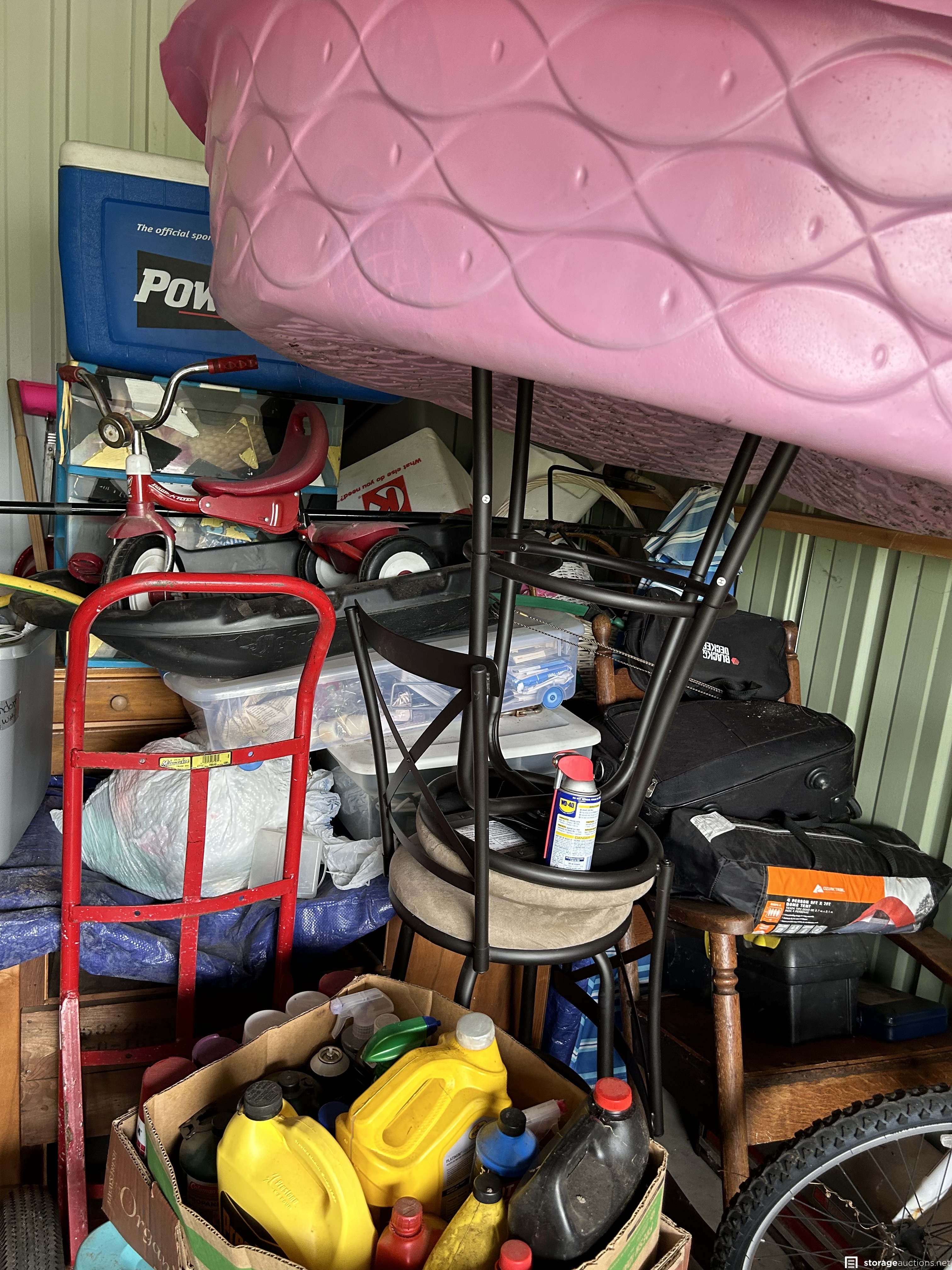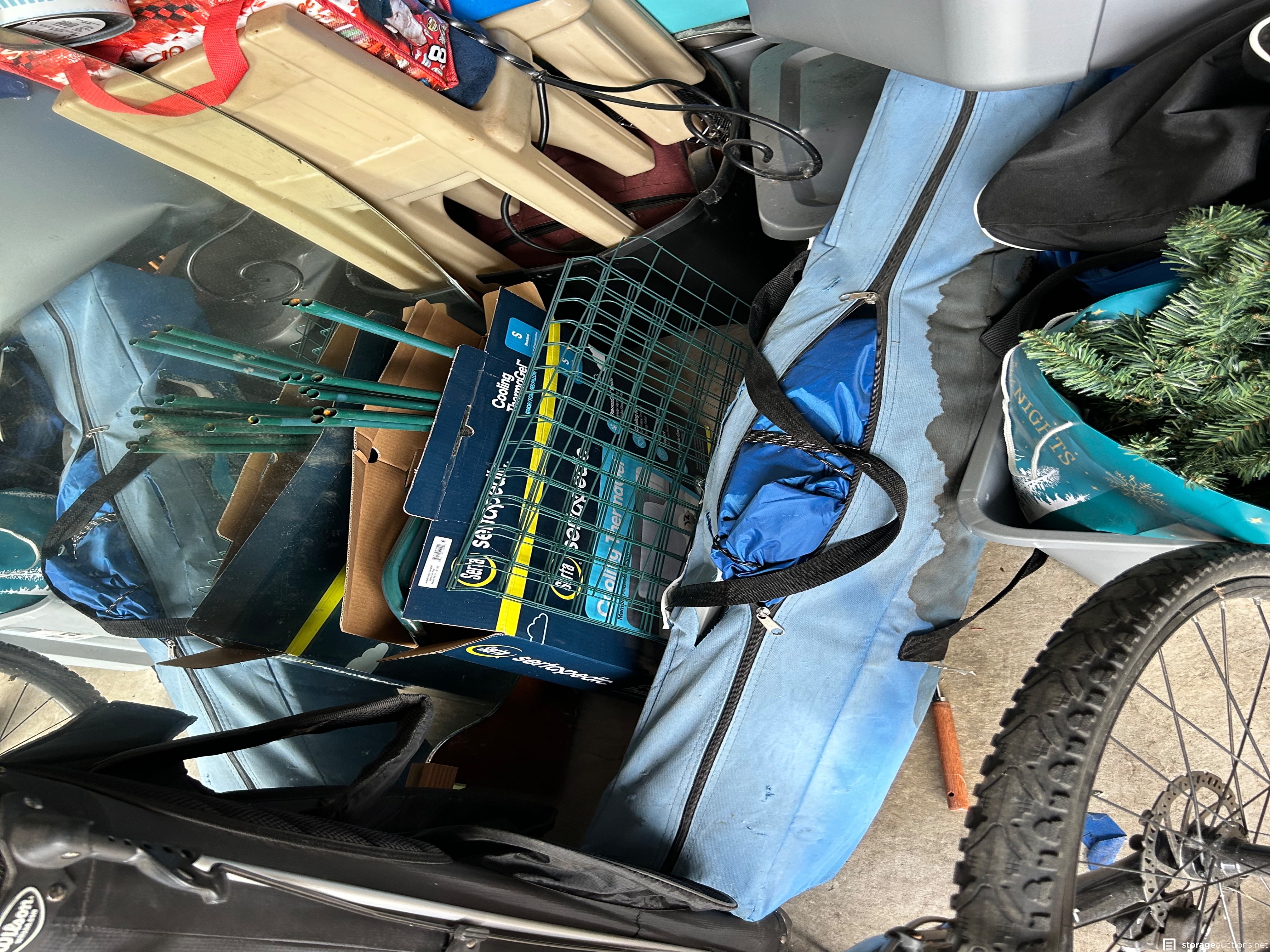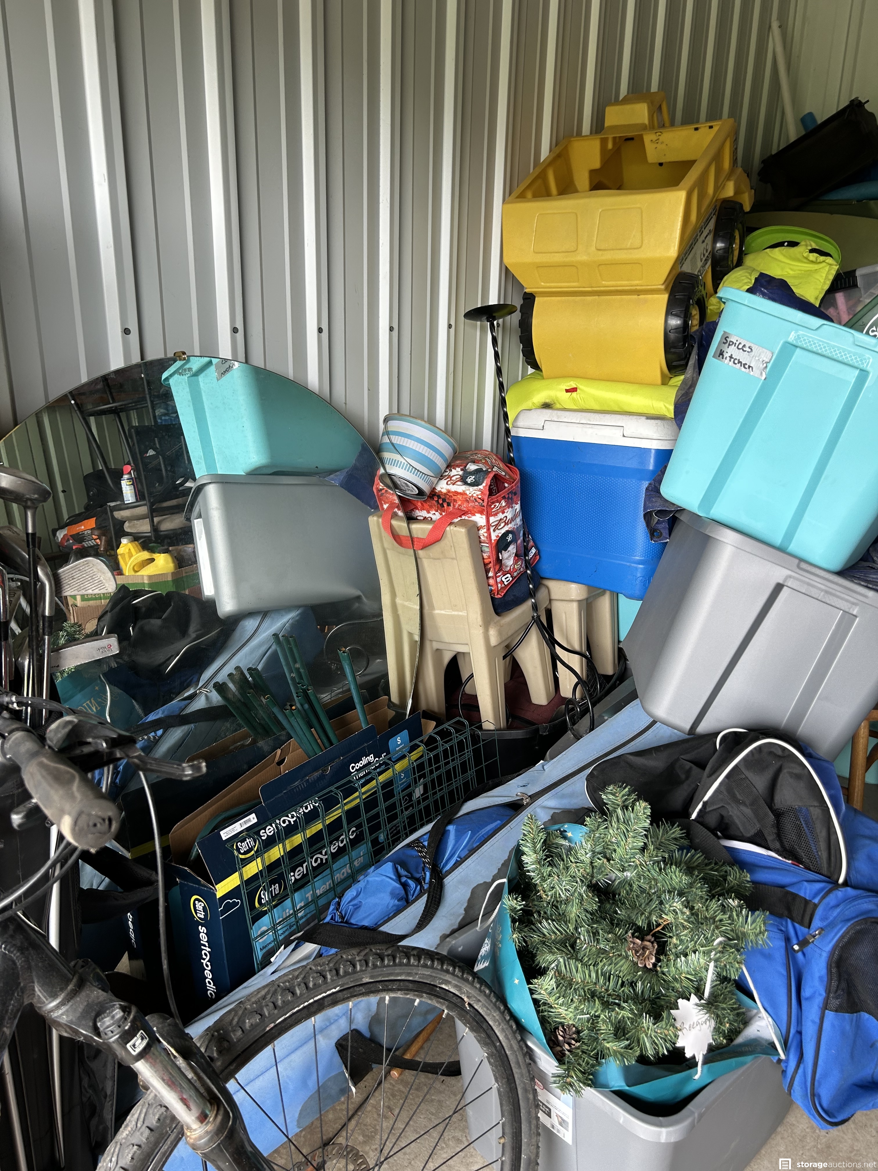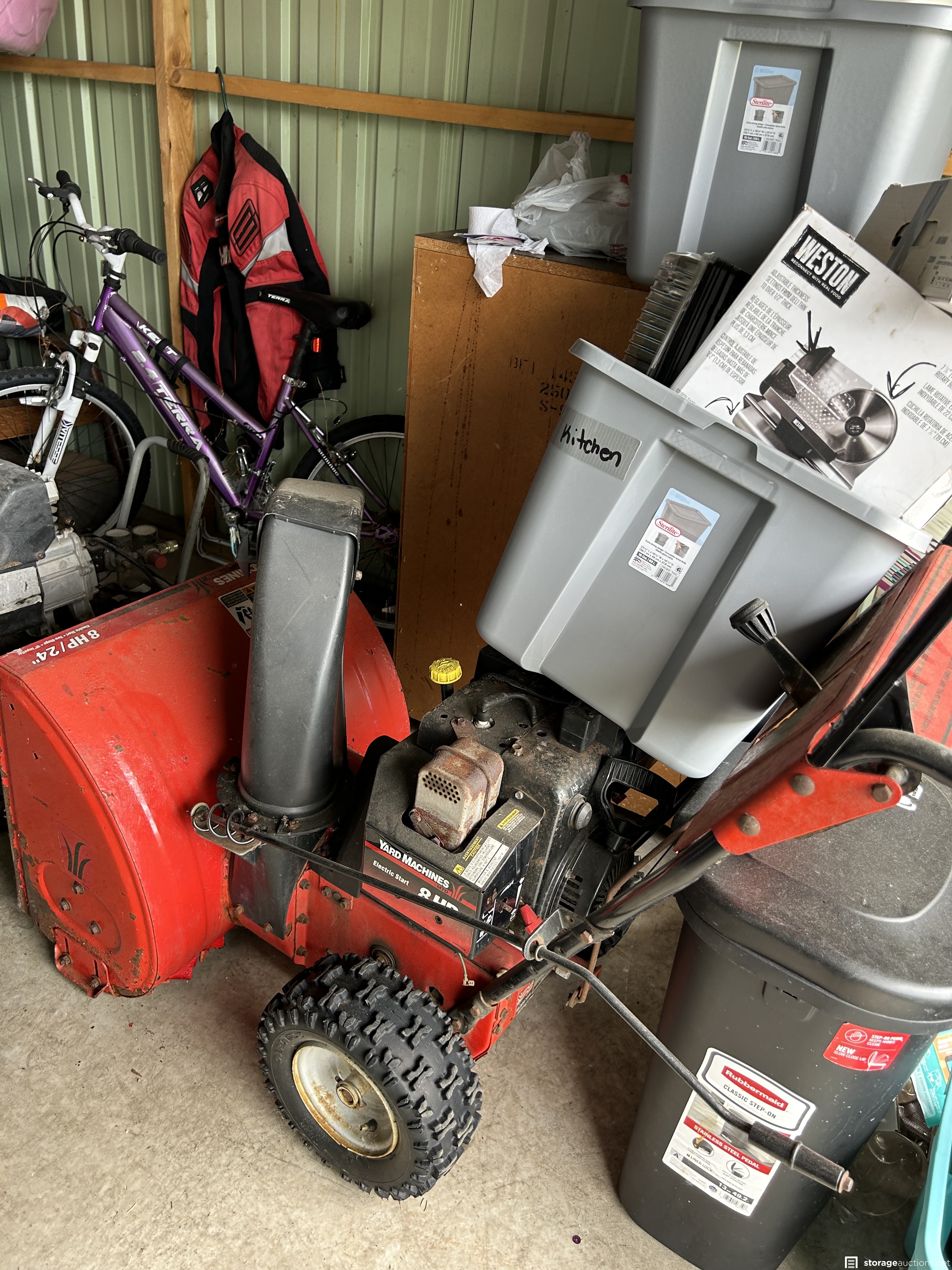 This unit appears to contain an air compressor, Yard Machine snow blower, Kent Terra bike, Northrock Aluminum bike, wood chest, snowboard, tent, party tent, radio flyer trike, Wilson golf bag and clubs, tools, wood dressers, vanity, wood rocking chair, kids toys, large circle mirror, wood kitchen chairs, Milwaukee truck dolly, bar stools with backs, extension cords, tool boxes, motorcycle jacket, wheel barrow, wicker baskets, plastic bins, garbage cans, motorcycle helmet, shelf system
