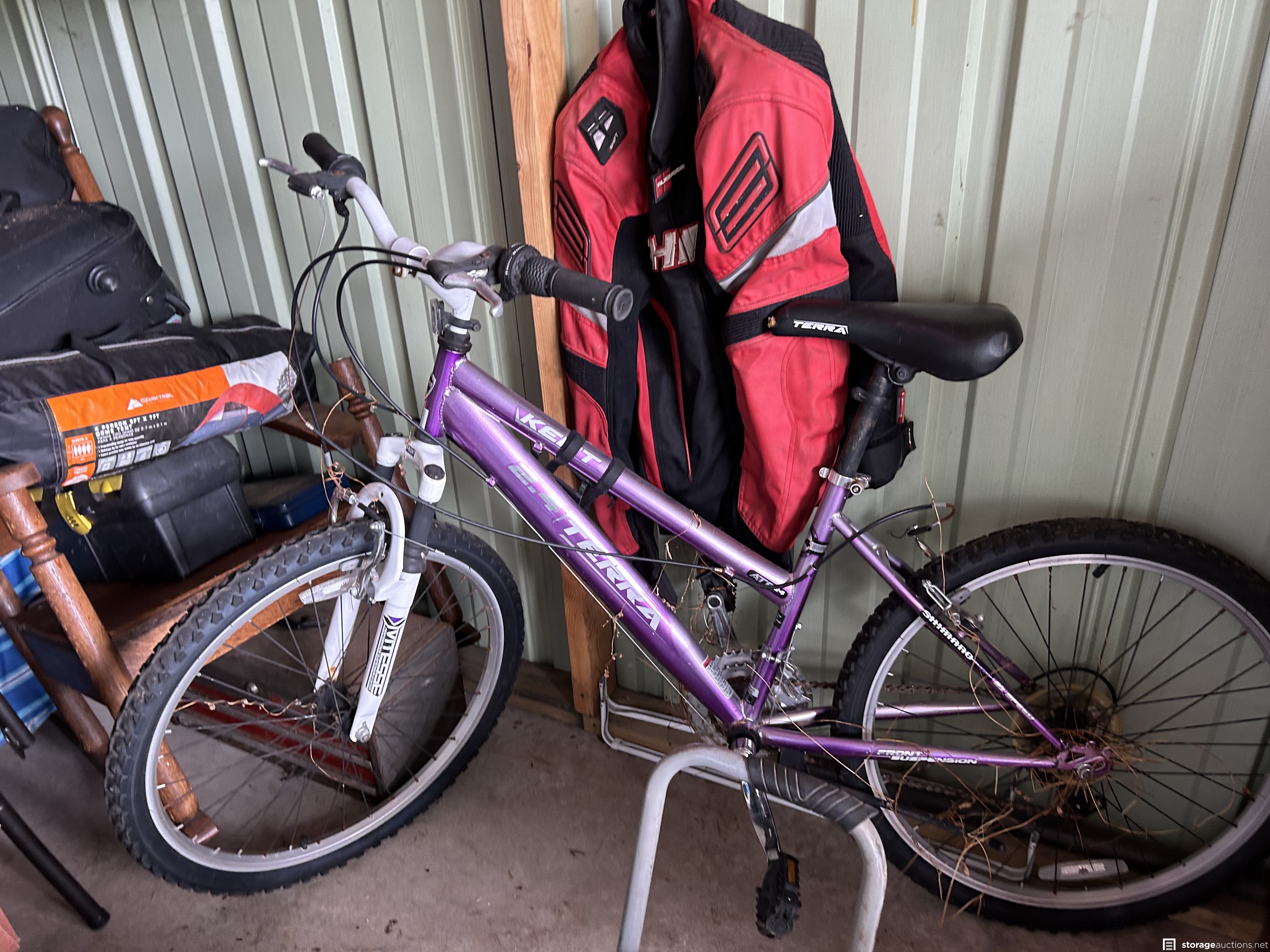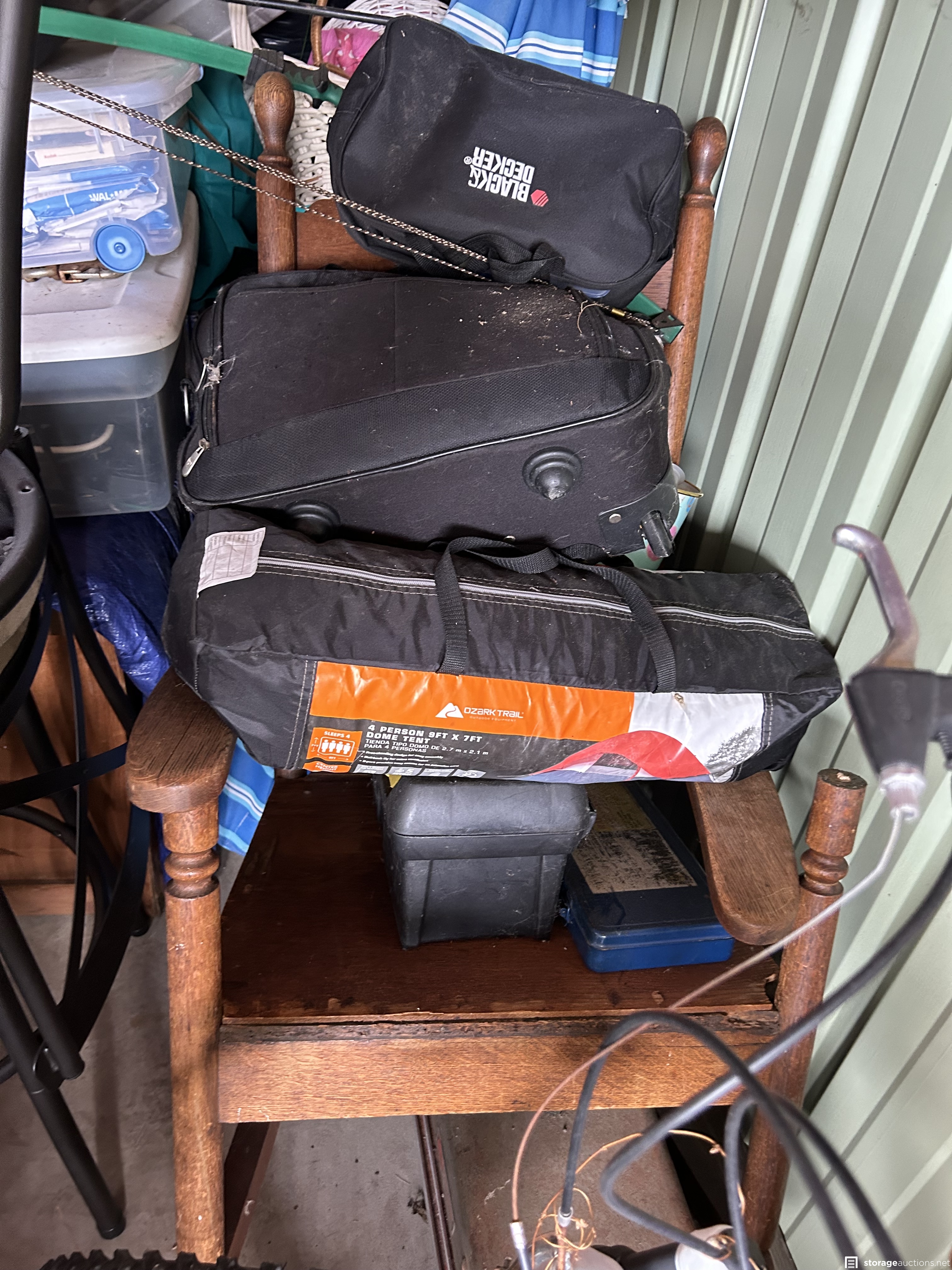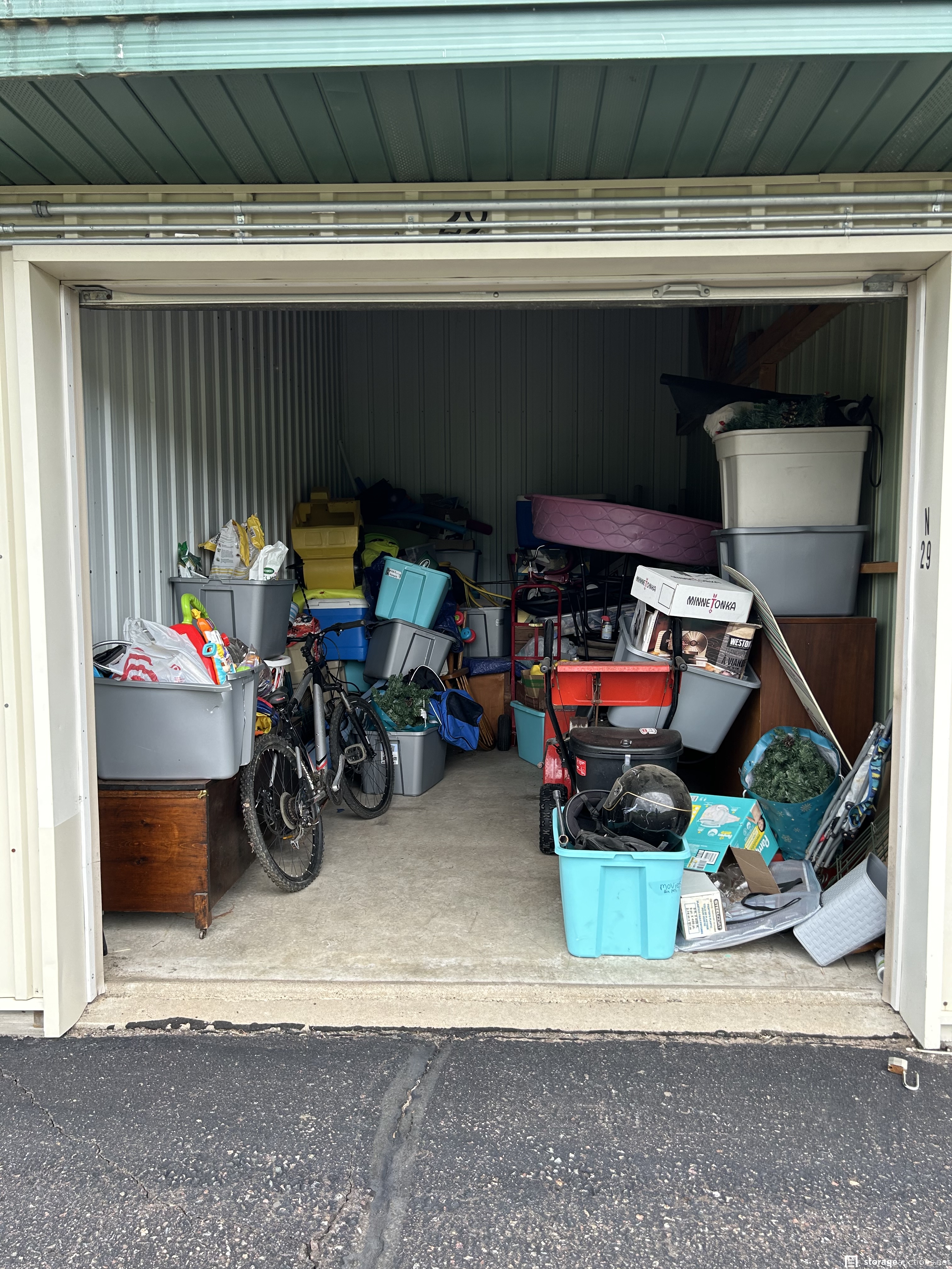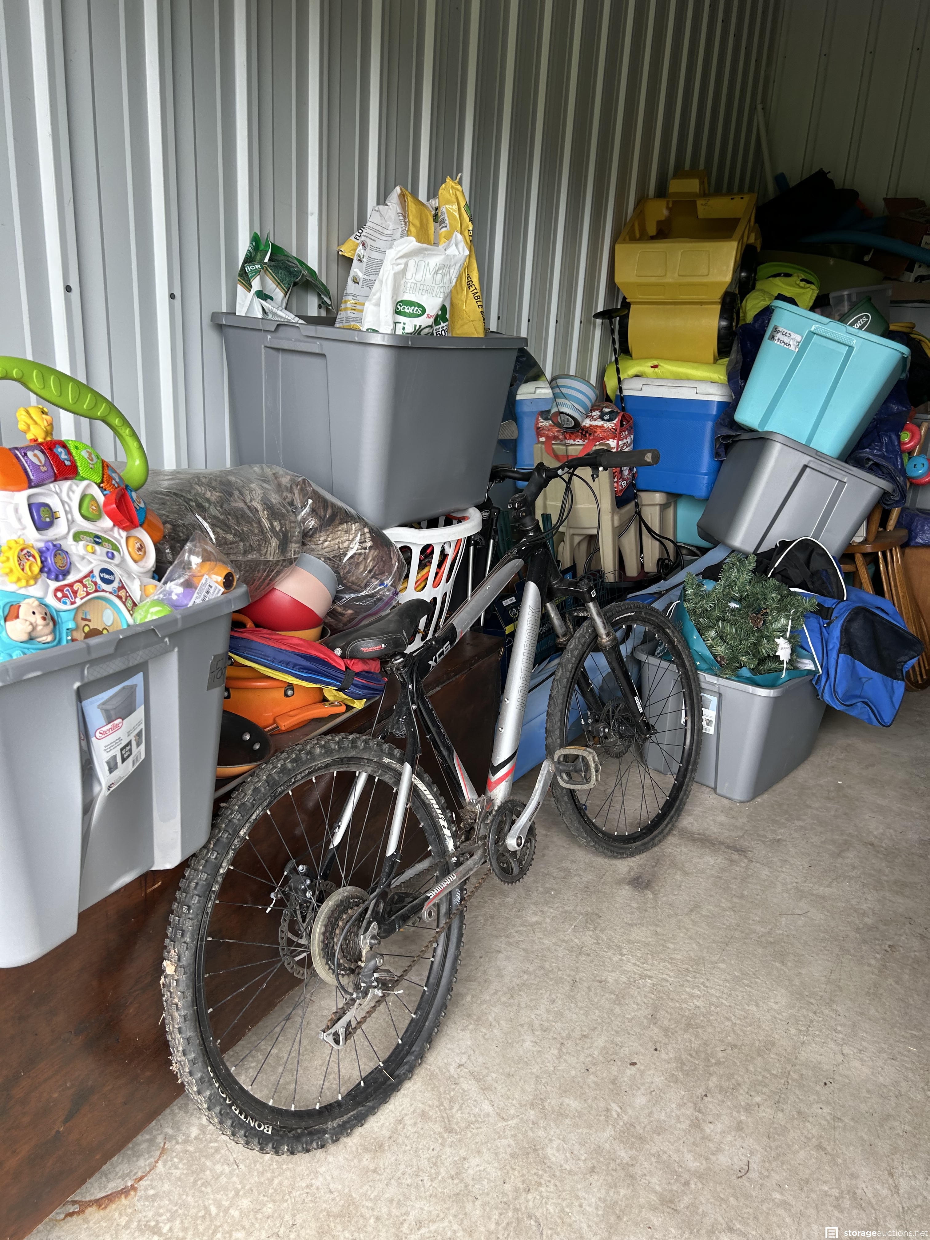 This unit appears to contain an air compressor, Yard Machine snow blower, Kent Terra bike, Northrock Aluminum bike, wood chest, snowboard, tent, party tent, radio flyer trike, Wilson golf bag and clubs, tools, wood dressers, vanity, wood rocking chair, kids toys, large circle mirror, wood kitchen chairs, Milwaukee truck dolly, bar stools with backs, extension cords, tool boxes, motorcycle jacket, wheel barrow, wicker baskets, plastic bins, garbage cans, motorcycle helmet, shelf system