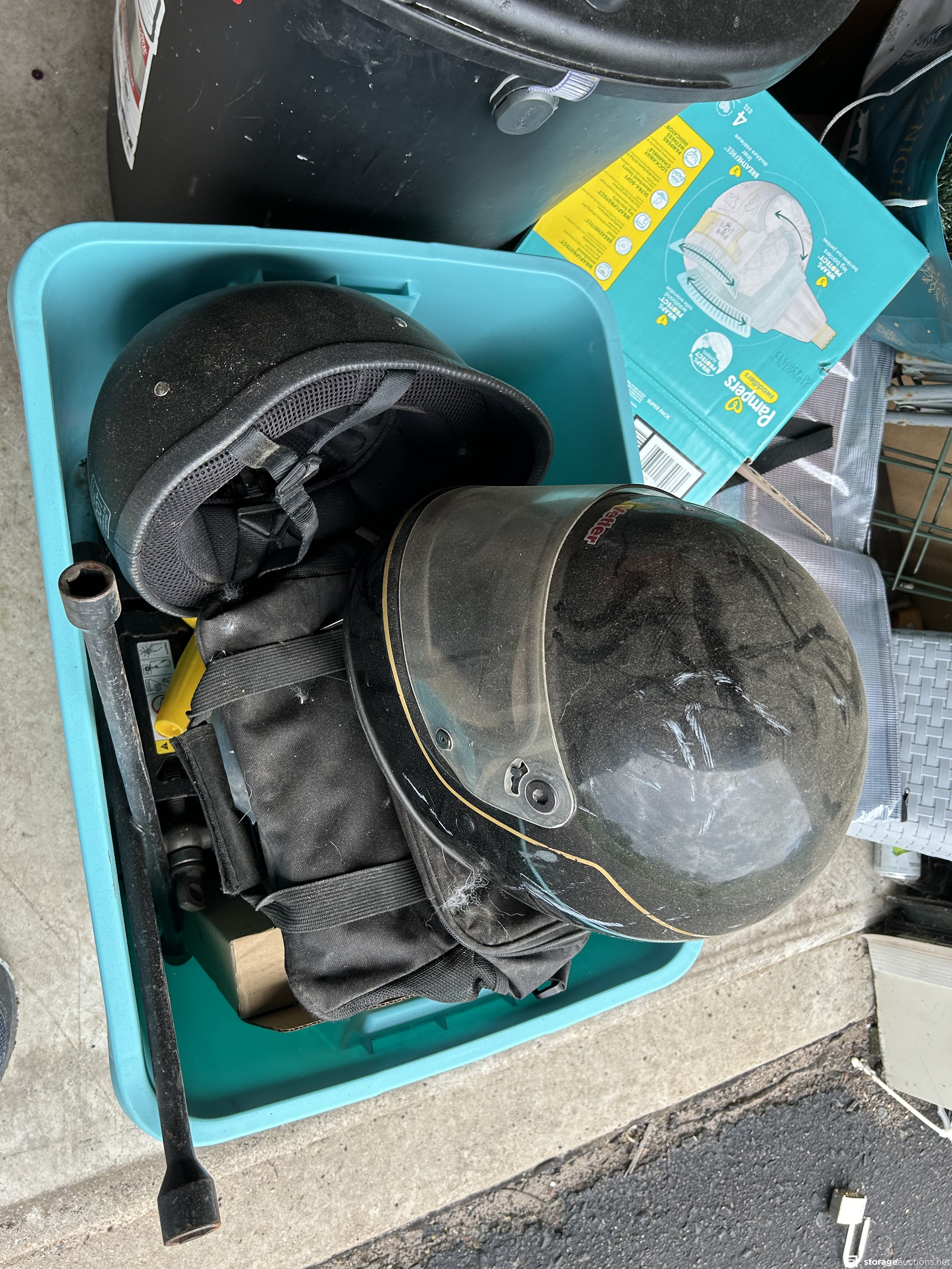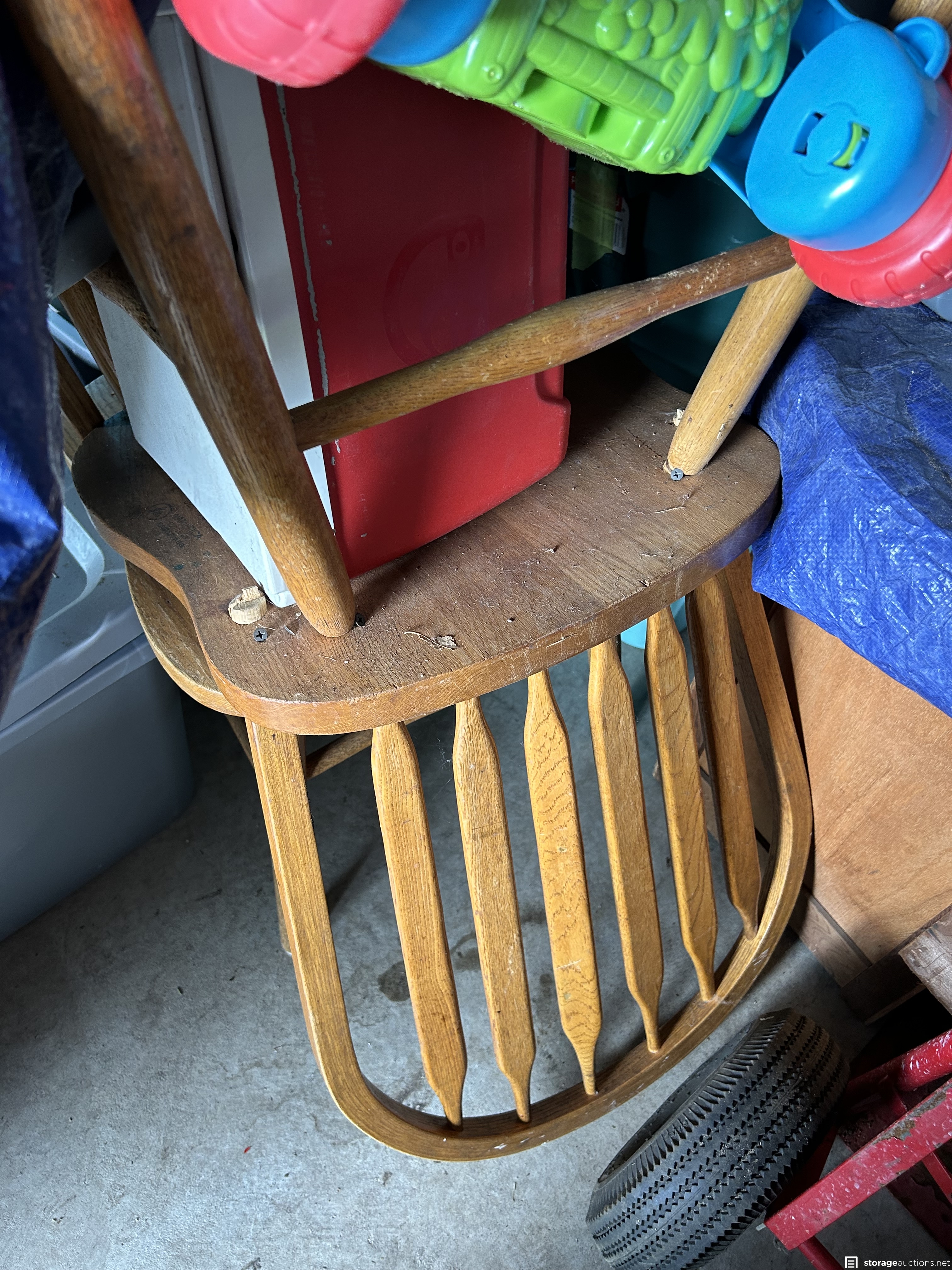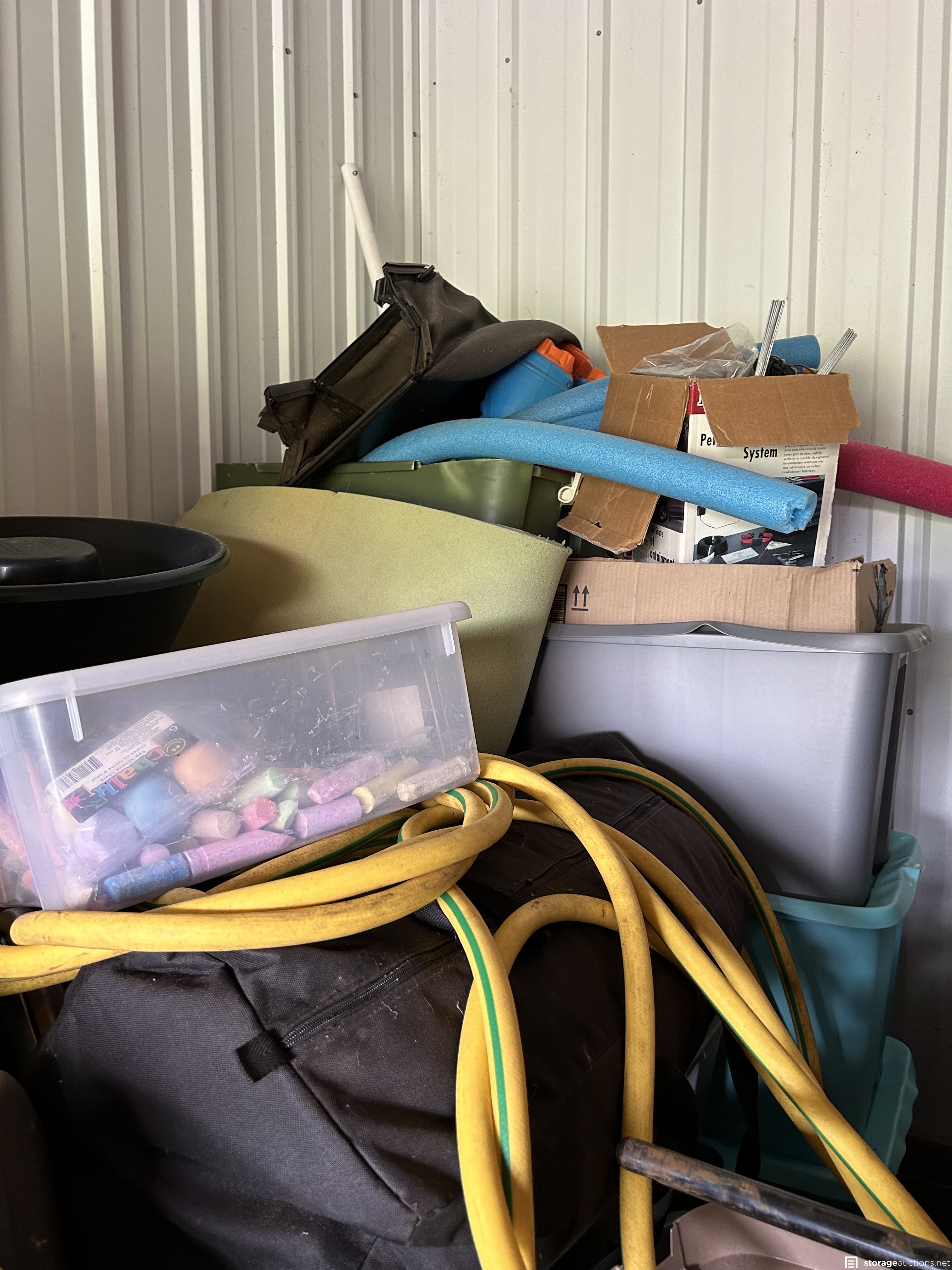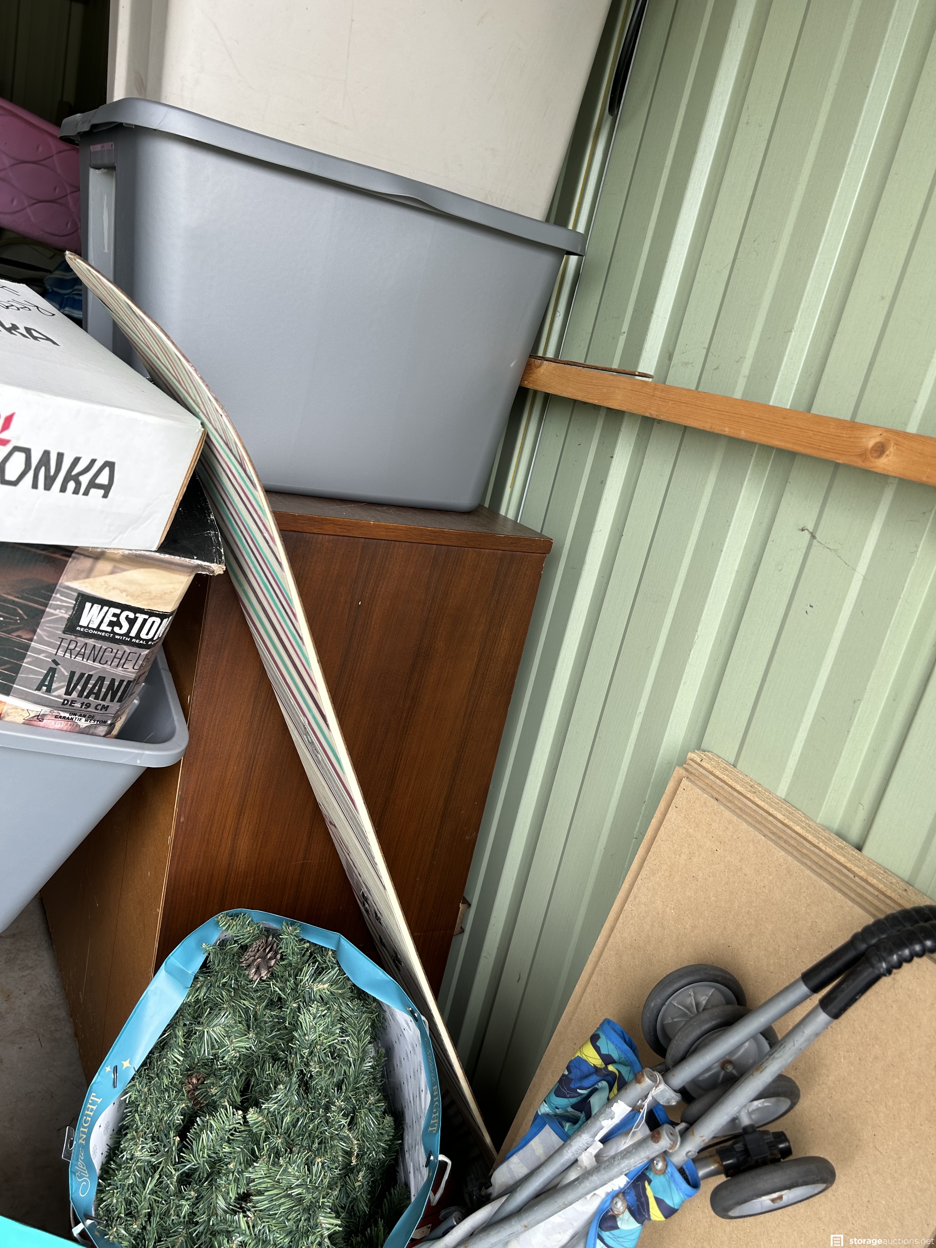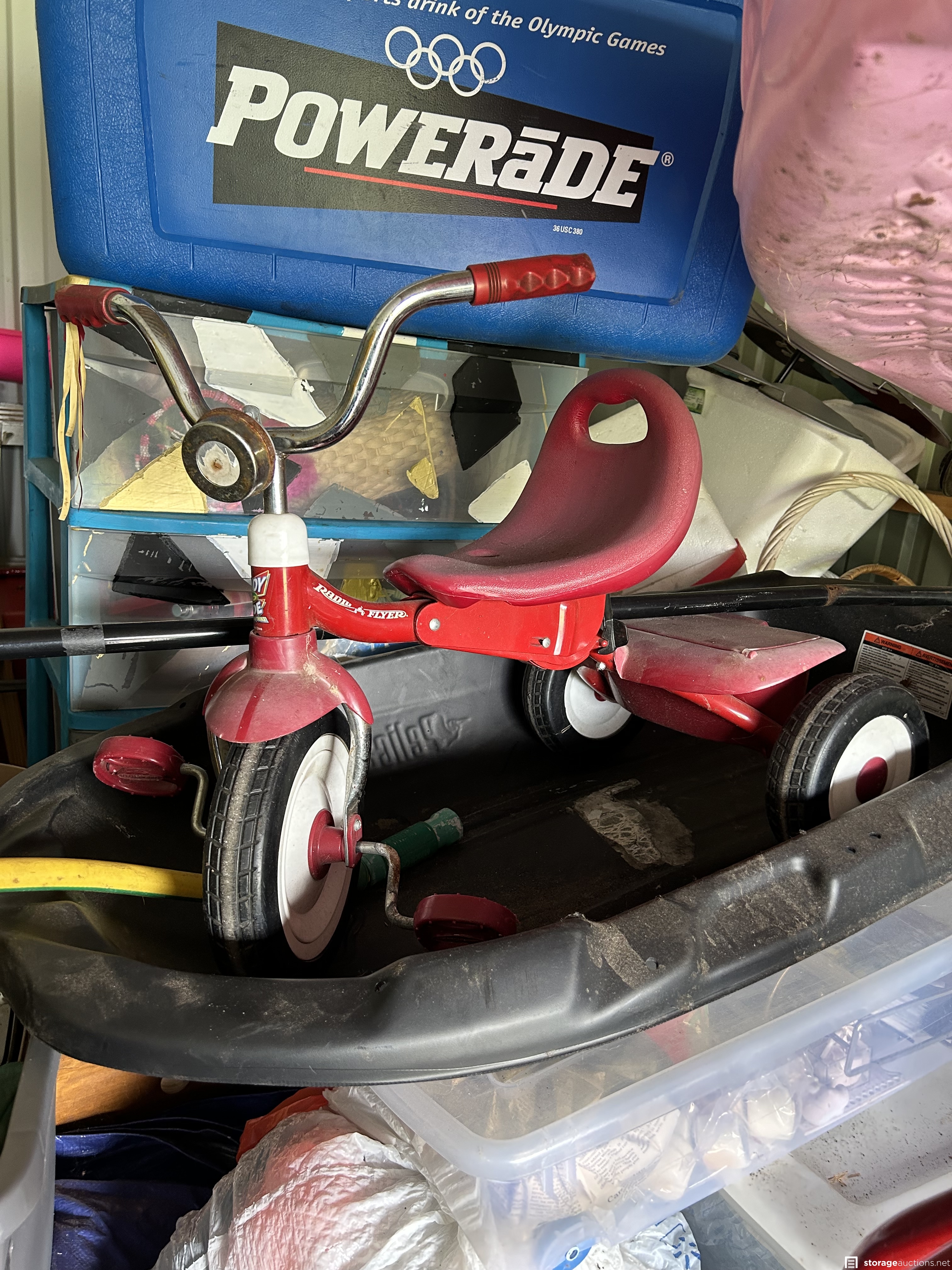 This unit appears to contain an air compressor, Yard Machine snow blower, Kent Terra bike, Northrock Aluminum bike, wood chest, snowboard, tent, party tent, radio flyer trike, Wilson golf bag and clubs, tools, wood dressers, vanity, wood rocking chair, kids toys, large circle mirror, wood kitchen chairs, Milwaukee truck dolly, bar stools with backs, extension cords, tool boxes, motorcycle jacket, wheel barrow, wicker baskets, plastic bins, garbage cans, motorcycle helmet, shelf system