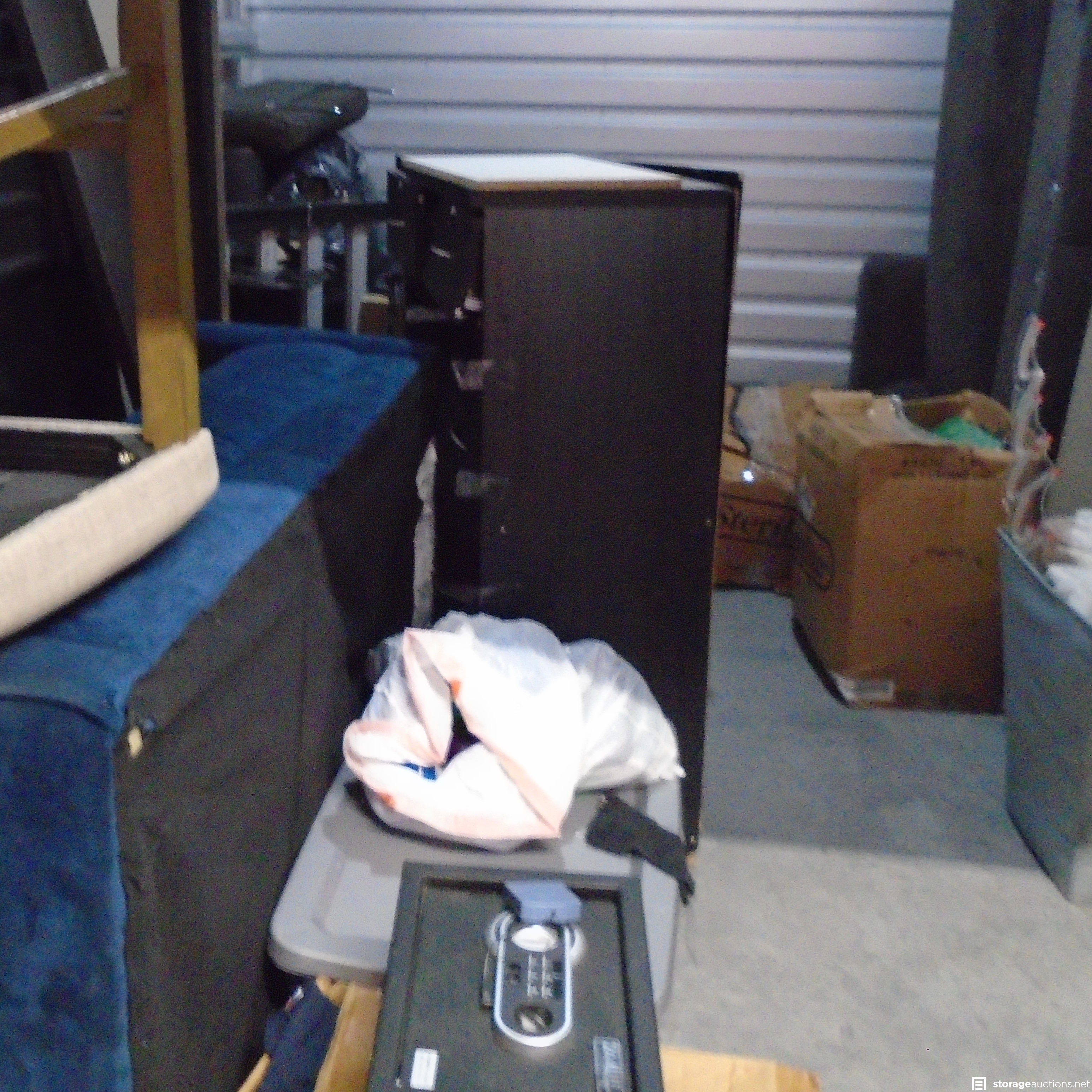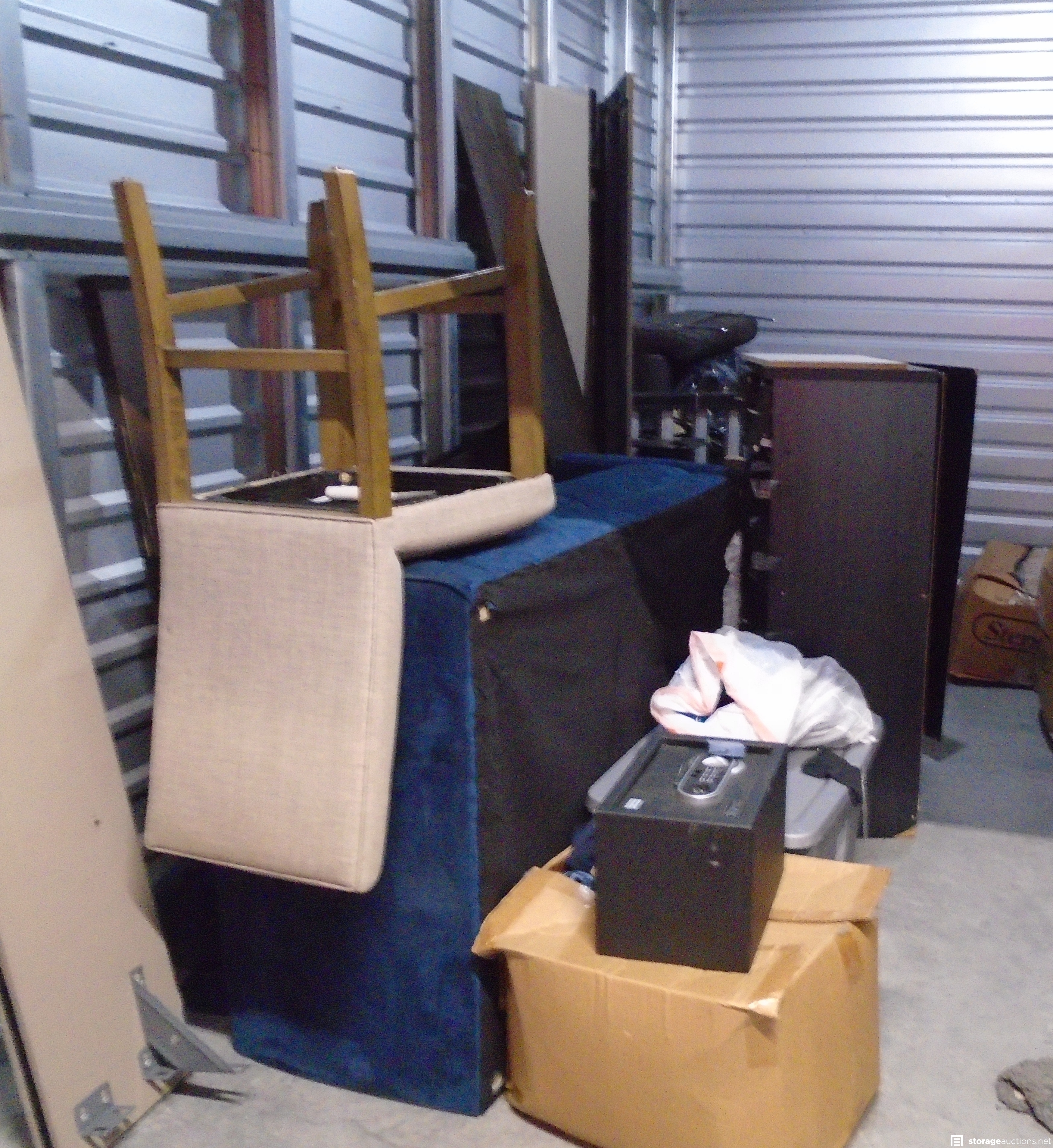 Unit appears to have a safe, couch, boxes, chairs, a tote, dresser, and a table.