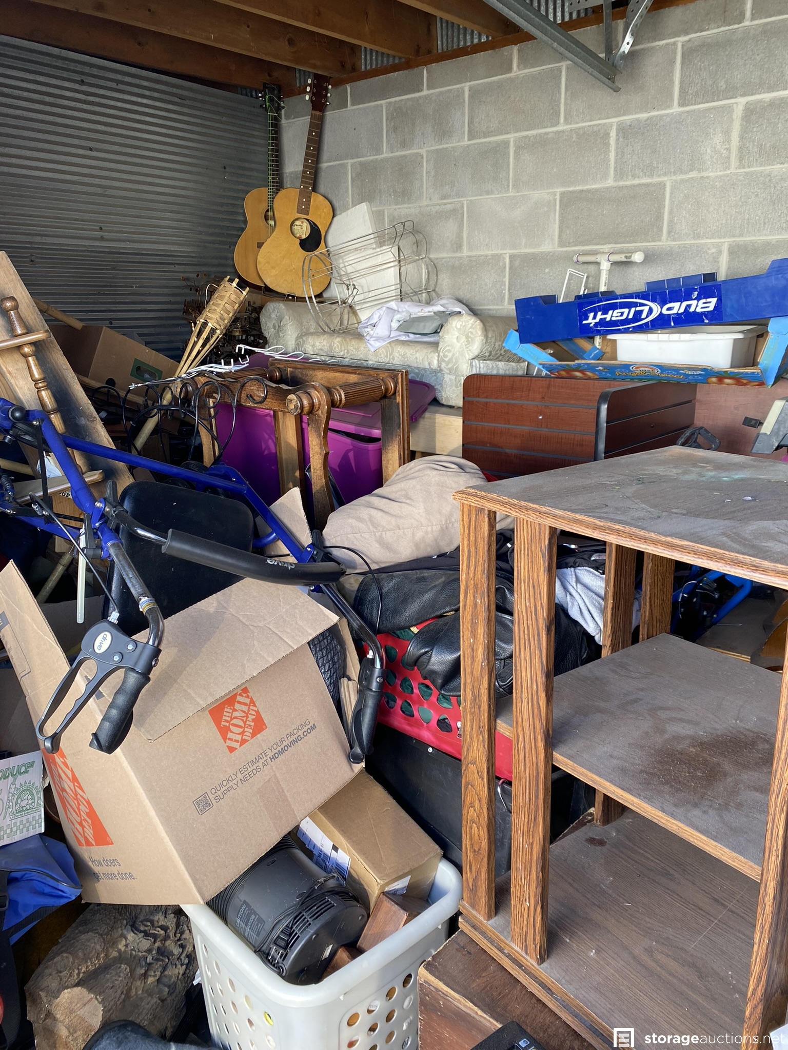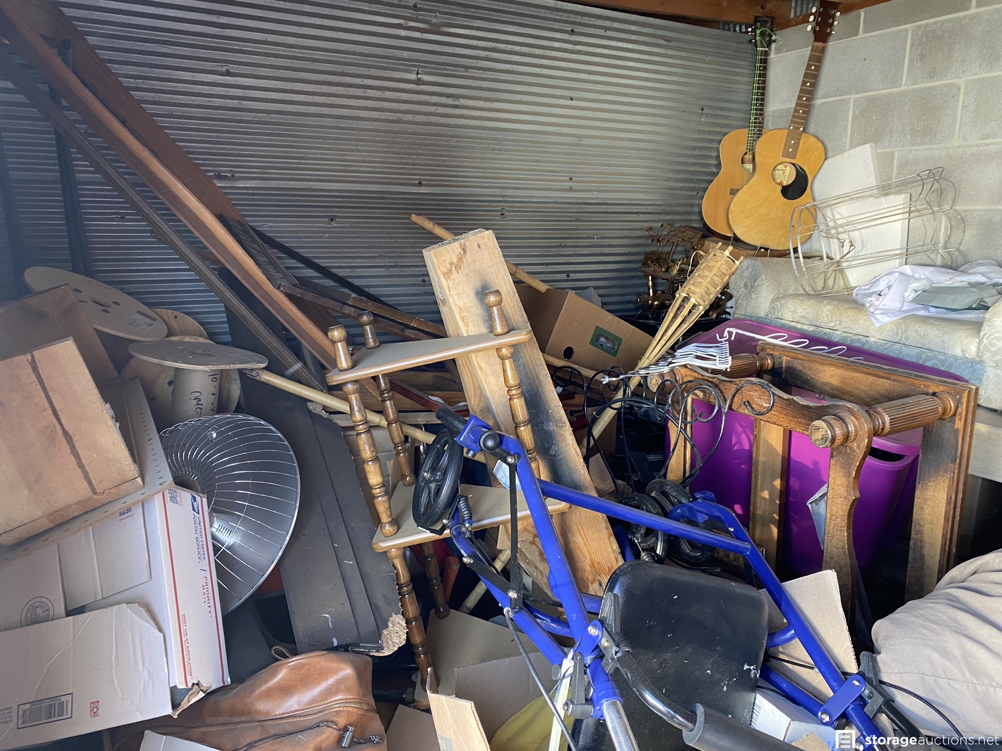 Guitars, walker, gum ball machine, bike, old fashioned clock, lots of totes, large trunk, furniture, various household goods.