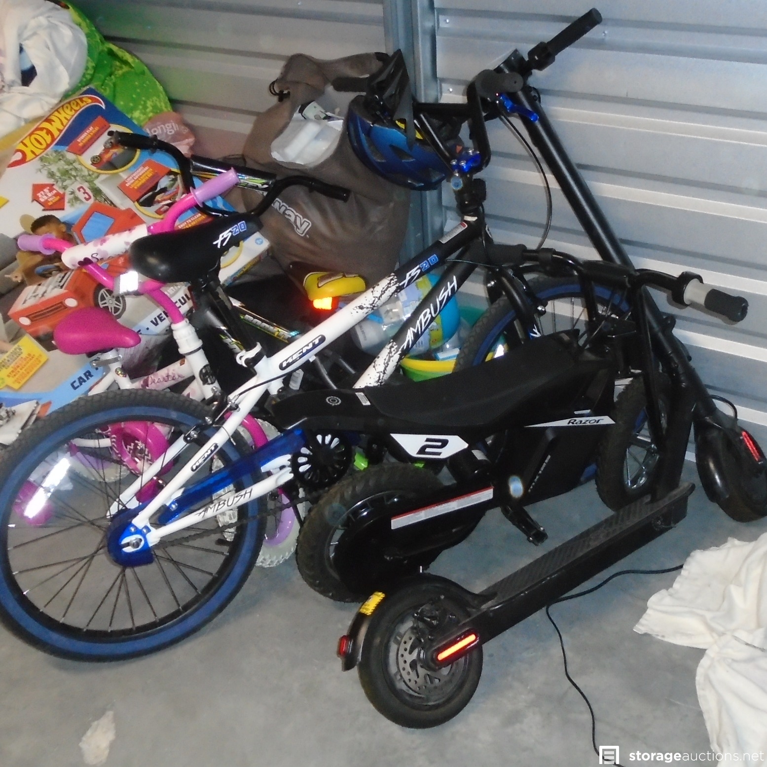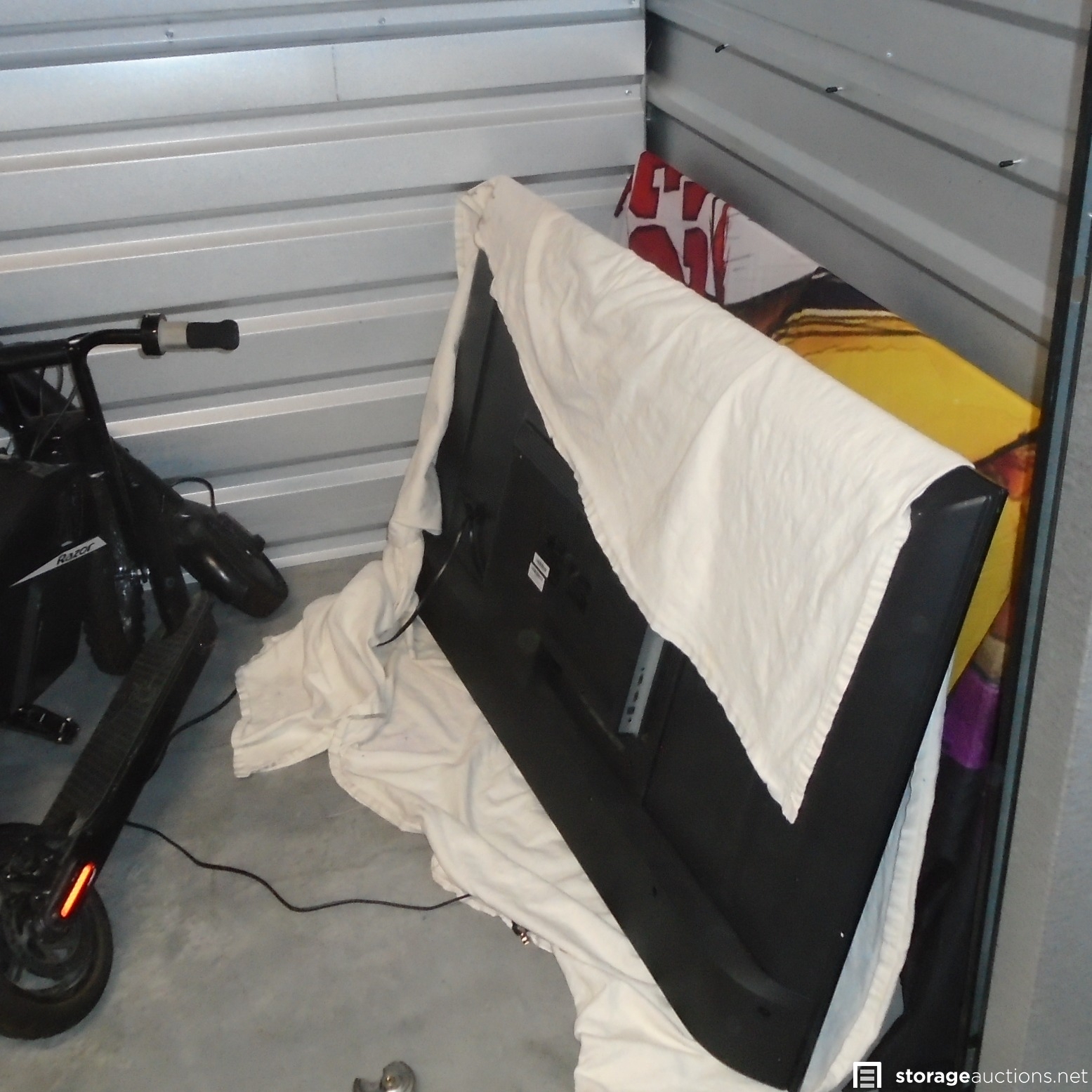 Unit appears to have bags of items, bicycles, flat screen tv, and a scooter.