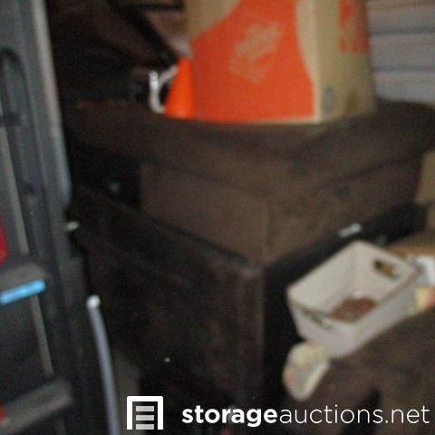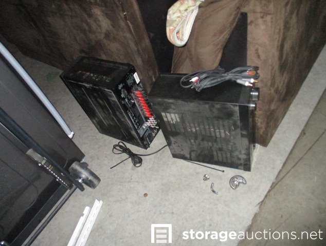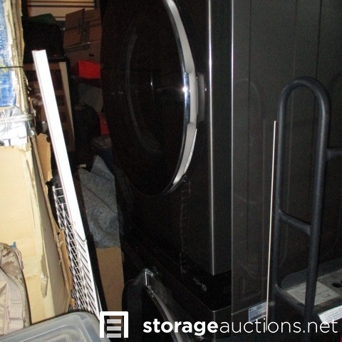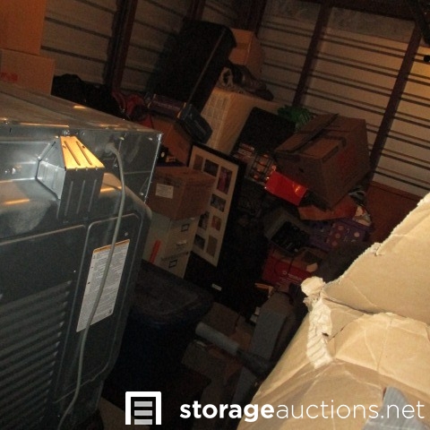 Unit looks to contain: couches, stacked washer/dryer, stero equipment, boxes, & wall art