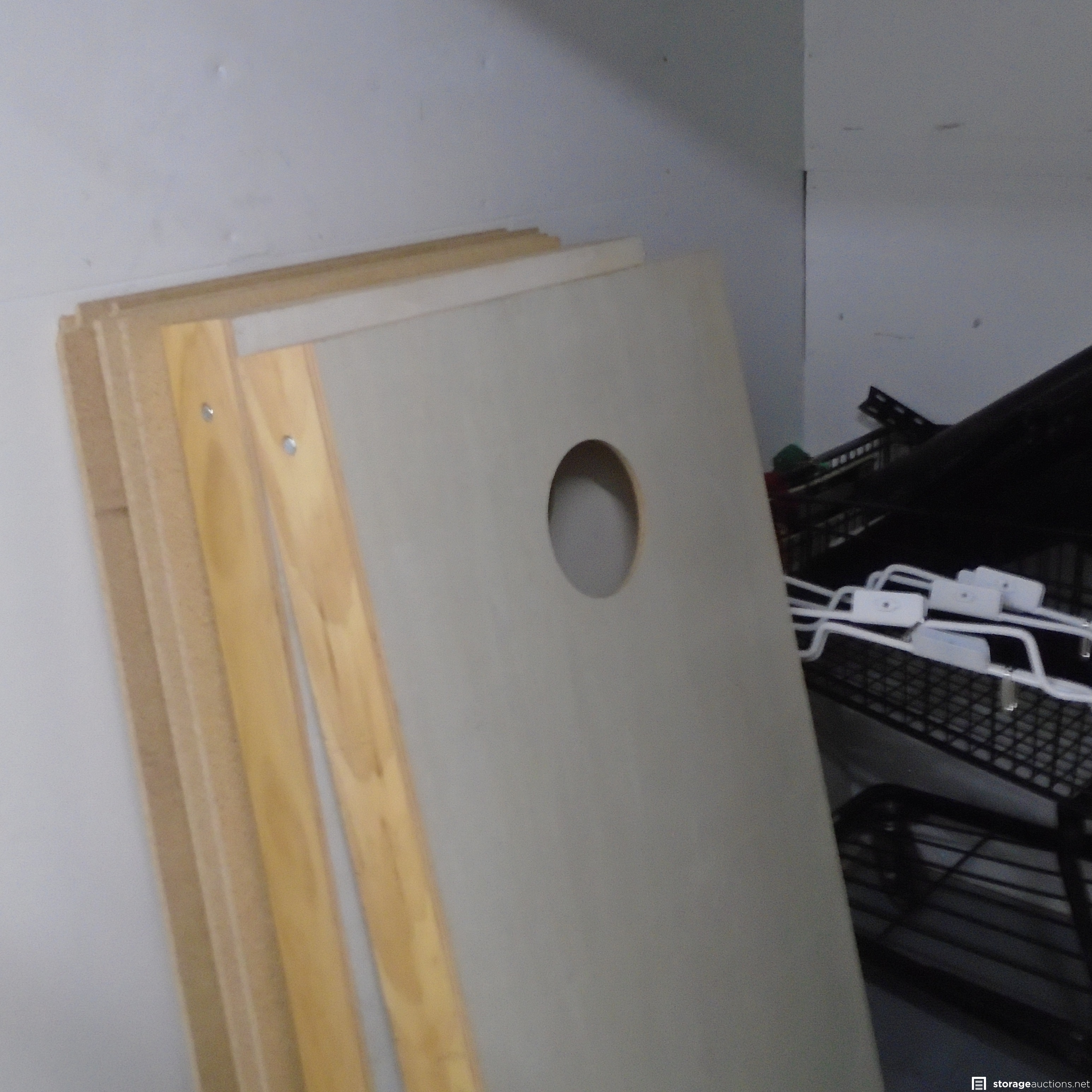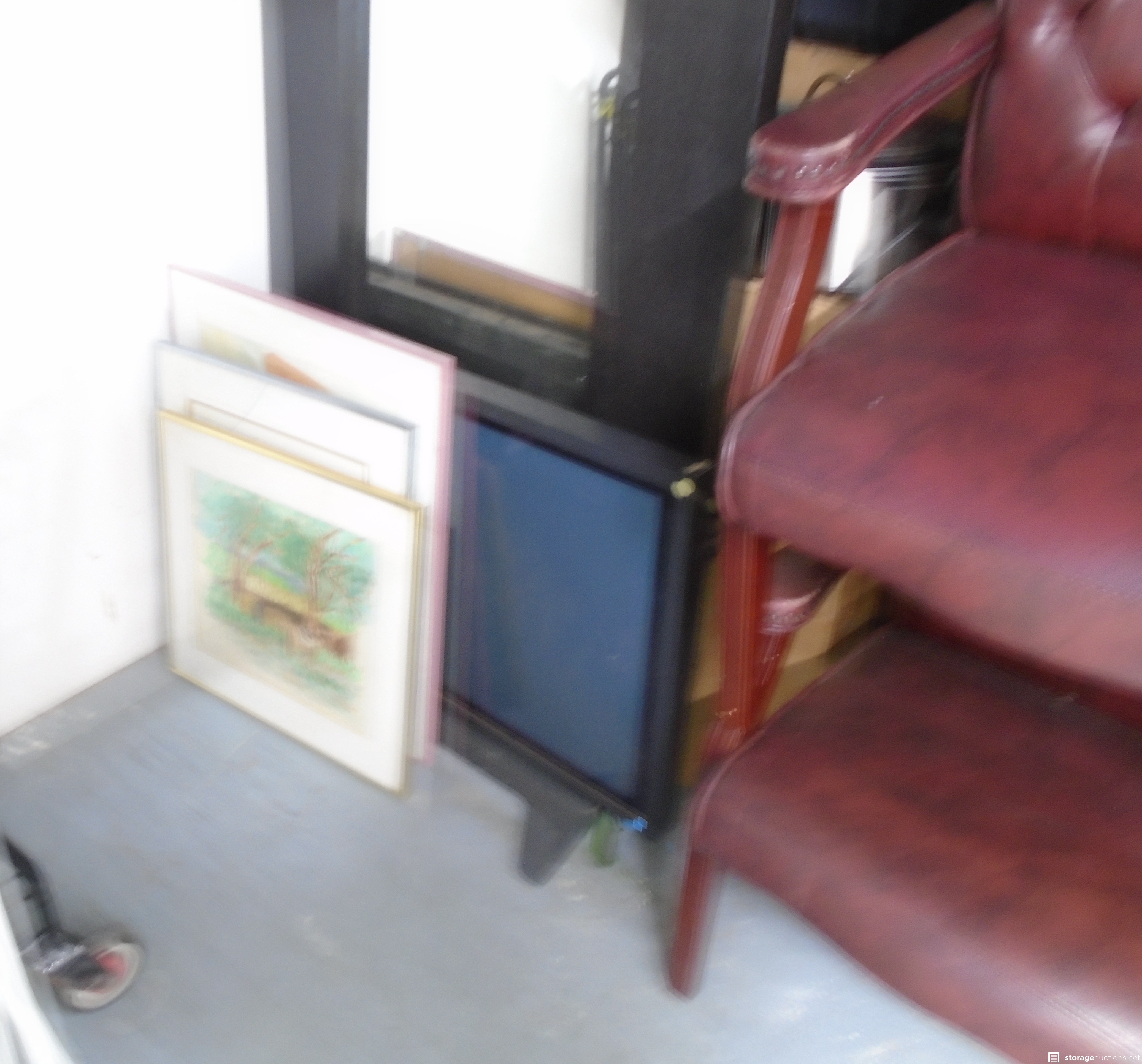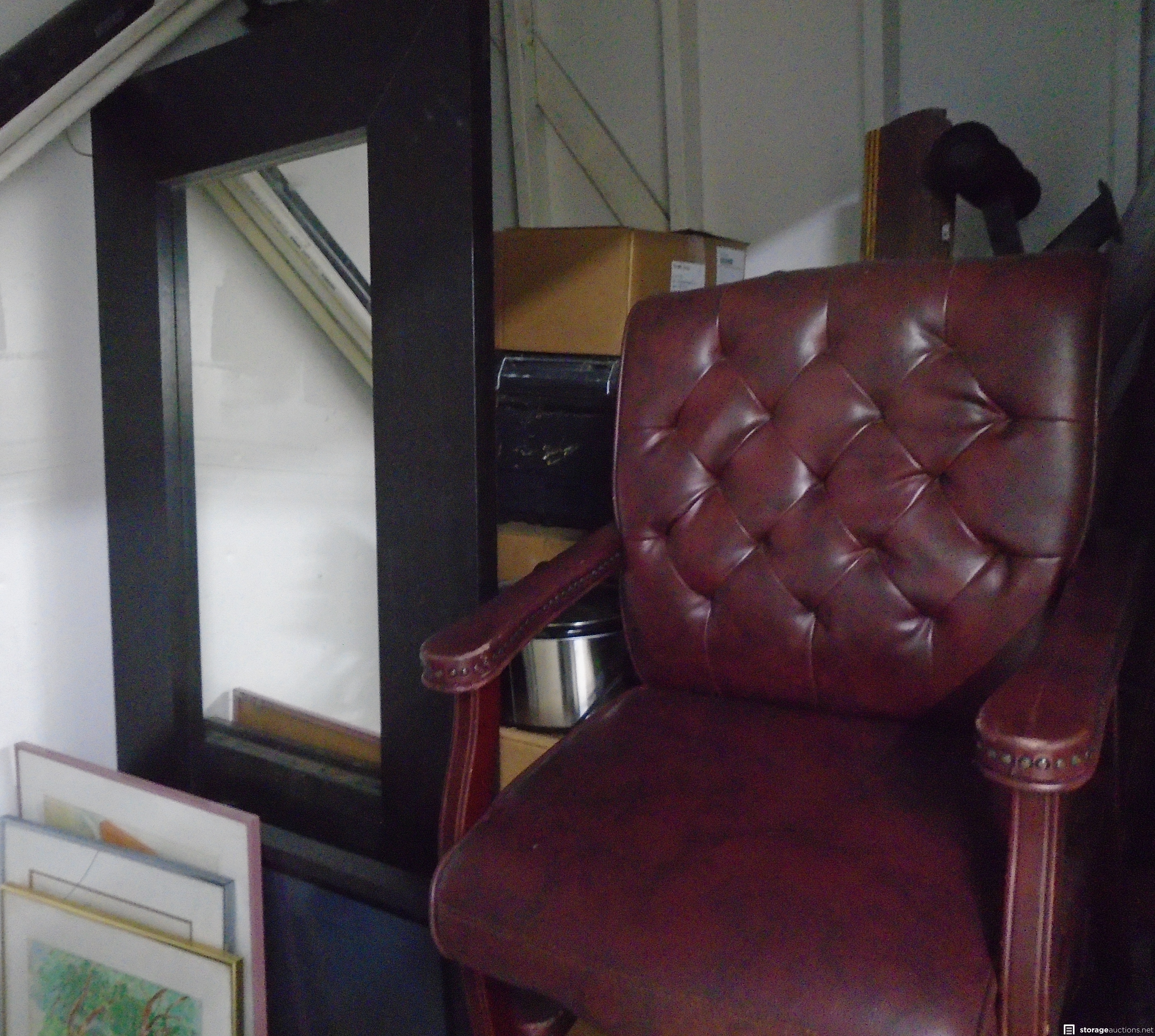Abandoned Unit. Unit appears to have 2 chairs, 4 boxes, 1 tote, large mirror, cornhole game, crockpot, framed paintings, and shelving unit.