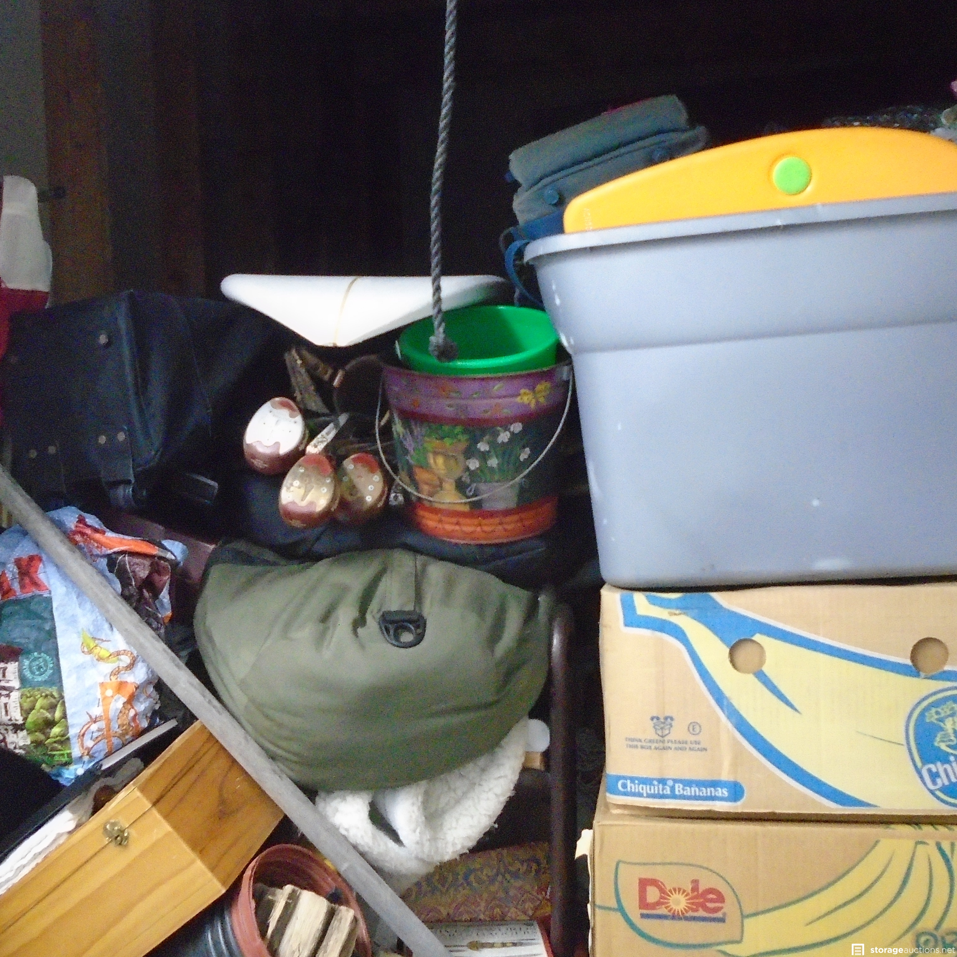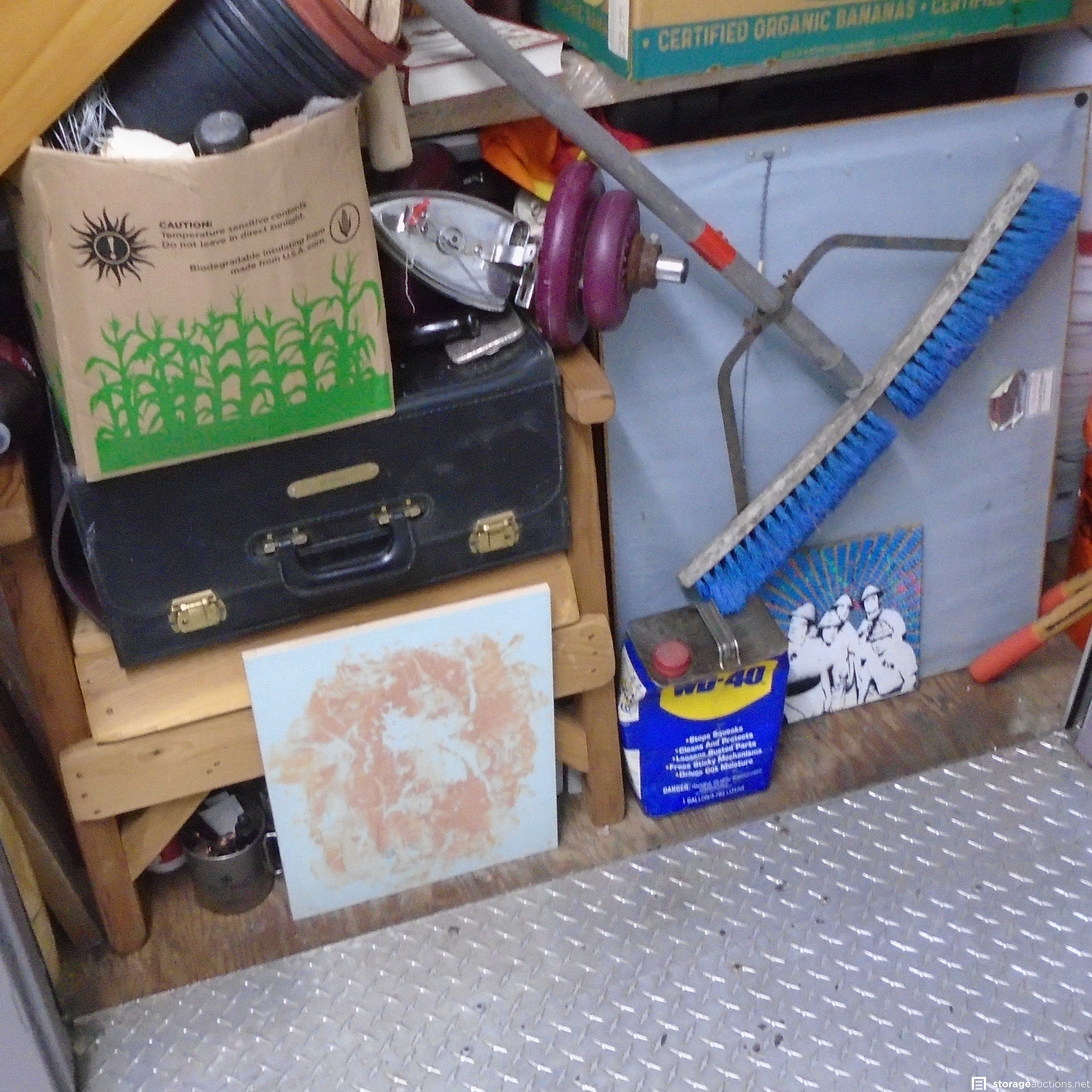 The famous board shaper's unit: Appears to contain adult clothing, bikes, golf clubs, fishing, skiing, camping, Tools, boxes, totes, surfboards, paintings.