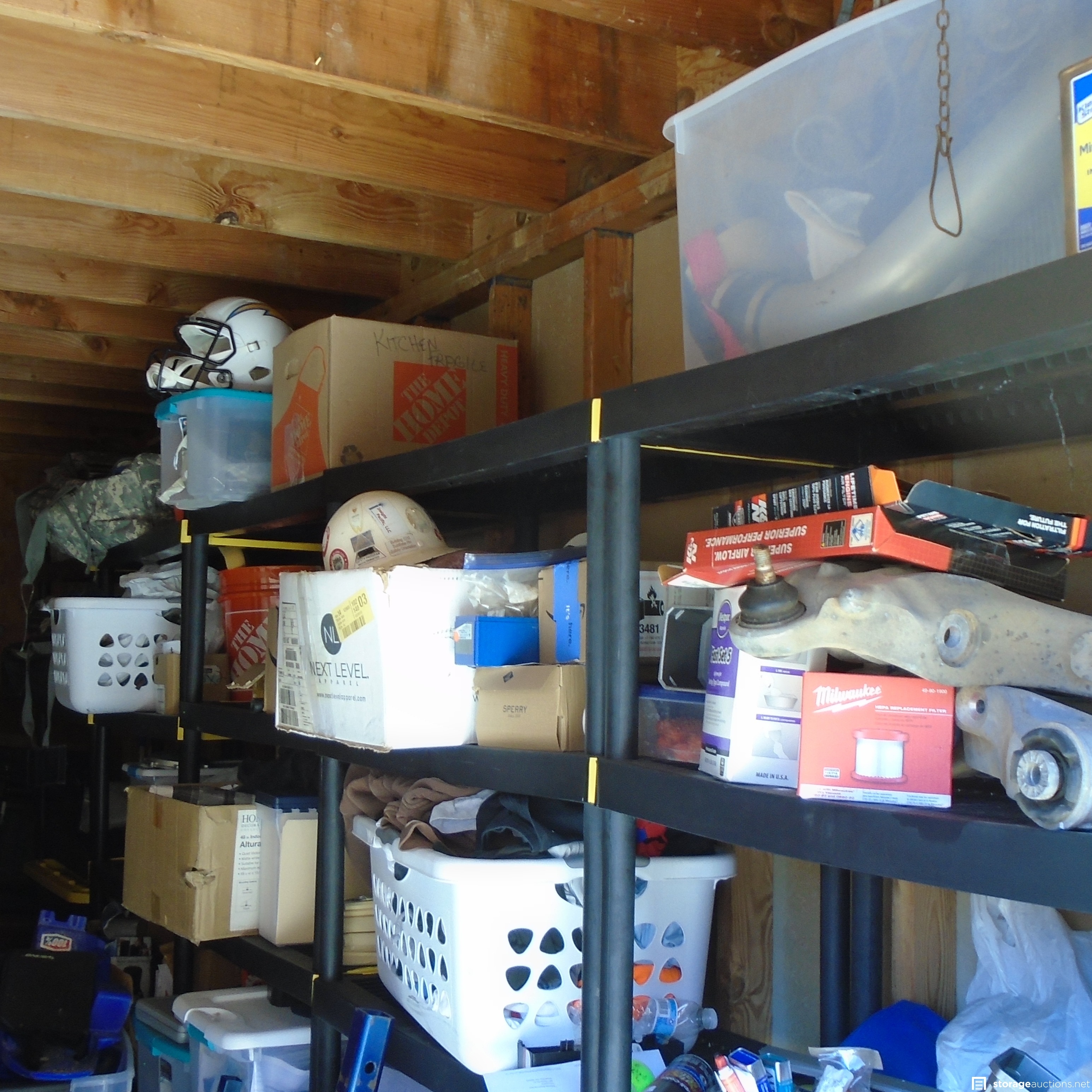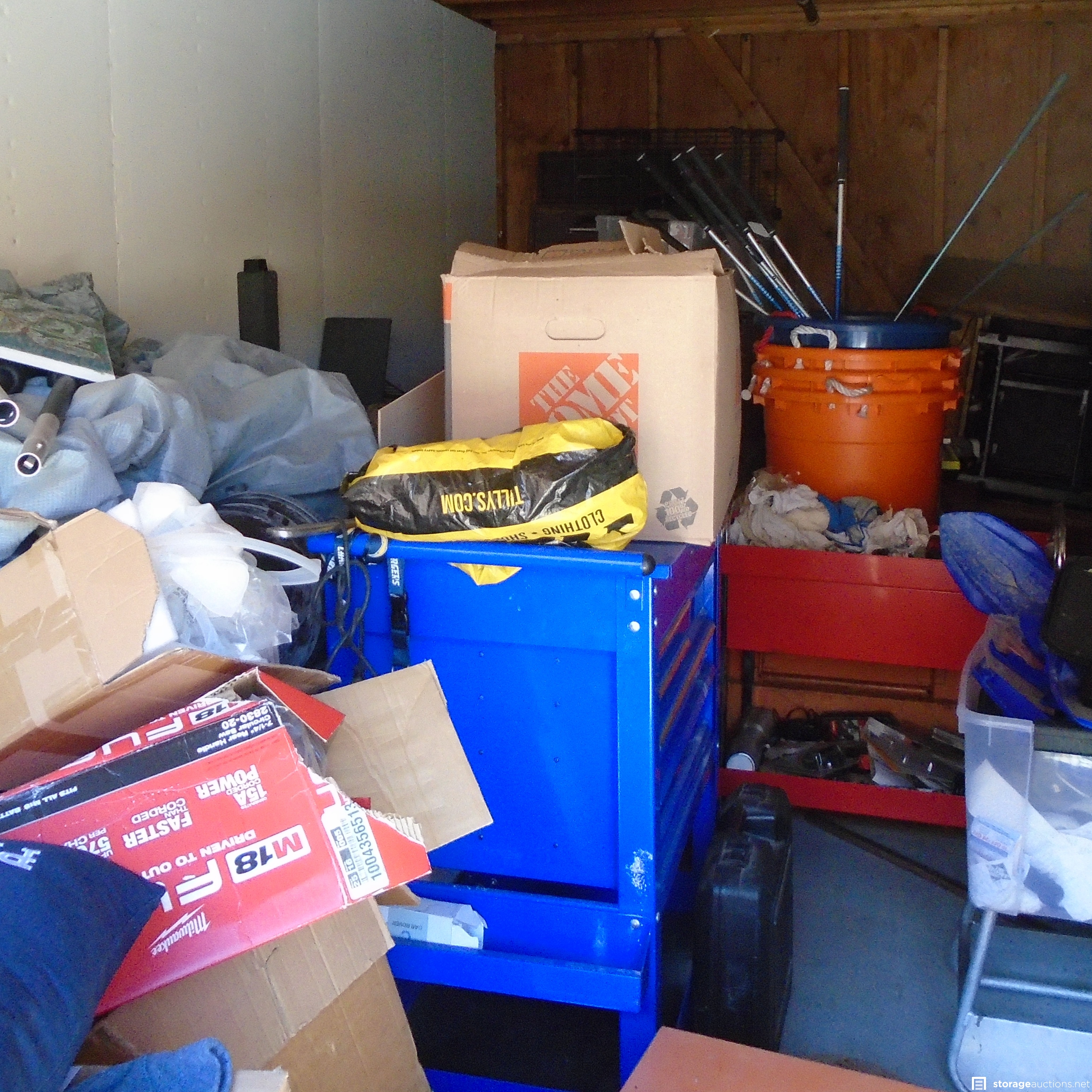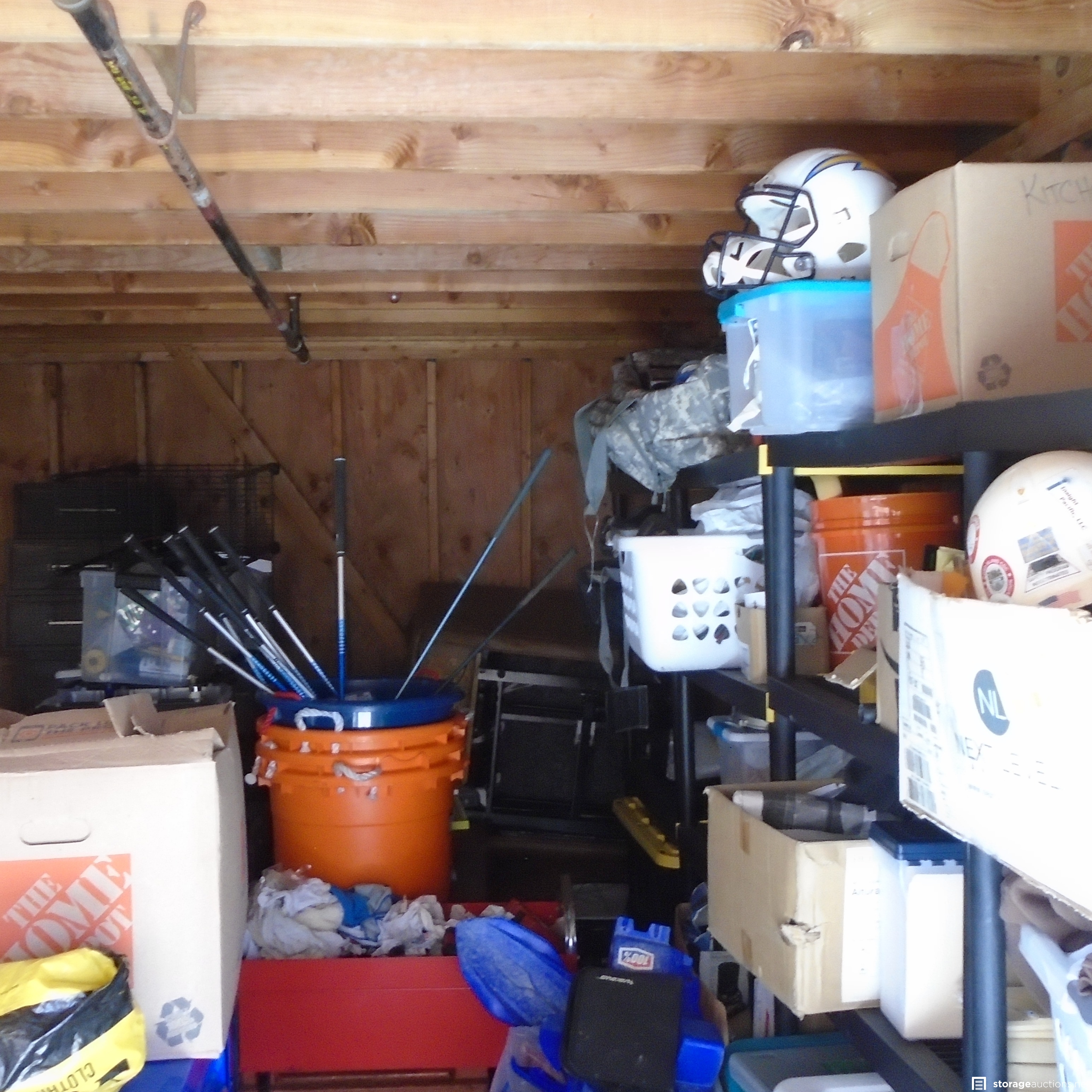 Same owner as DL012, Unit appears to contain: Golf Clubs, Car wheels, Cabinet, Car parts, Chargers Helmet, boxes and Totes, Power tools, Tool Box and Hand Tools. Recliner and adult clothing as well.