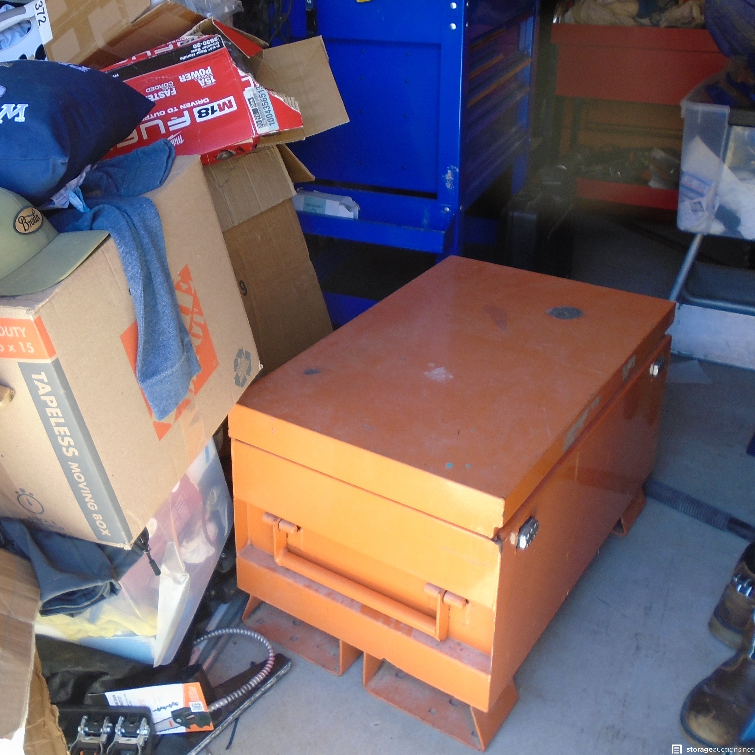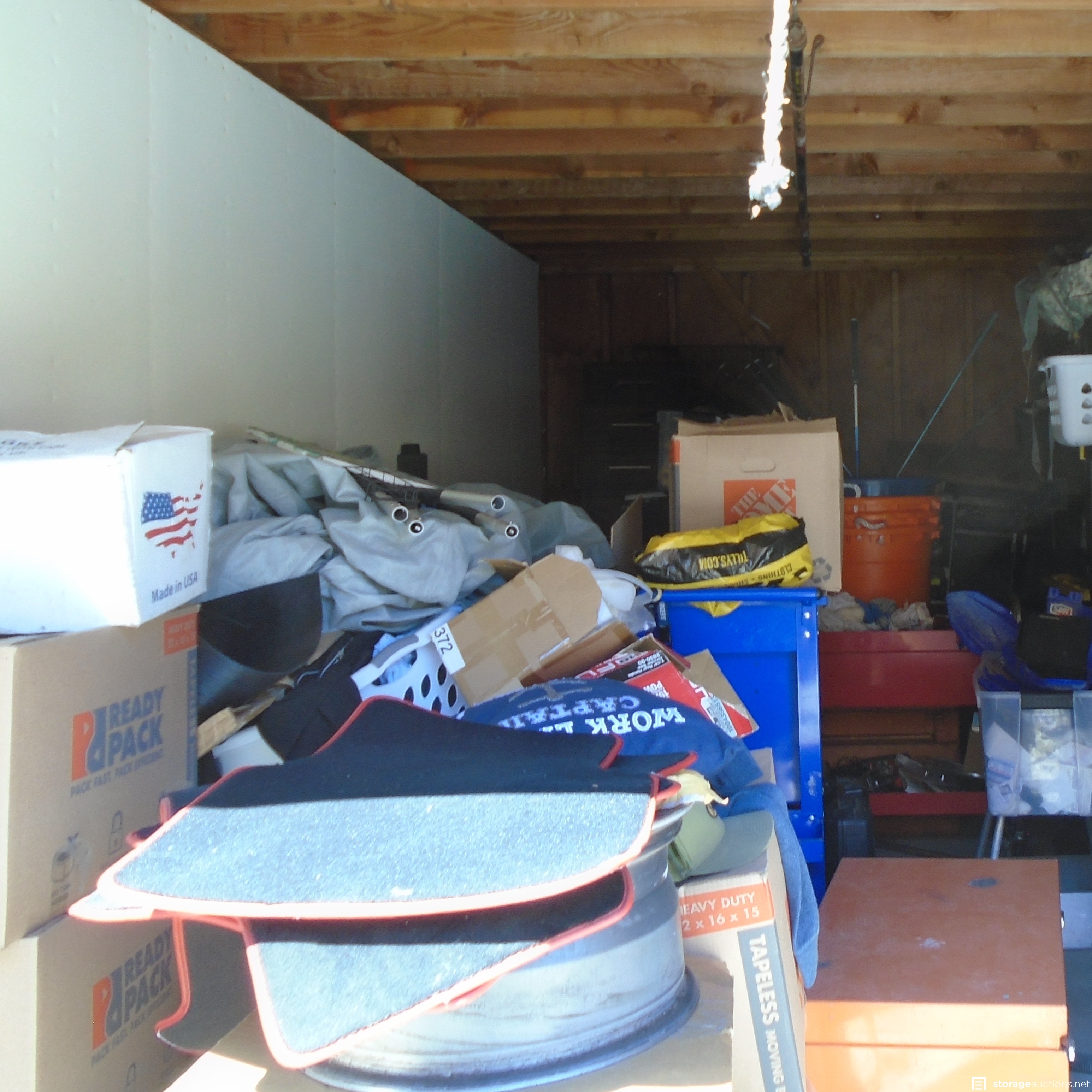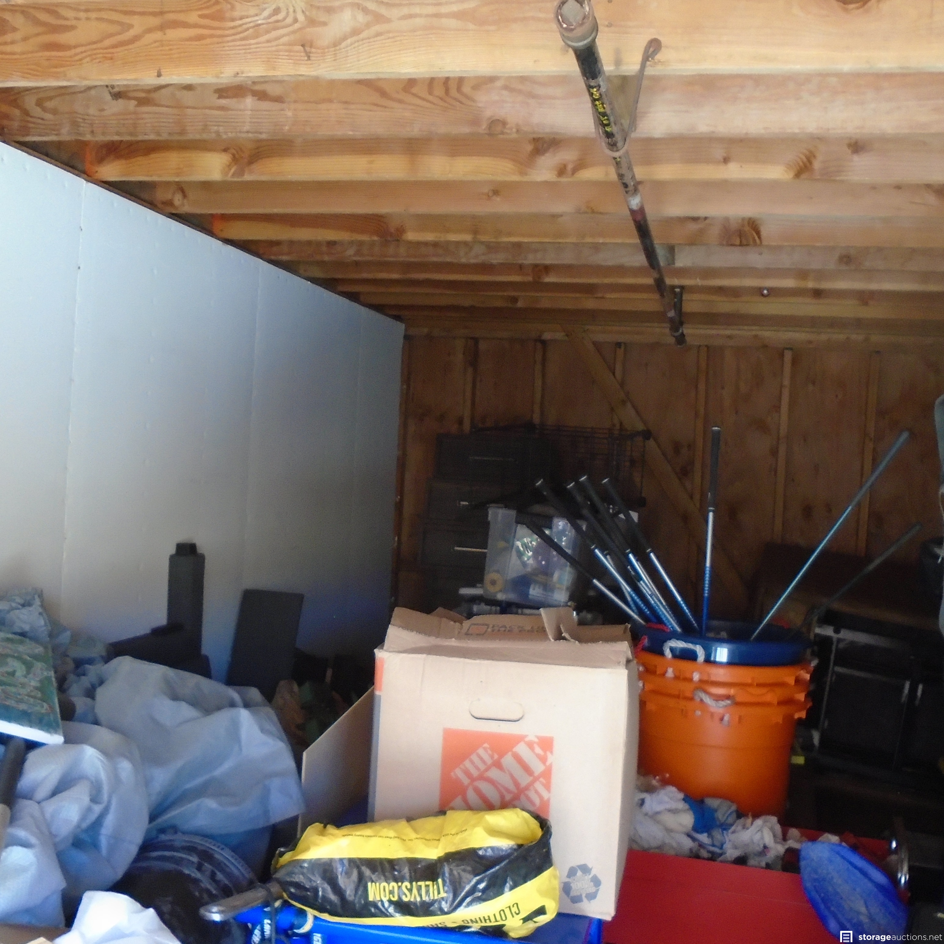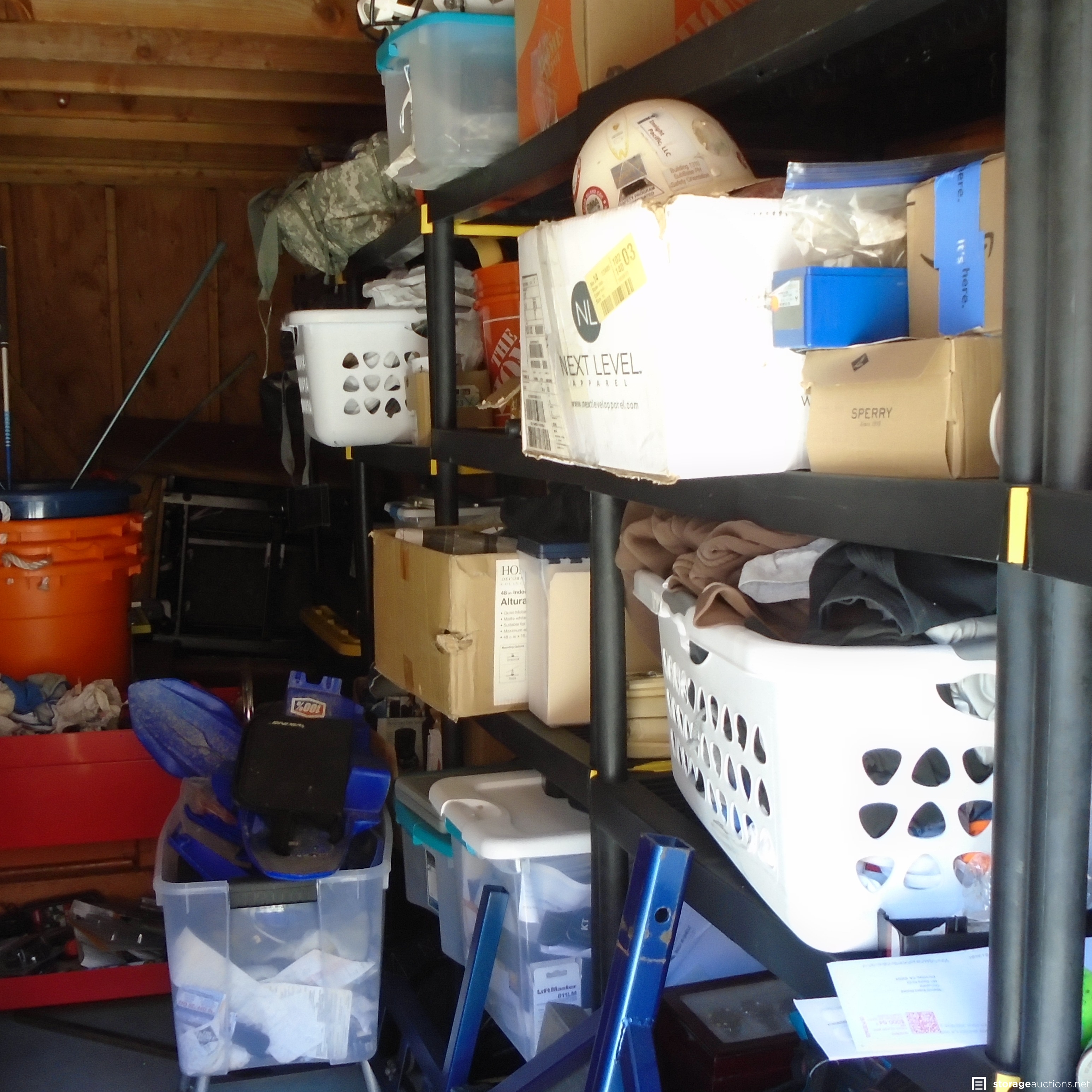 Same owner as DL012, Unit appears to contain: Golf Clubs, Car wheels, Cabinet, Car parts, Chargers Helmet, boxes and Totes, Power tools, Tool Box and Hand Tools. Recliner and adult clothing as well.