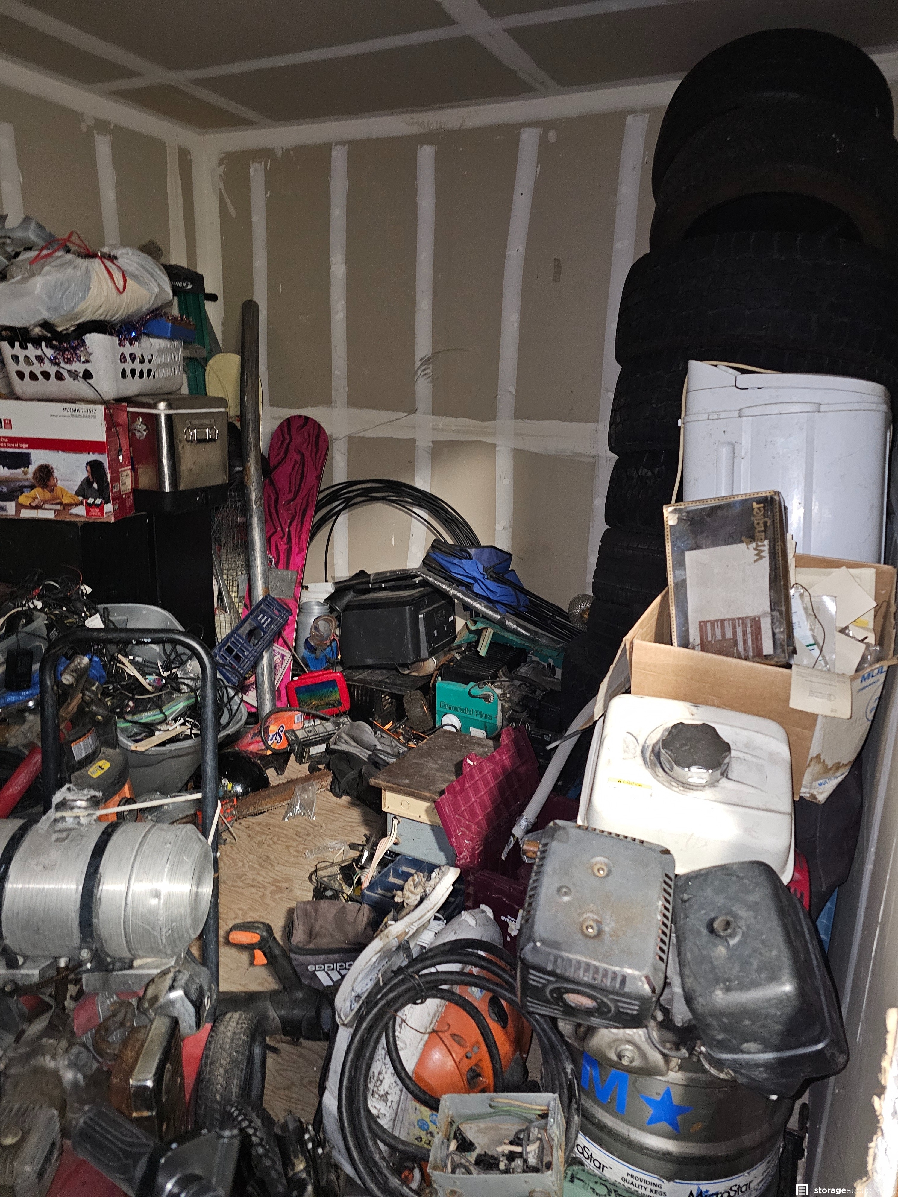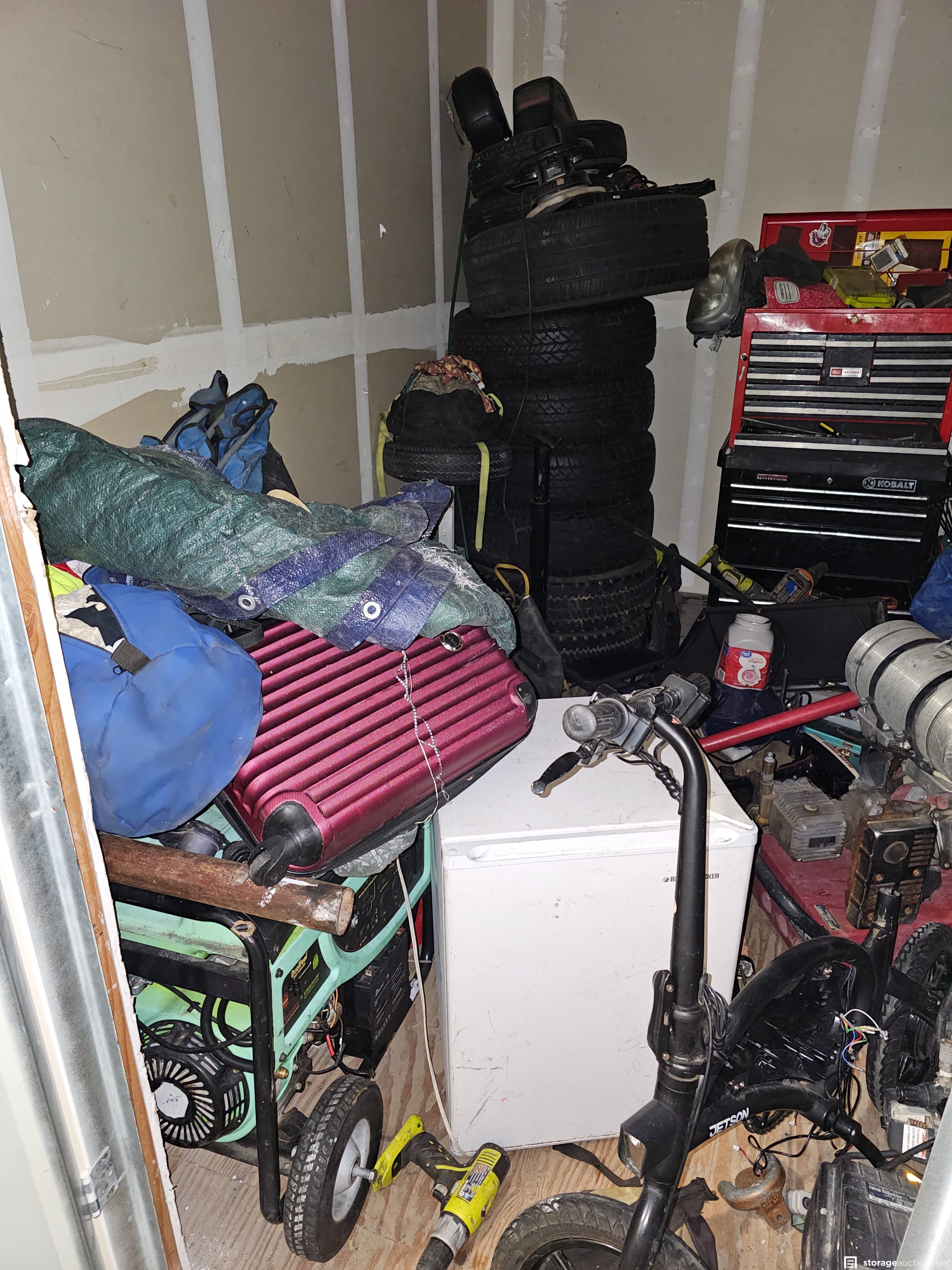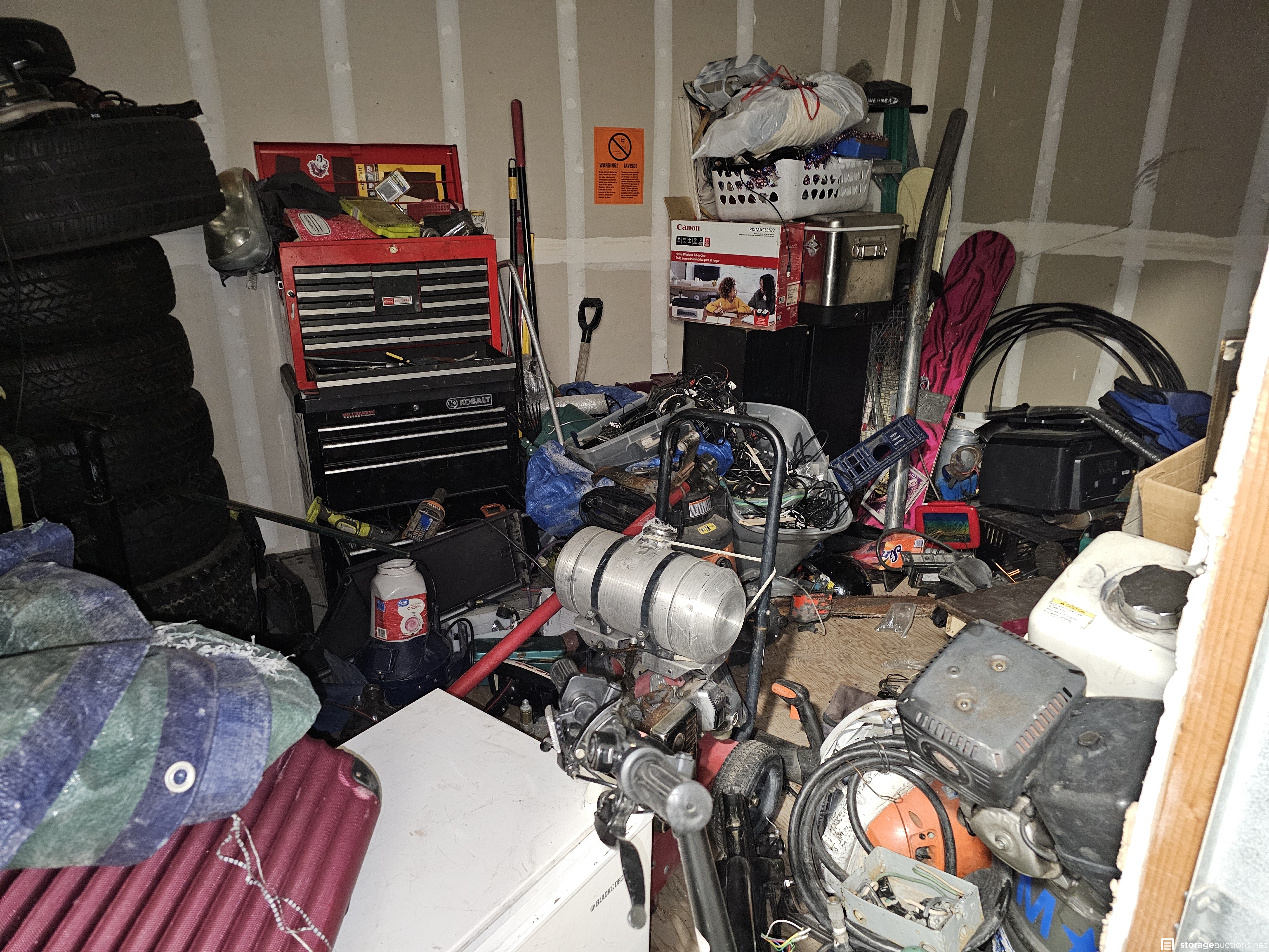 This upstairs unit appears to contain: Tools, Toolbox, Compressor, Tires, and other items.