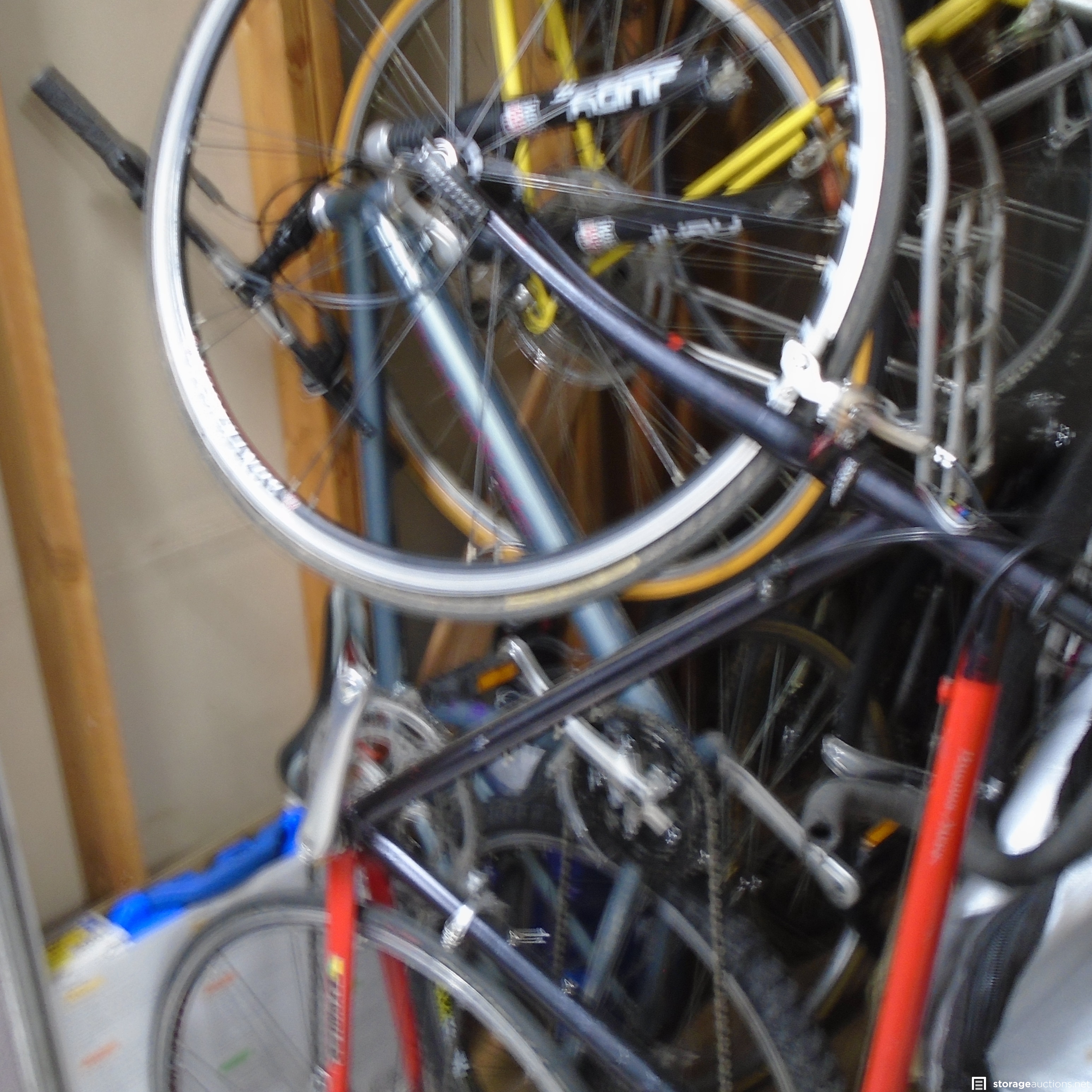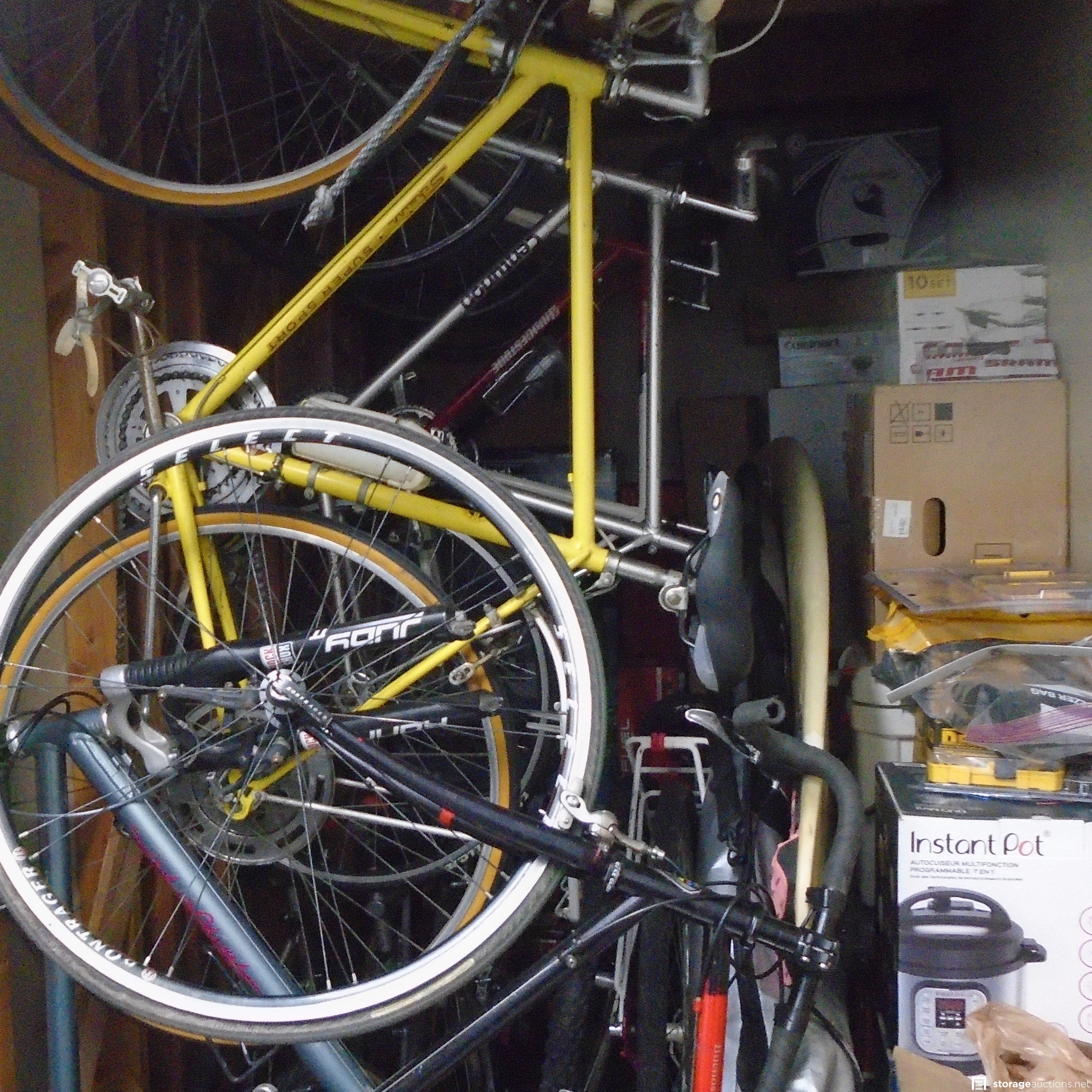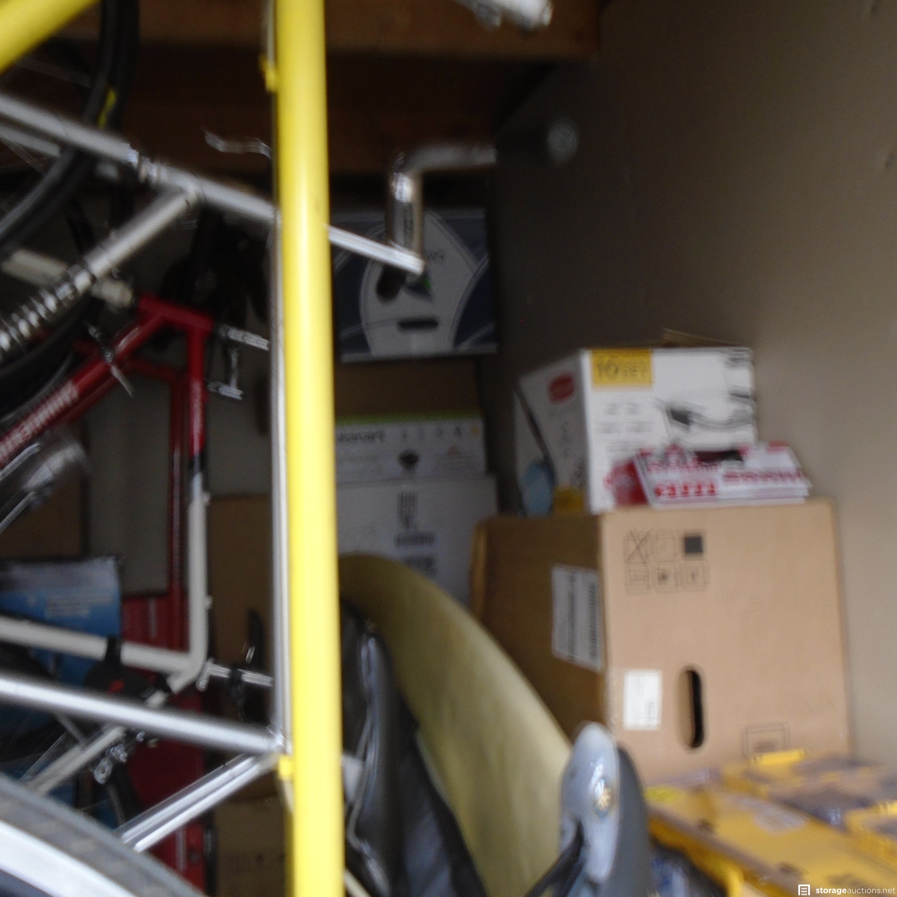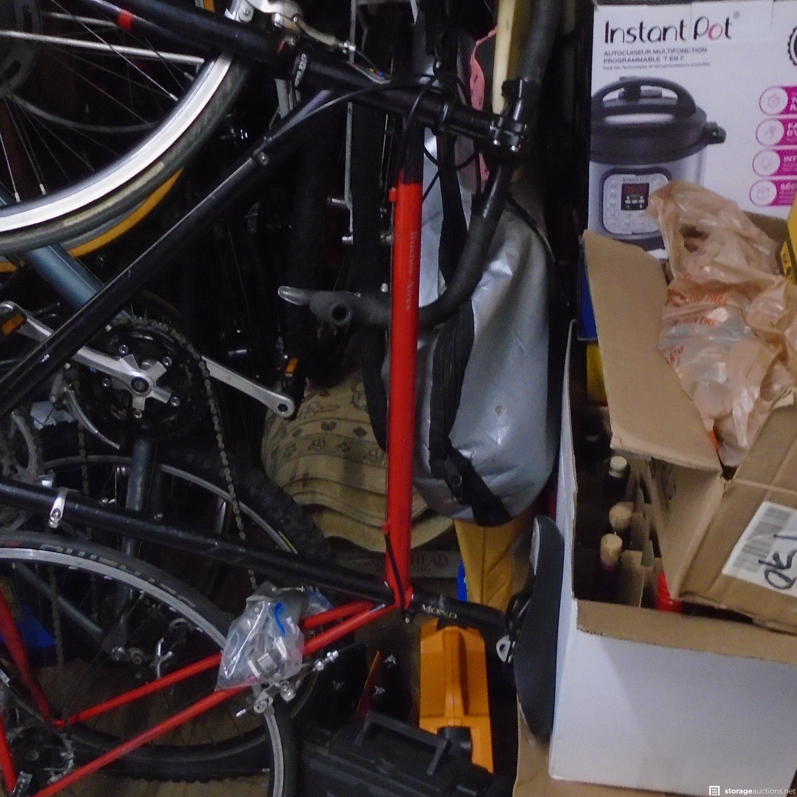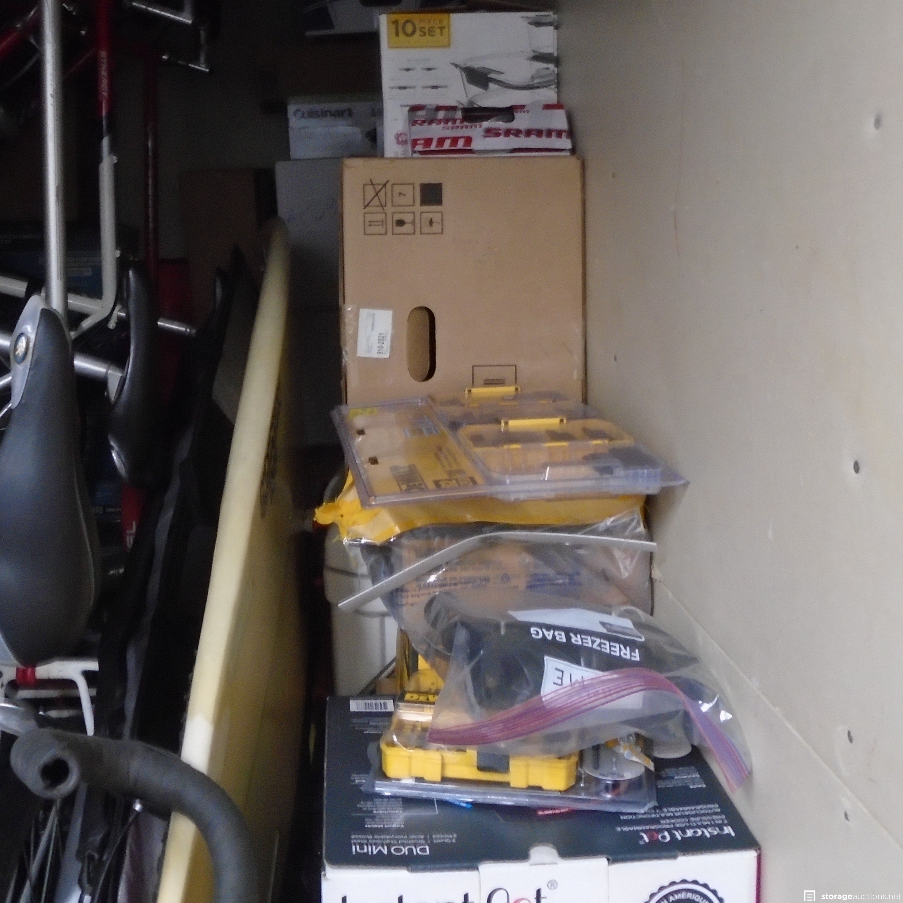 Unit appears to have: Power Tools, Hand tools, Tool Box, Several Bicycles, and surfboards. small kitchen appliances, and boxes.