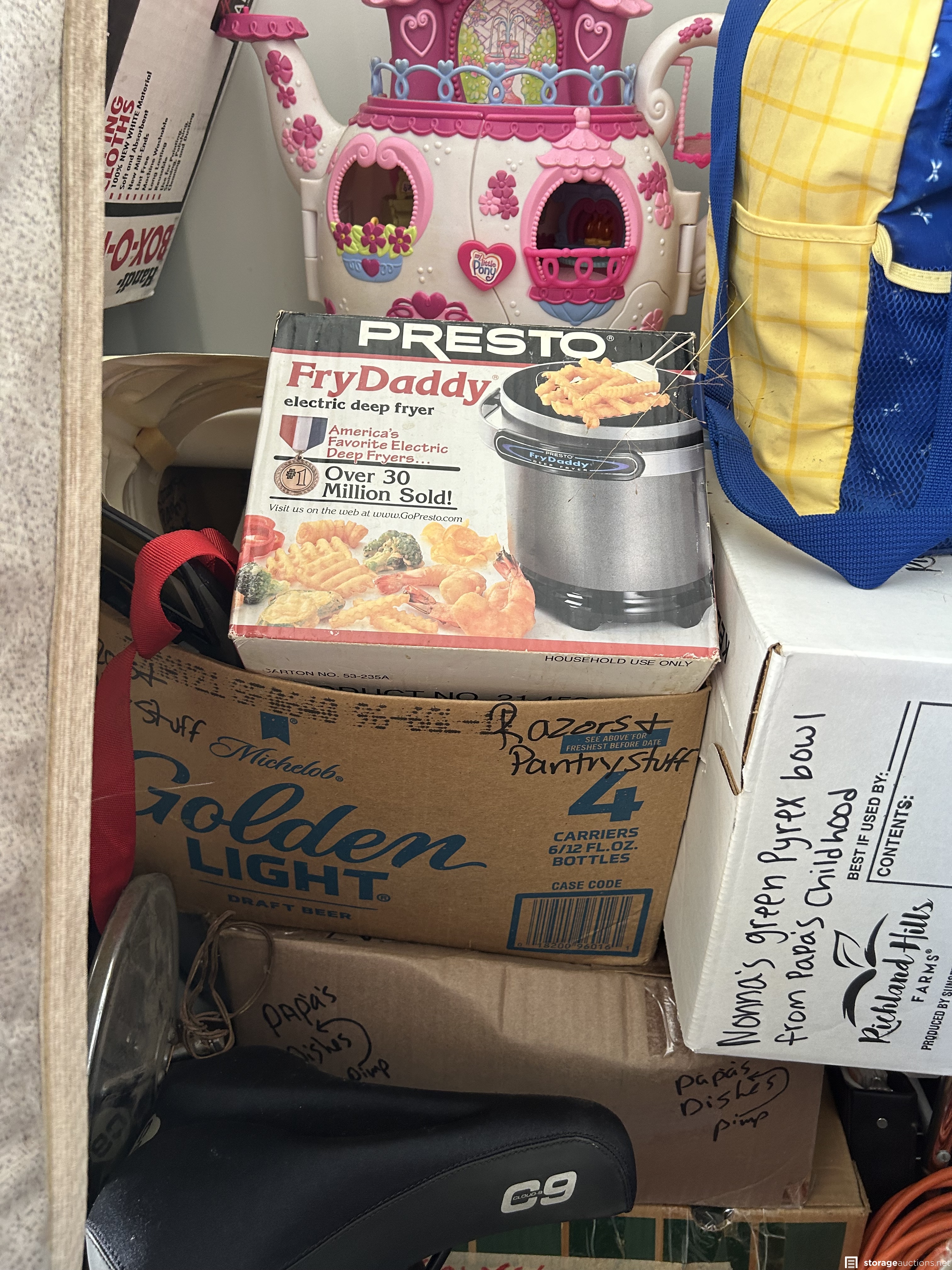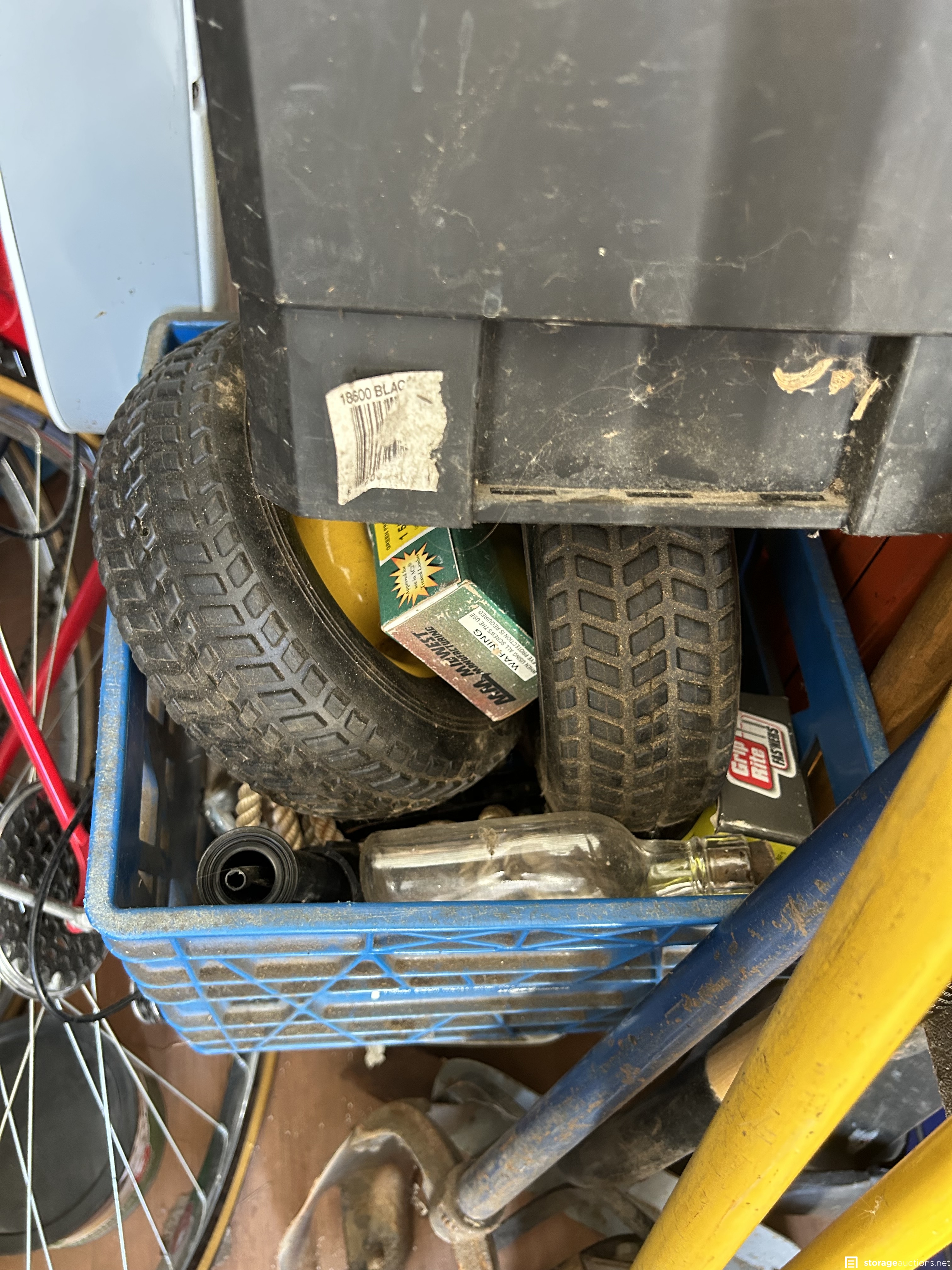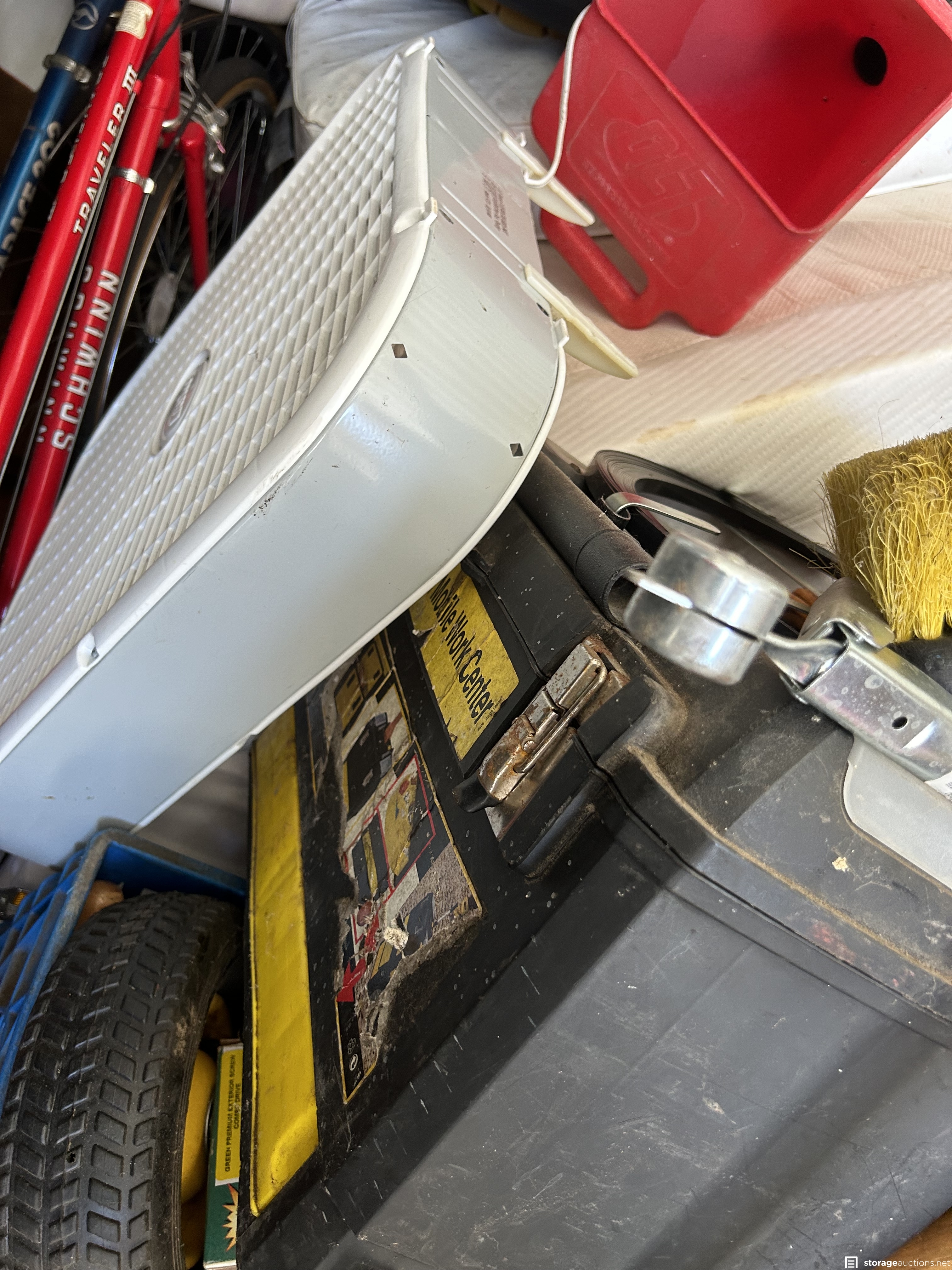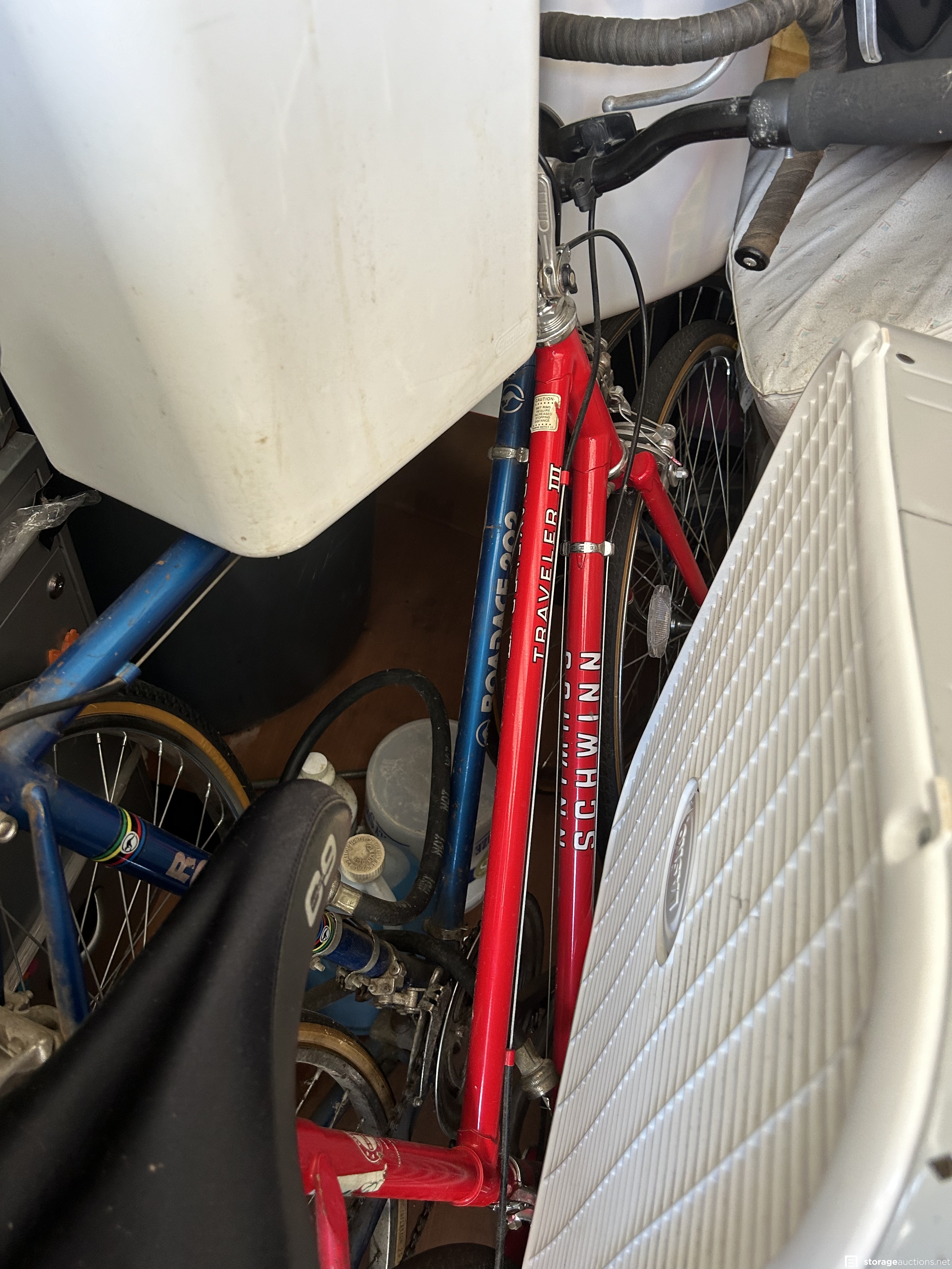 Schwinn bicycle, Roadrace bicycle, bicycle, wire shelf, pet crate, tool boxes, dresser, hole digger, folding table, dollie, kitchen items, extension cords, sleeping bags, much more