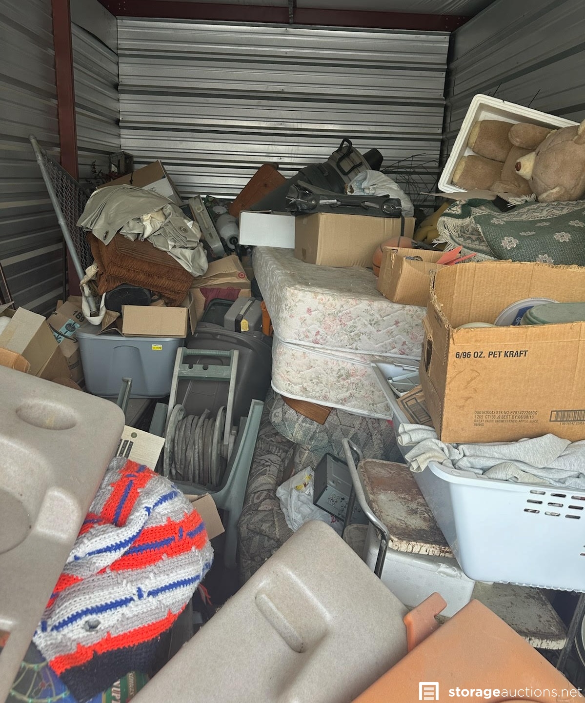 THIS UNIT IS FULL - TV, QUEEN SIZE MATTRESSES, DRESSER, METAL CABINET, METAL CART, KITCHEN TABLE, CHILDRENS PLAYHOUSE, COUCH, ALBUMS, AND LOTS OF BOXES AND TOTES