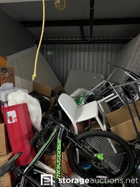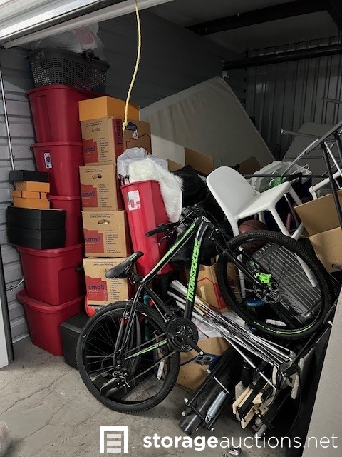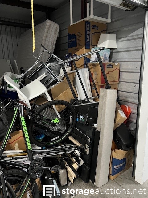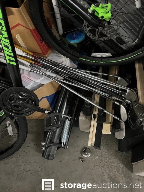 Unit appears to have many tots and a bike a flat screen tv, golf clubs, many odds and ends