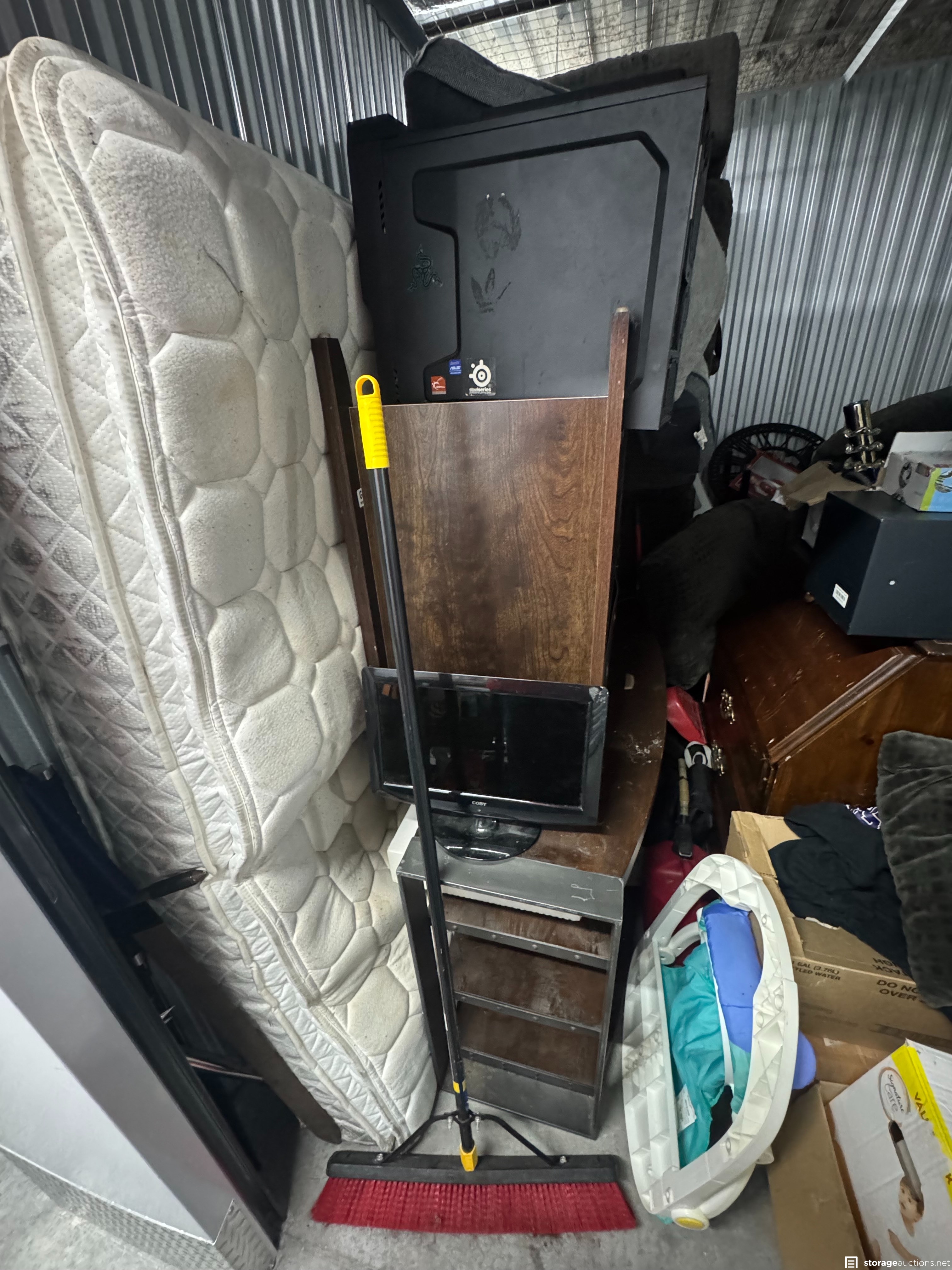 Appears to be propane grill, 2 bed frames, totes, boxes, cooler, pet carrier, iron gym, wall clock, pillows, tent, couch, mattress, push broom, tv stand, monitor, electric fire place, clothes
