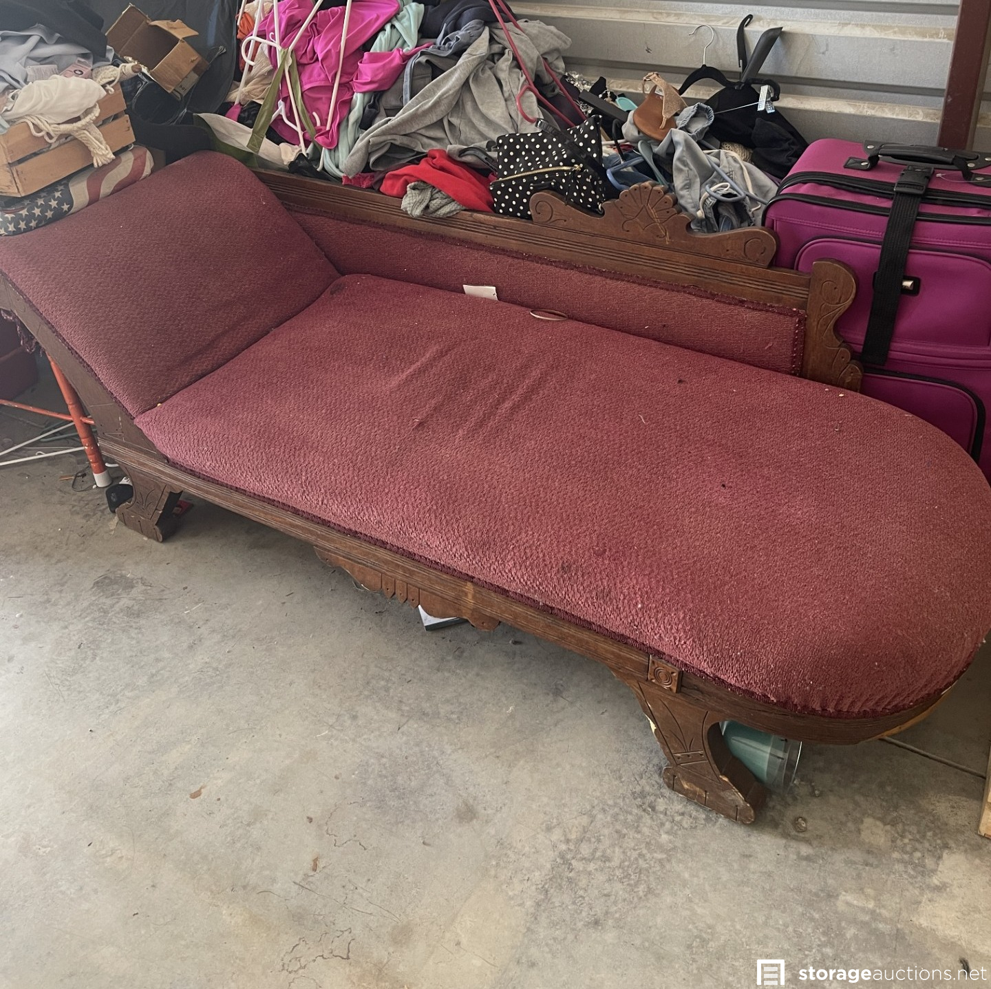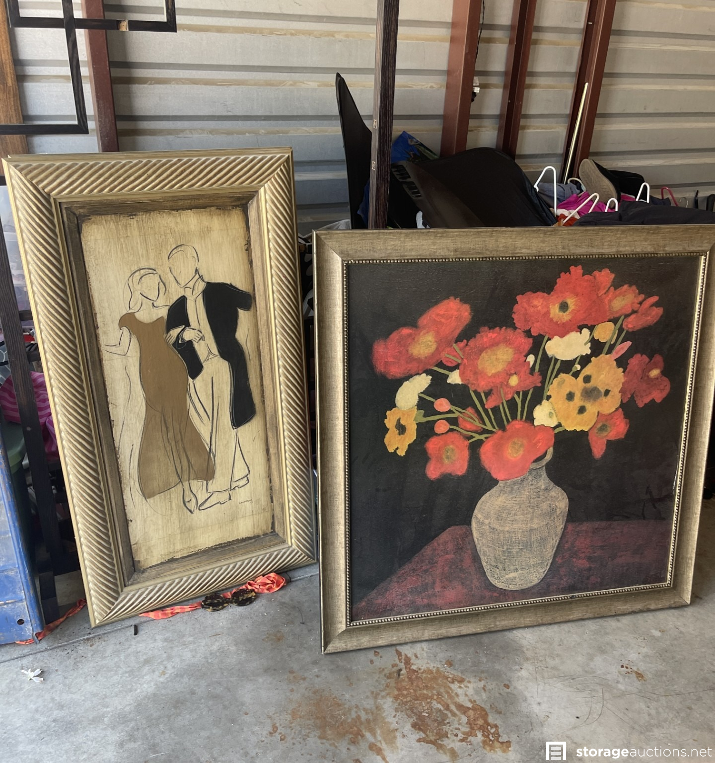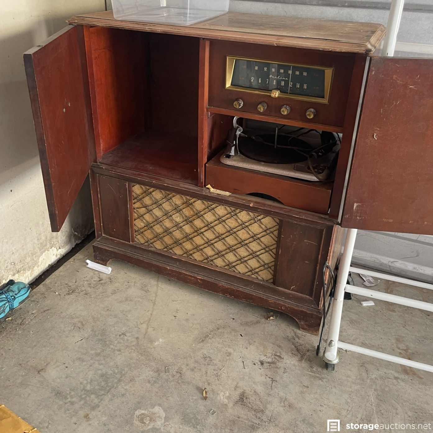 antique record player, antique lounge chair, framed wall art and decor, lamps/lighting, trampoline net, and various luggage & clothing.