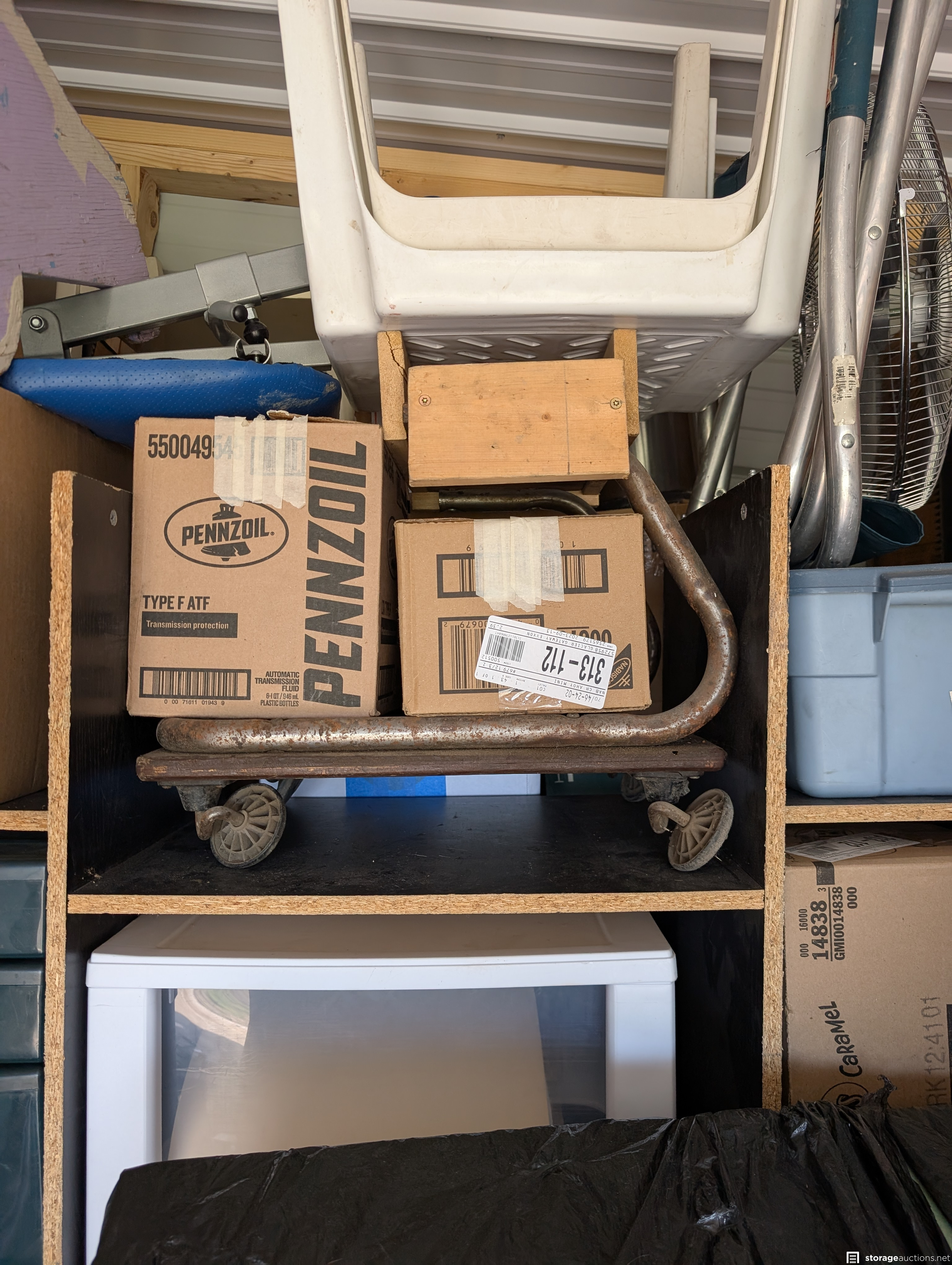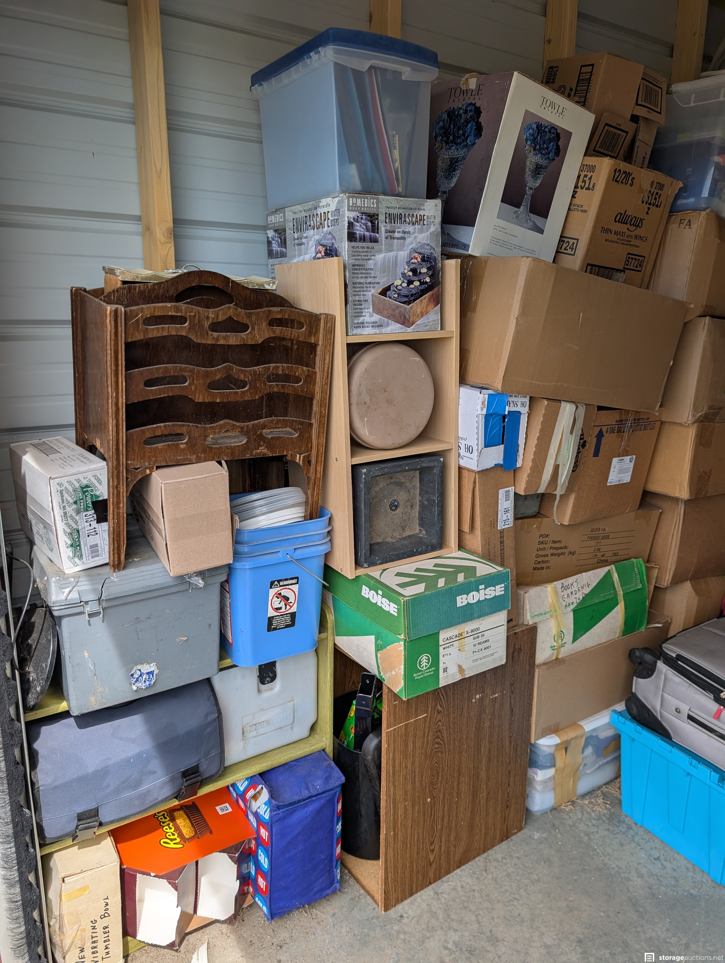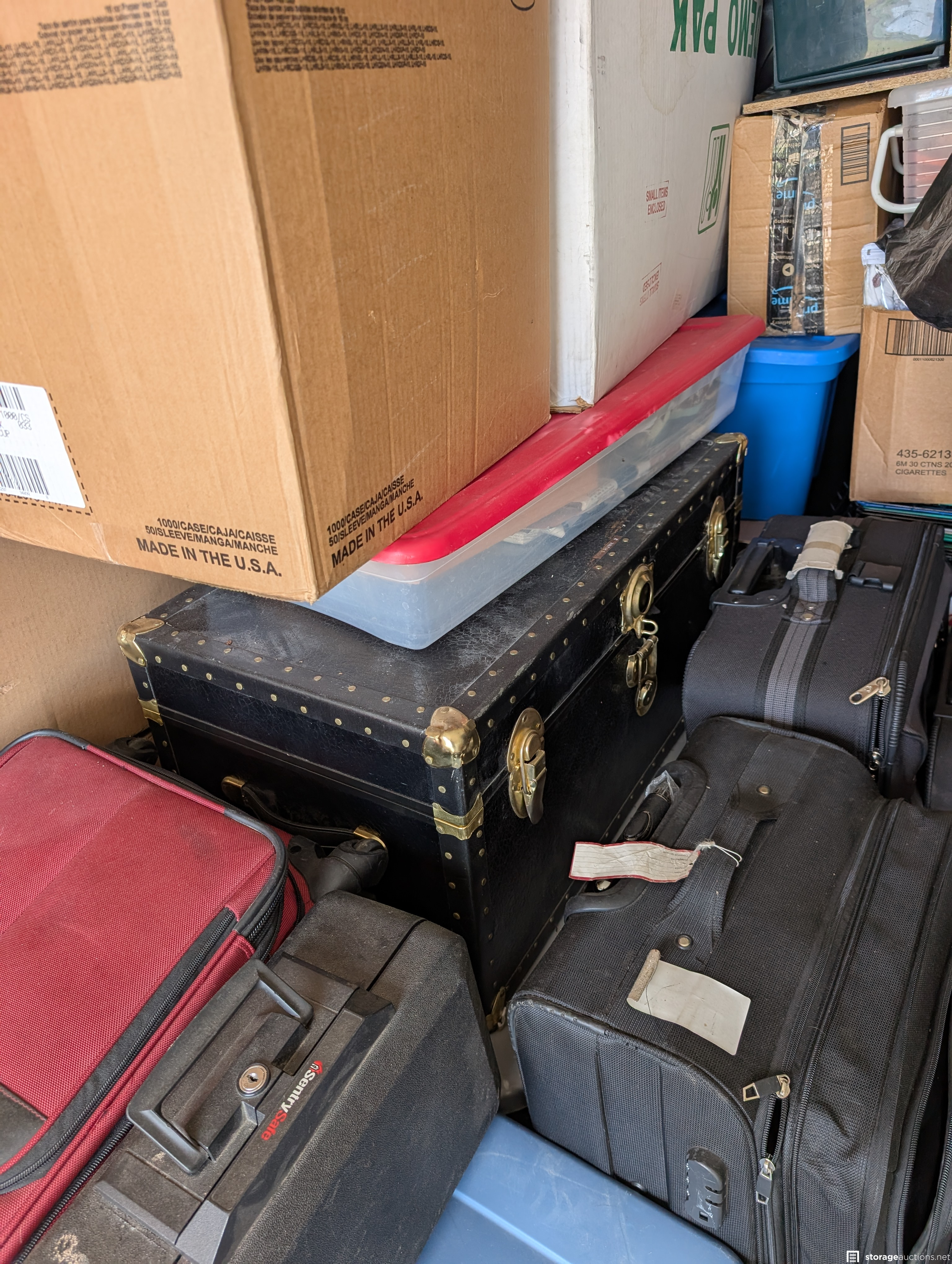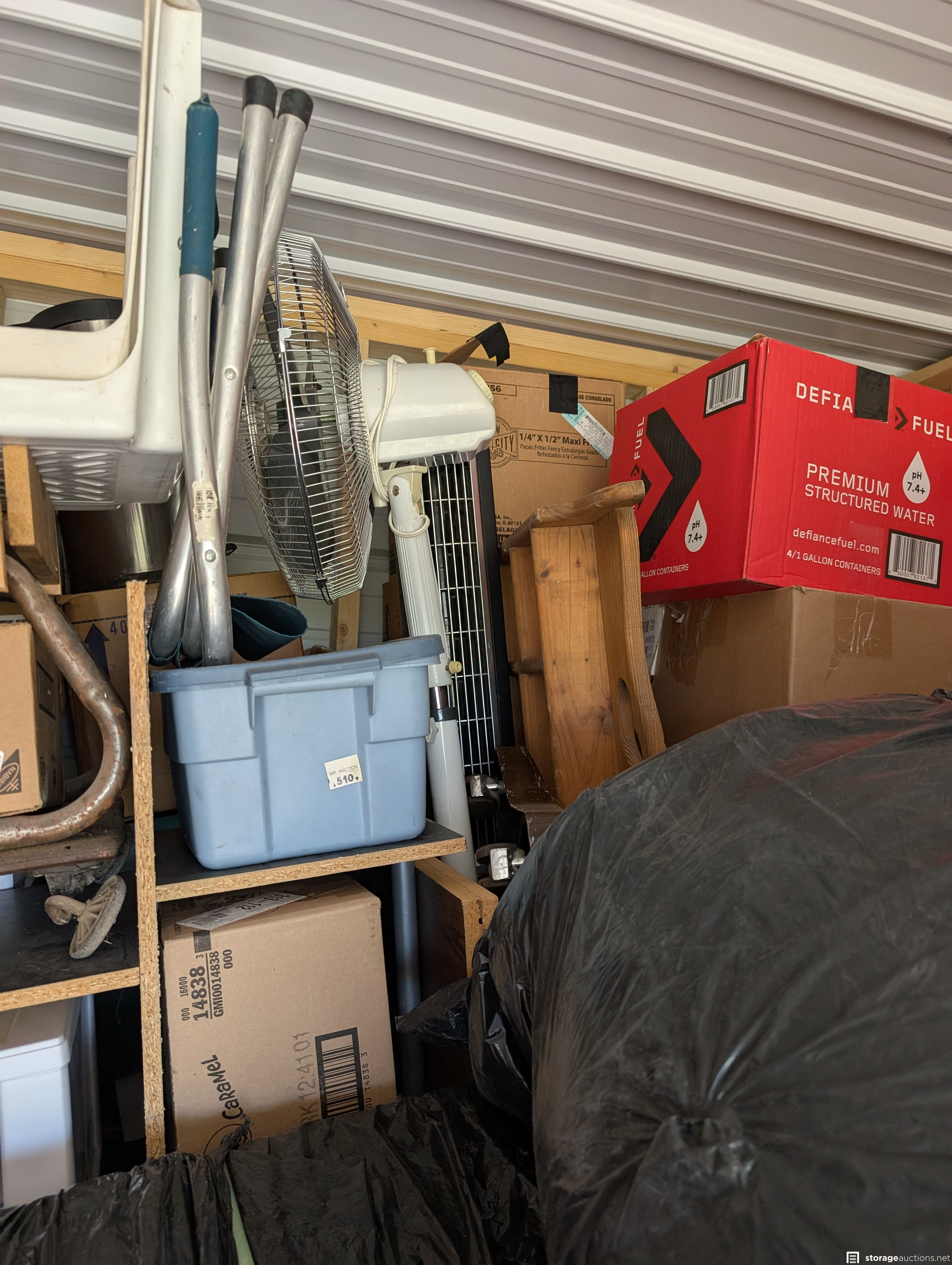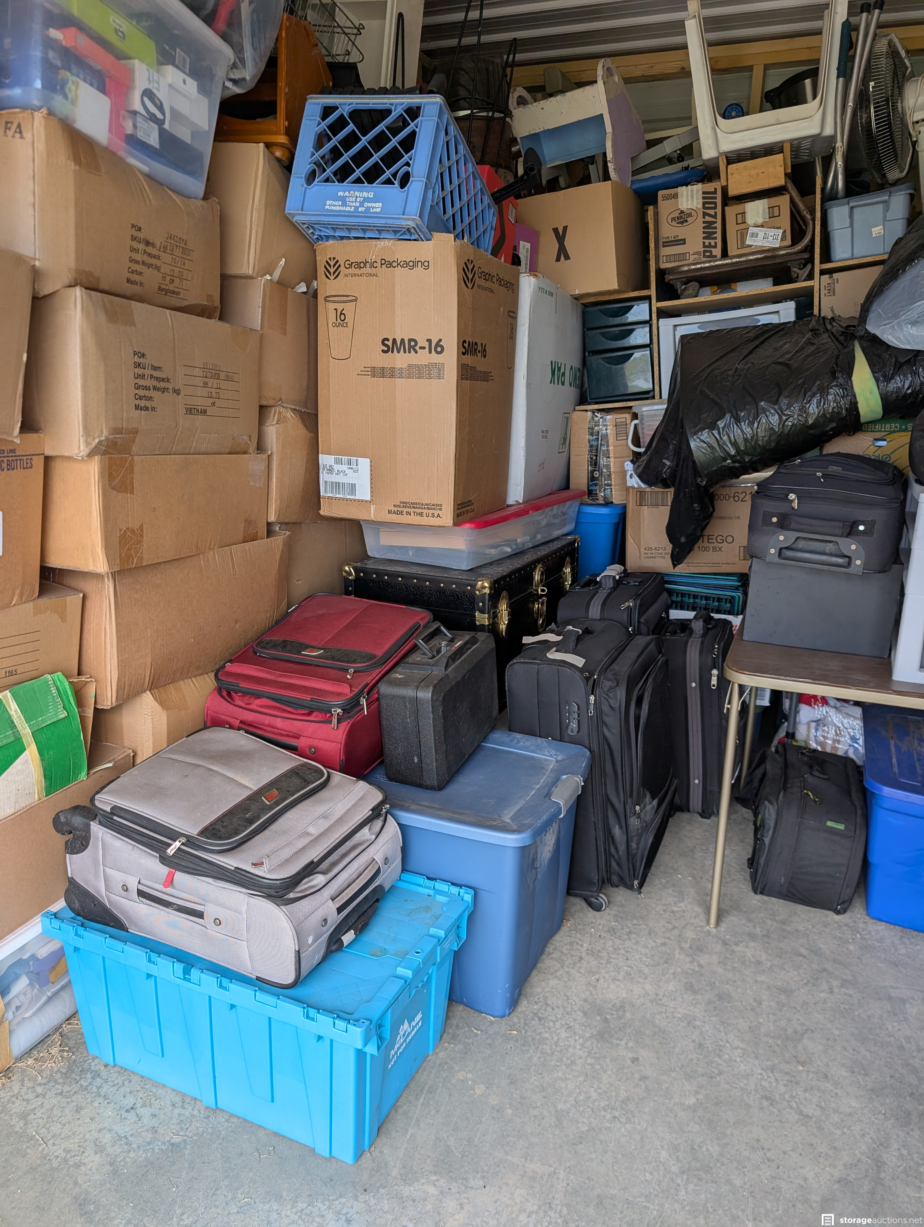 Suitcases, boxes, step stools, safe box, fan
