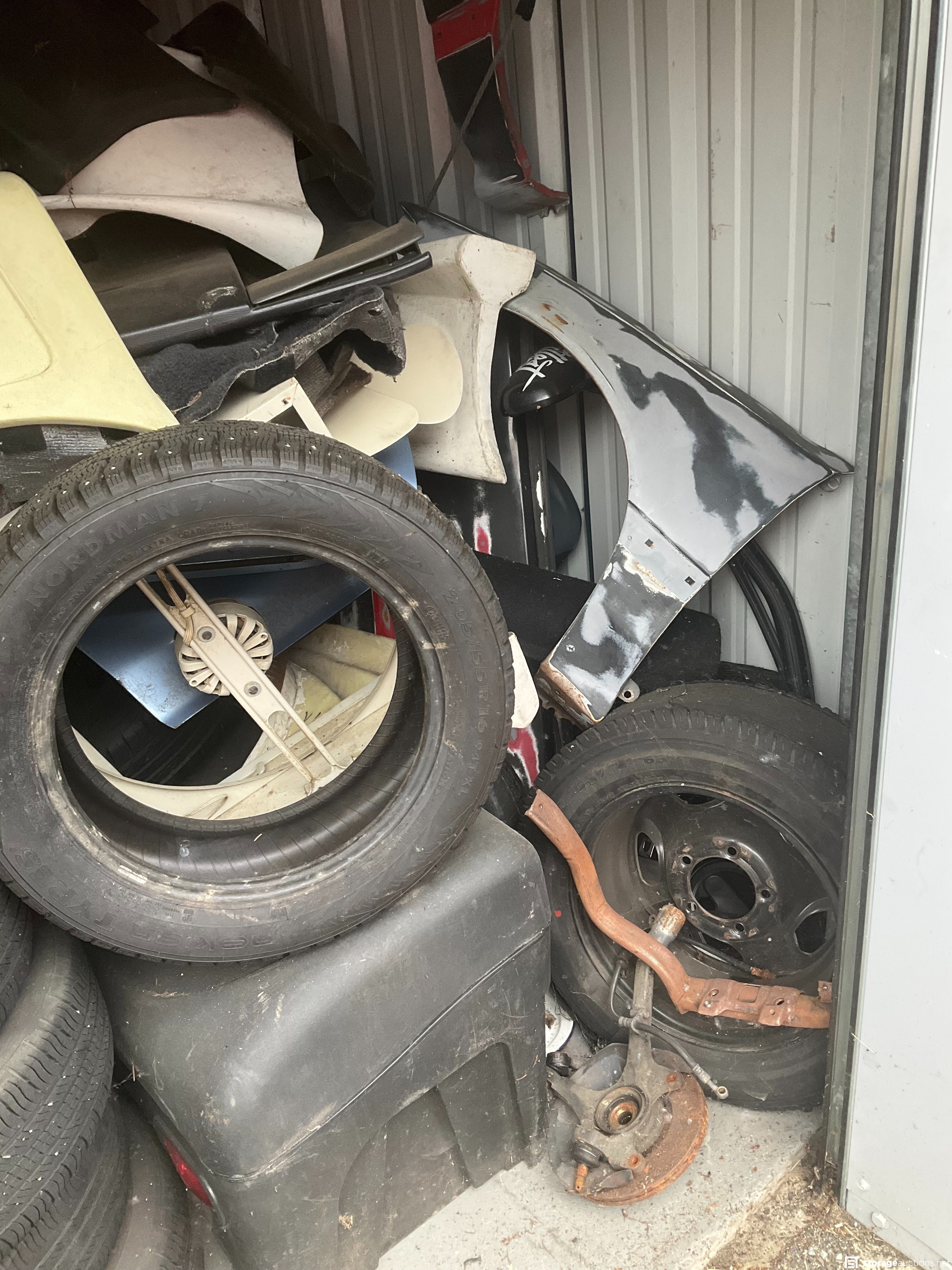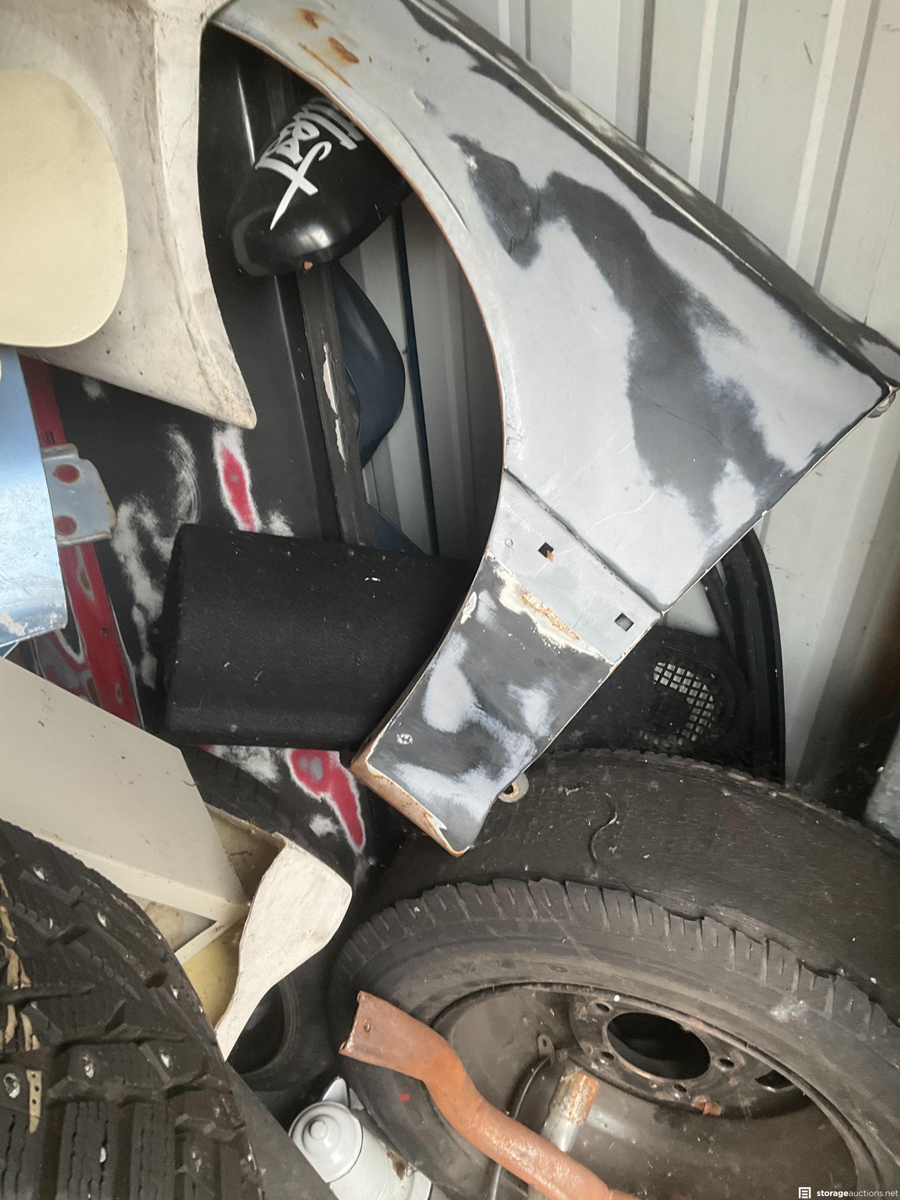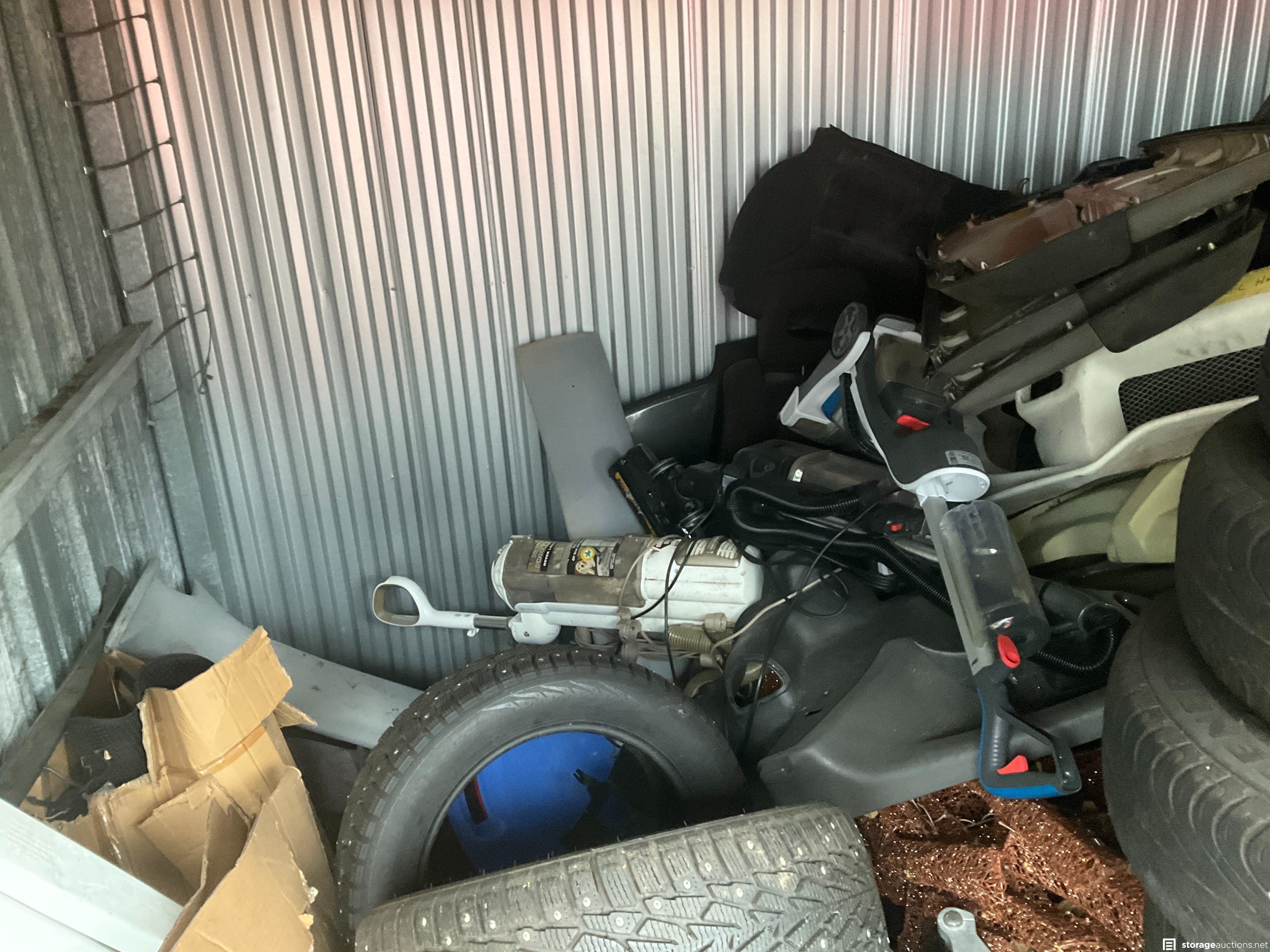 Lots of wheels and tires, some with pins, in great condition! Autobody parts, some tools, vacuums, subwoofers, and boxes--who knows what more is inside!