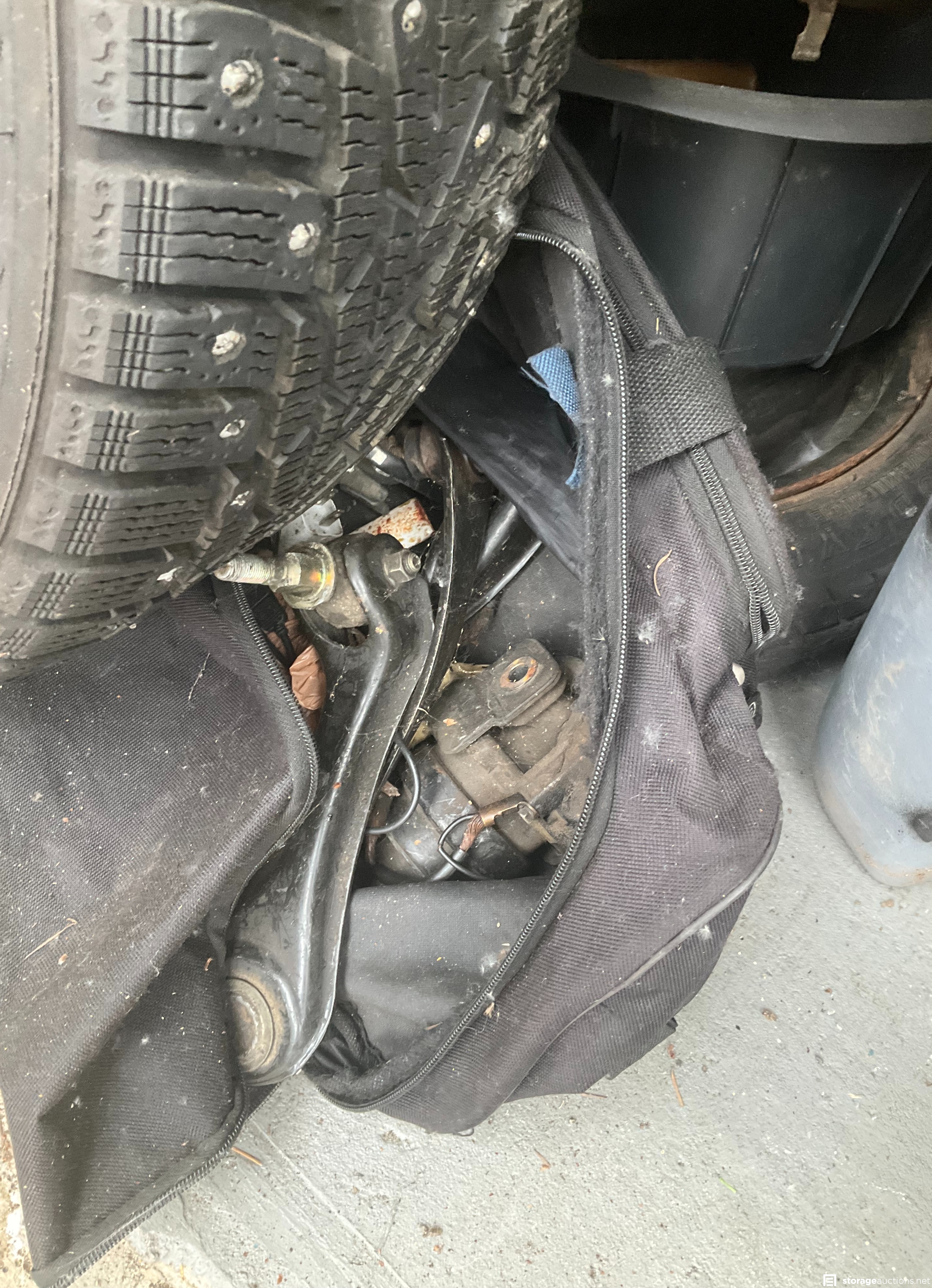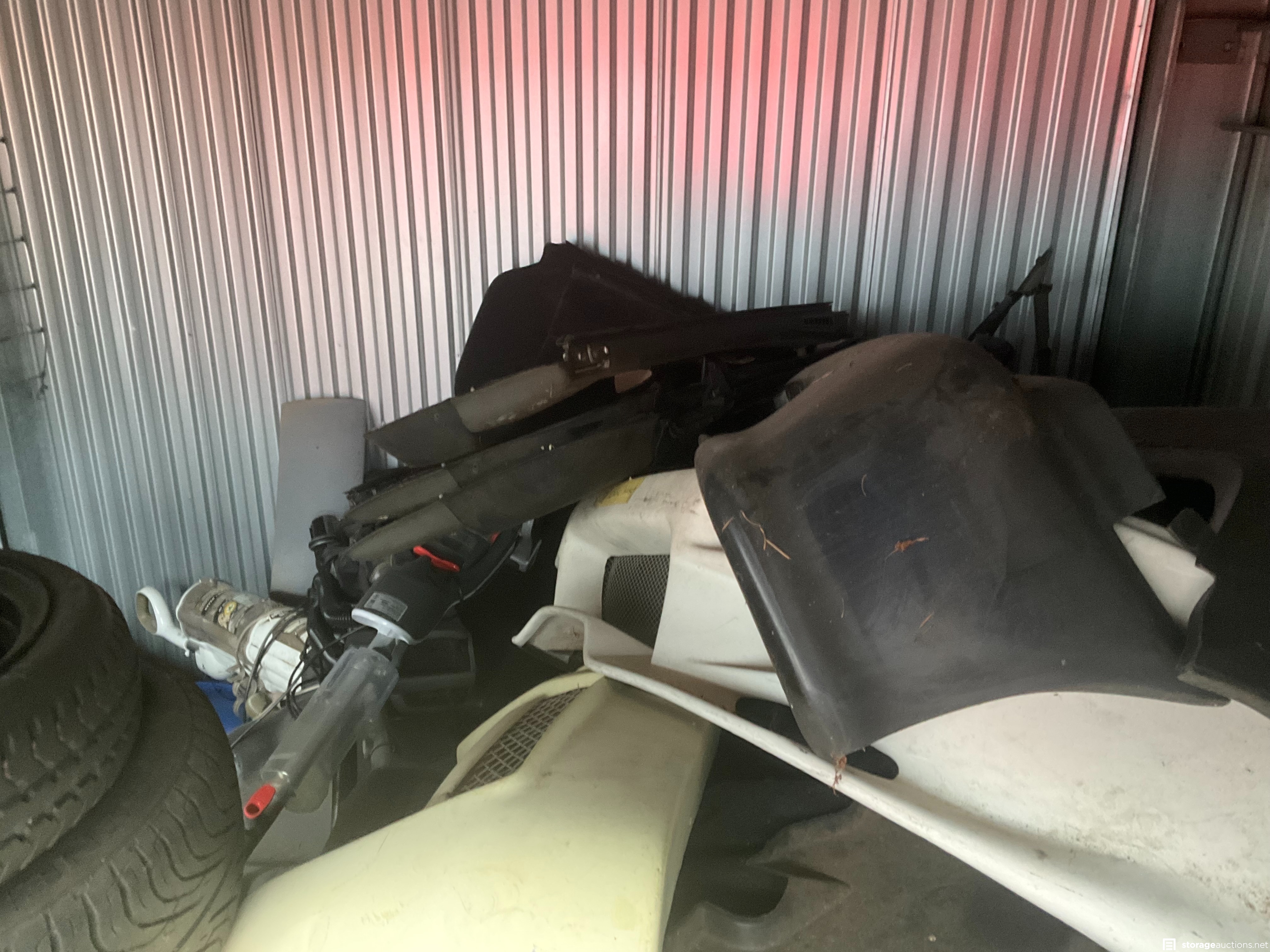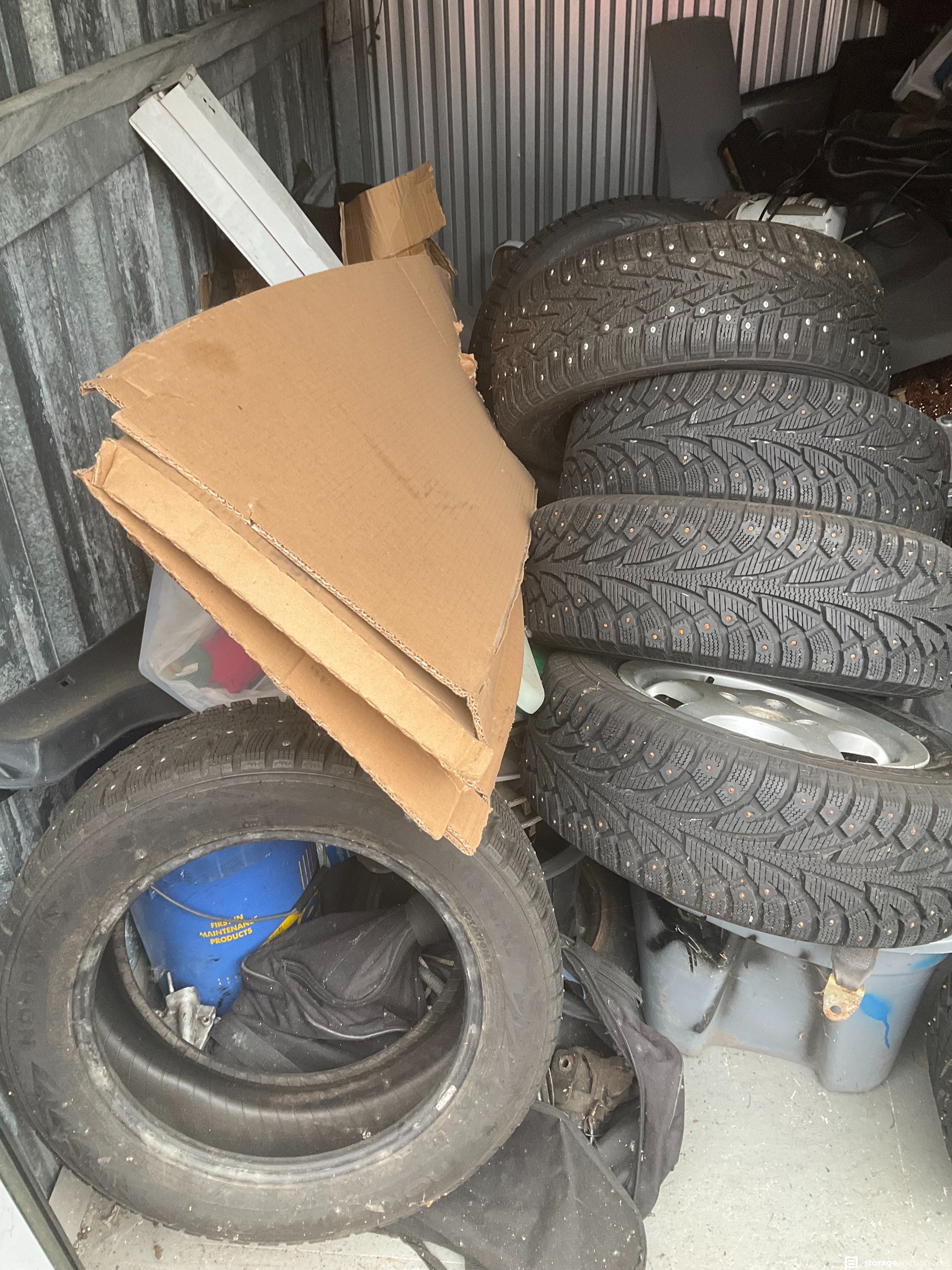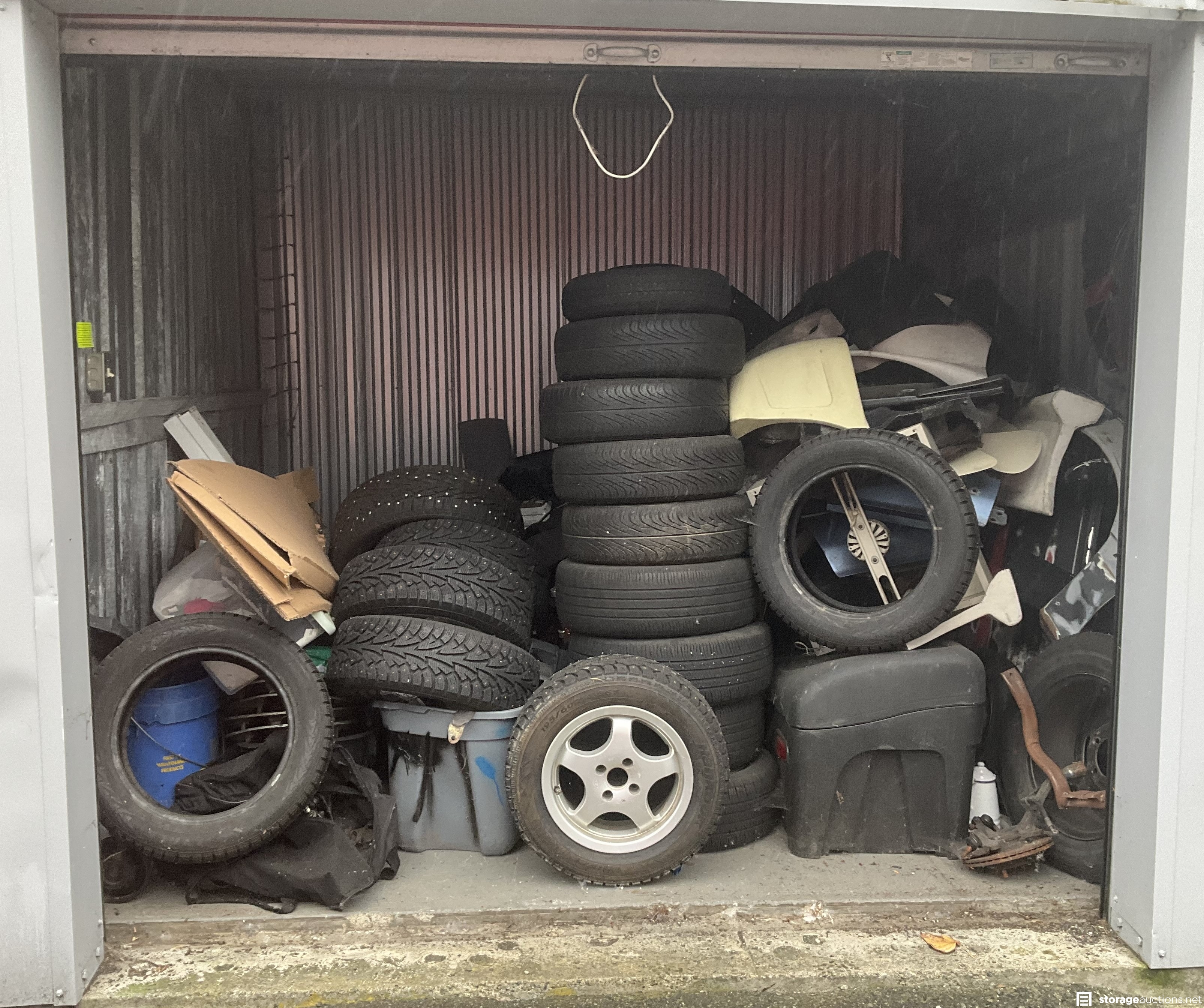 Lots of wheels and tires, some with pins, in great condition! Autobody parts, some tools, vacuums, subwoofers, and boxes--who knows what more is inside!