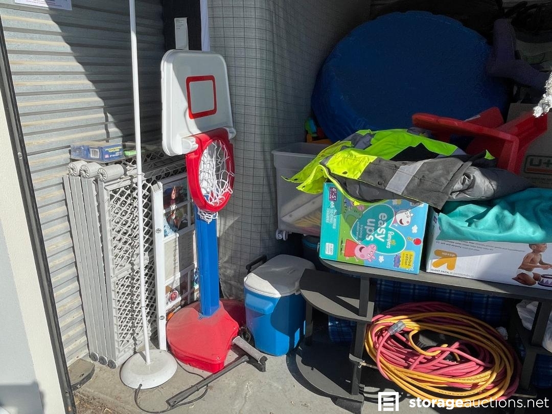 MATTRESS SET, COOLER, STEP LADDER, BABY GATE, KID'S BASKETBALL HOOP, LAMP, NINJA AIR FRYER, TV STAND, DROP CORDS, STROLLER, FISHING POLES, MISC BOXES, TOTES, BAGS, ITEMS