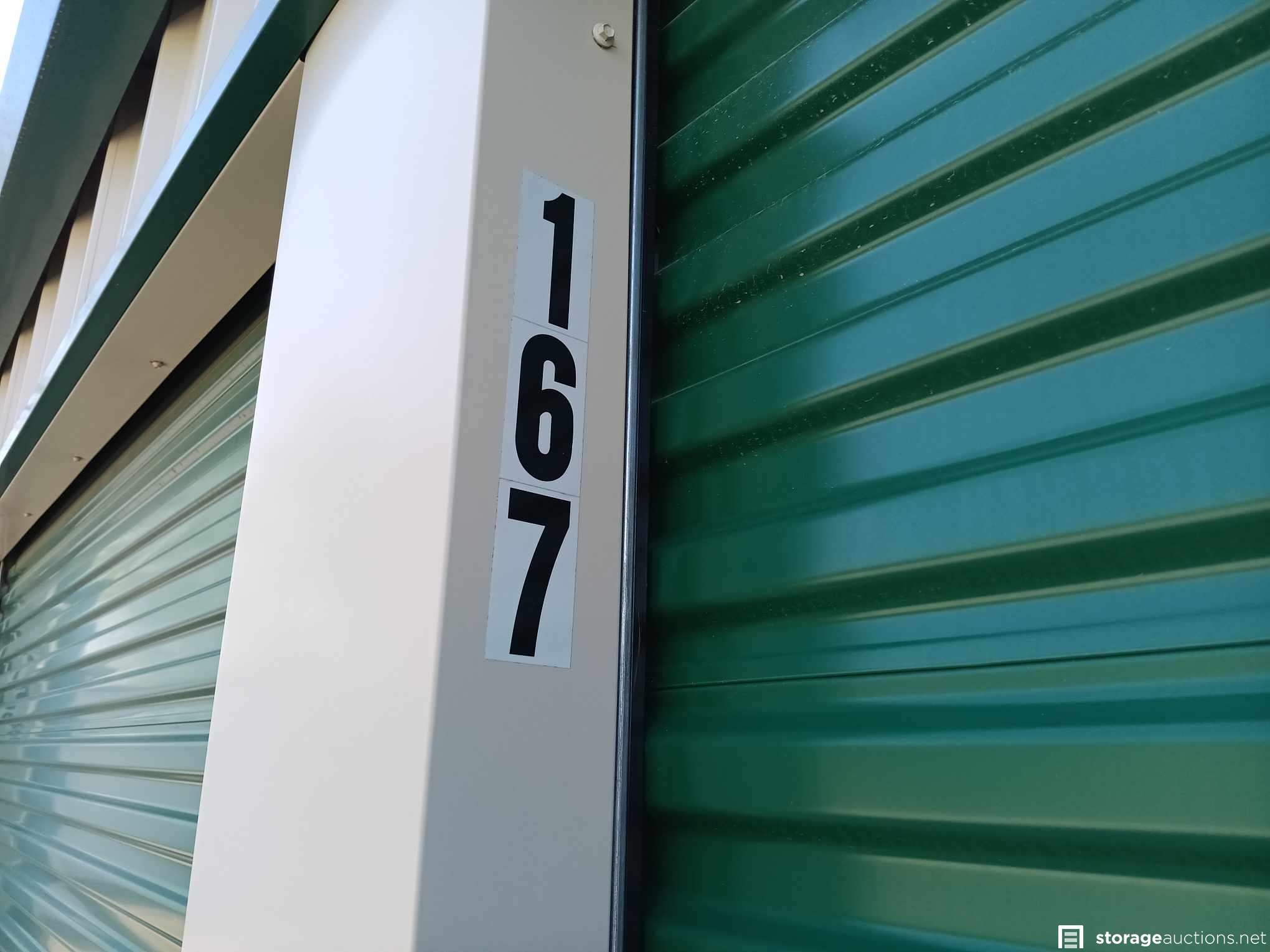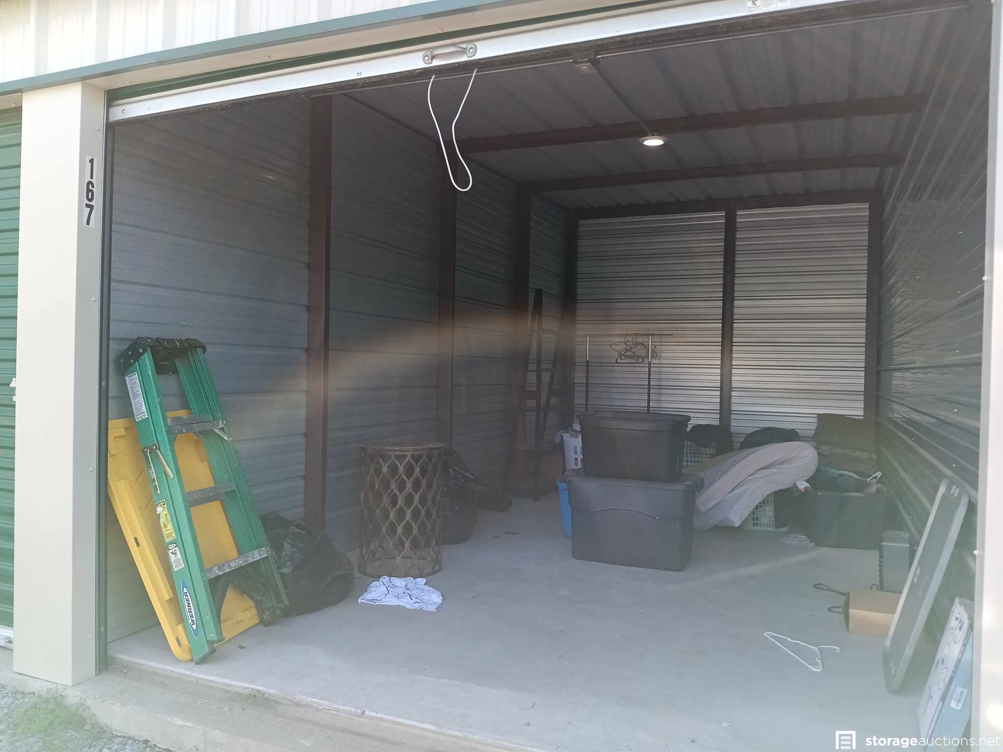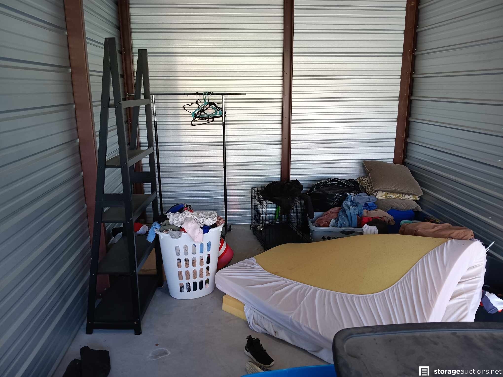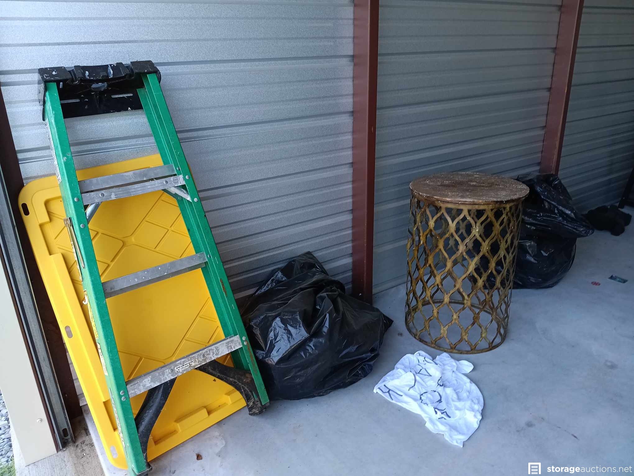 Unit appears to contain ladder, totes, clothes, cage, shelf, heater, etc.